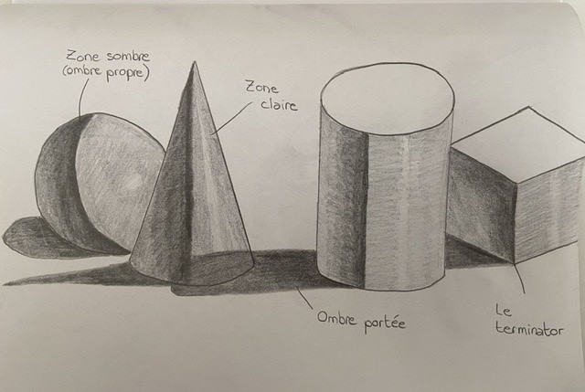 Bonjour je ne sais pas si c’est bon voici ce que ça donné avec ma lampe l’ombre portée avec mon pot de crayons et les crayons je ne pouvais pas voir l'ombre projetée car ils étaient beige et blanc donc je l’ai fait par moi même est ce que c’est bon et le terminator ou je le met ds un dessin comme celui ci moi je lai mis juste avant le premier crayon ds l’ombre j’aimerais avoir votre avis