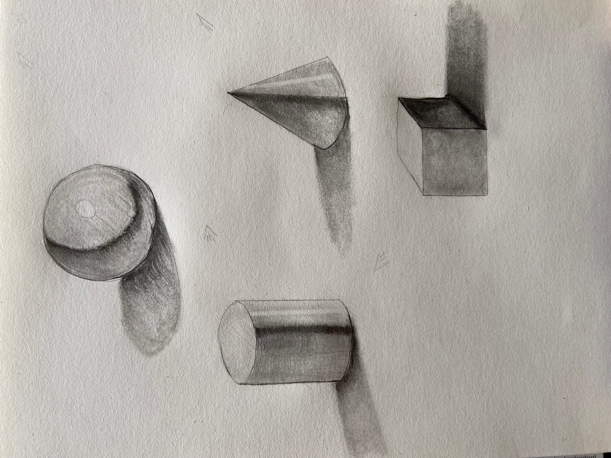 voici mon essai sur les ombres, La lumiere vient de la droite pour les 3 premiers et de la gauche pour le cube.