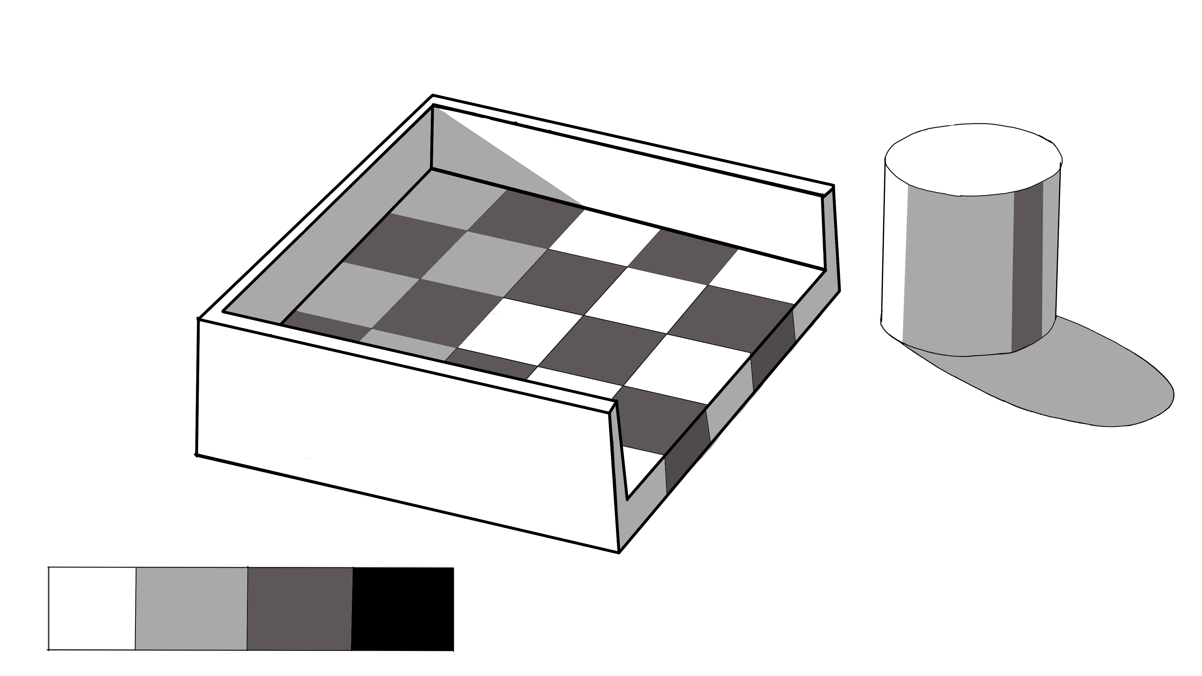 Hallo Urbantuner89, Sie haben das Prinzip des Übung Bravo verstanden, Sie hätten dem Schachbrett einen Schatten auf den Boden hinzufügen können;) und eine kleine Reflexion des Lichts im Schatten des Zylinders!