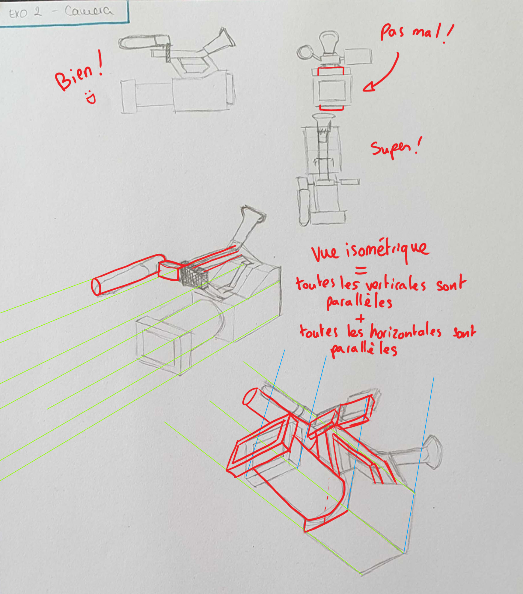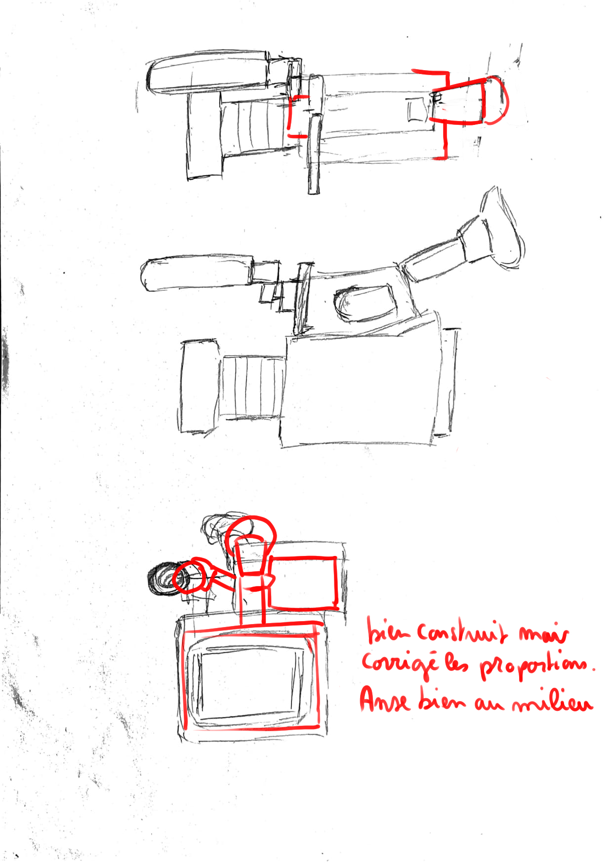 Bonjour AyaAyumi, tu as plutôt bien réussi l'exercice ! Tes proportions sont lutôt justes, et les différents éléments de la caméra sont bien positionnés. Là où tu as eu plus de mal je pense, c'est de bien positionner ta caméra dans les angles de 3/4. En gros, il faut bien que tous les éléments de ta caméra soient dans la même perspective, sinon on a cet effet tordu. Voilà ma correction dessinée pour plus de précisions :)