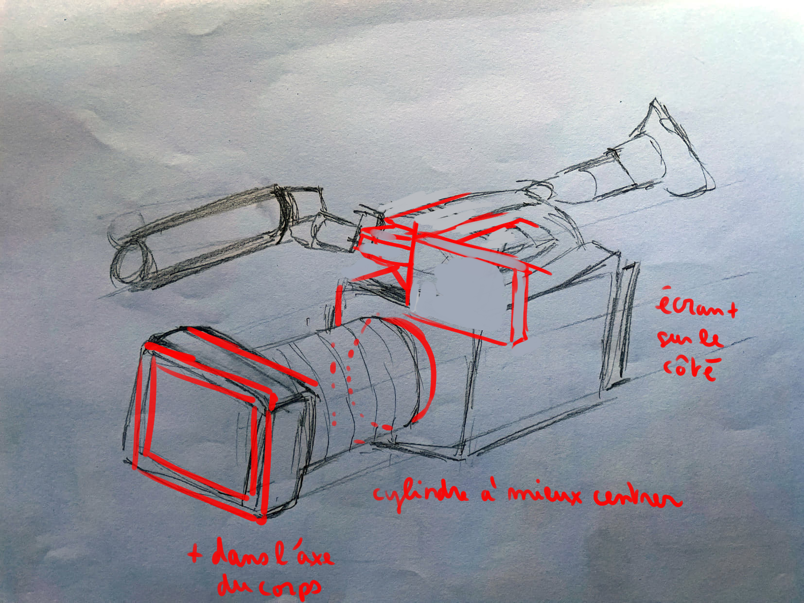 Là où tu as eu plus de mal je pense, c'est de bien positionner ta caméra dans les angles de 3/4. En gros, il faut bien que tous les éléments de ta caméra soient dans la même perspective, sinon on a cet effet tordu. Voilà ma correction dessinée pour plus de précisions :)