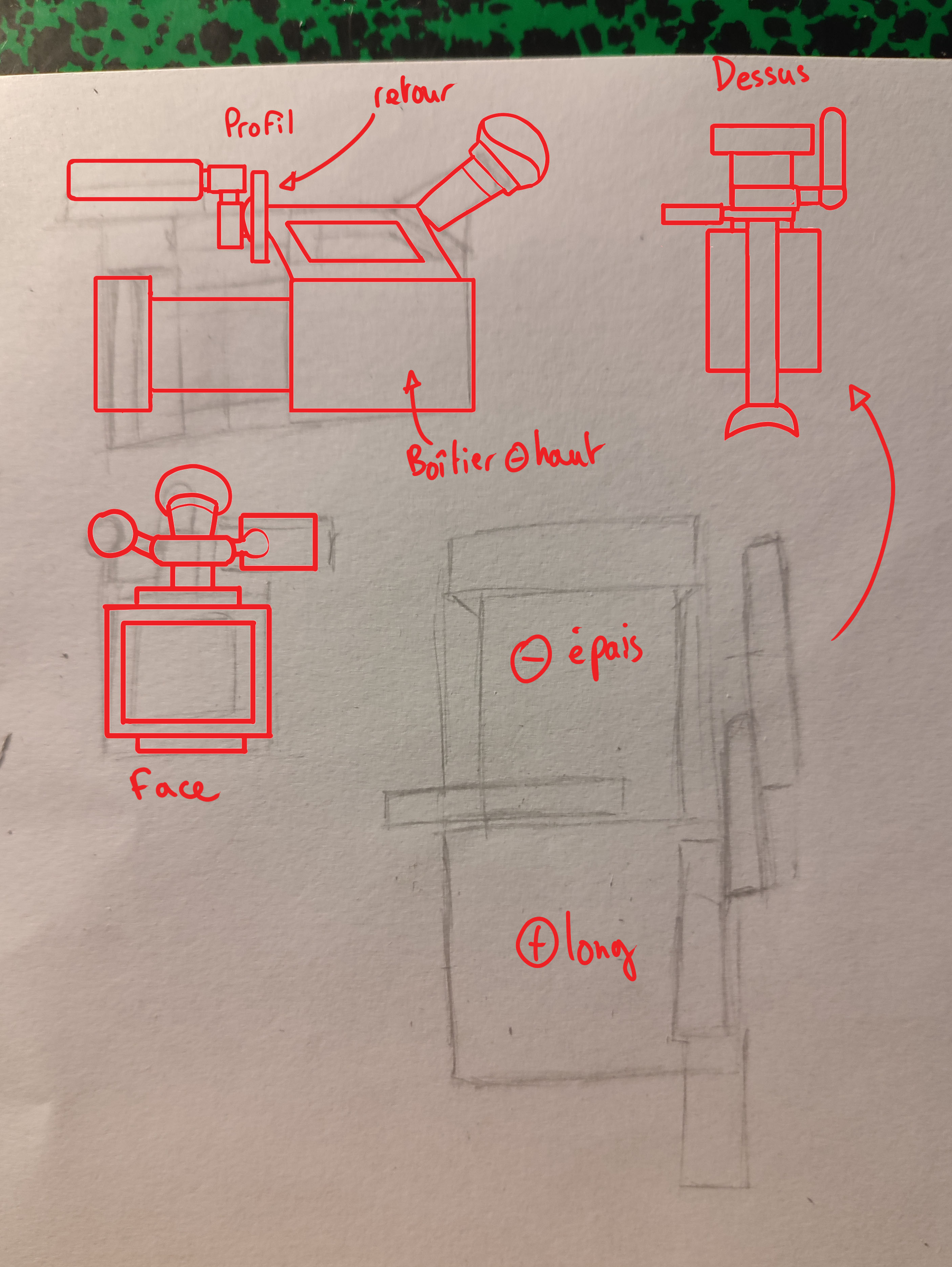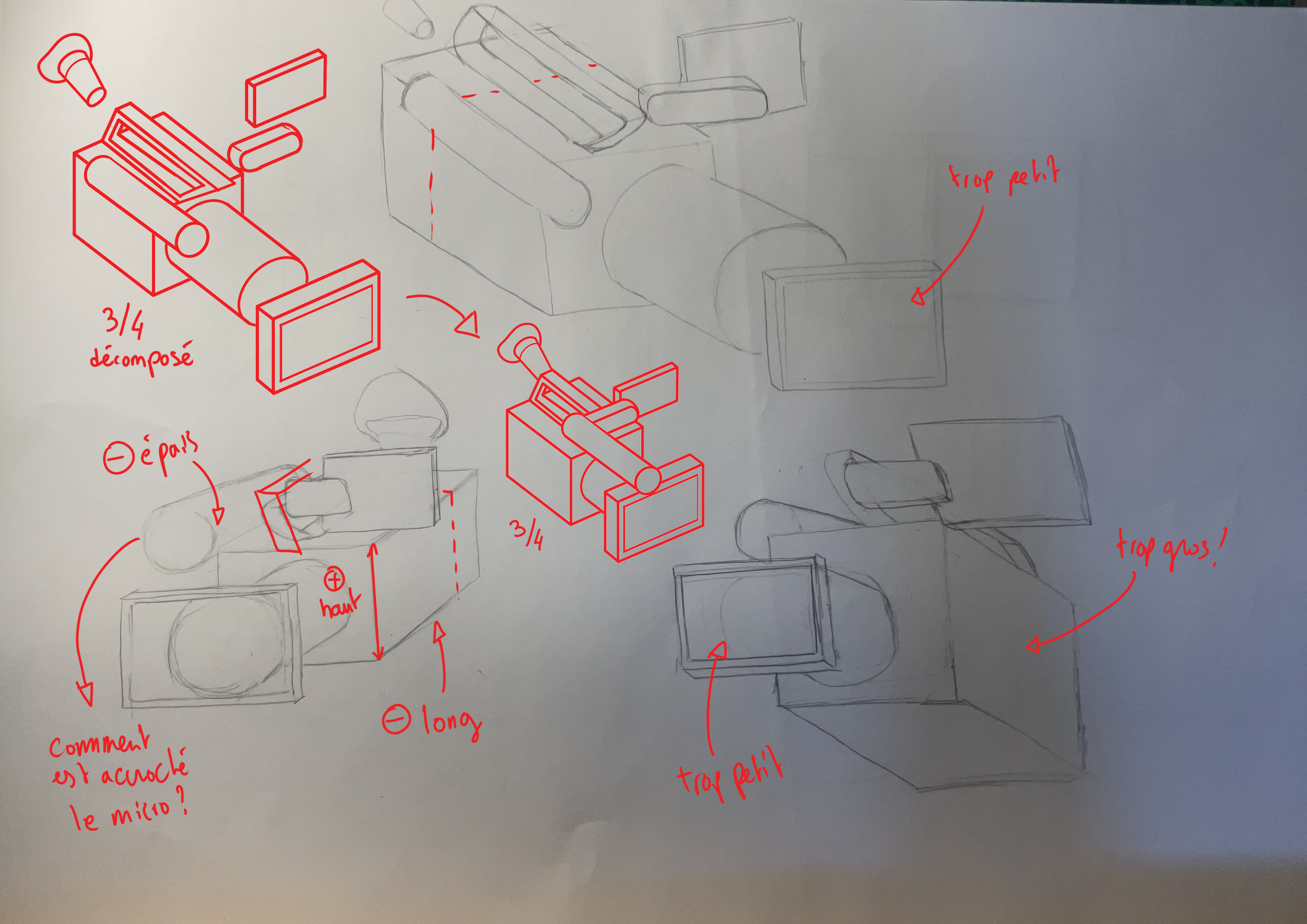 Bonjour Nathalie2313, c'est pas mal, le sujet est plutôt compliqué. Mais ton astuce du cube ne marche pas dans ton troisième dessin, car les proportions/taille du boîtier et de l'objectif ne sont pas les m^mes tout simplement ^^ (boîtier plus haut que l'objectif) Voici ma planche pour essayer de te montrer les bonnes proportions et placement des éléments (micro, oeil et retour)