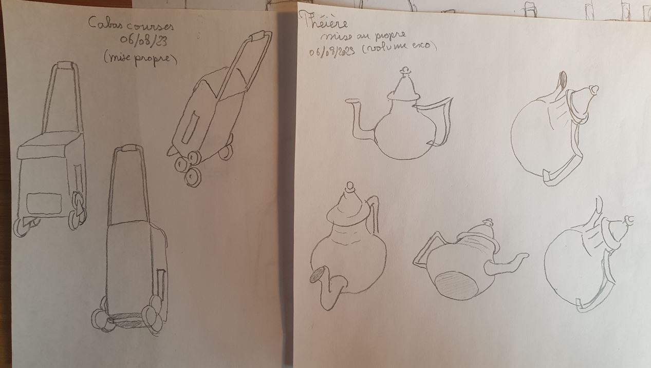 J'avais envie de partager le résultat qui, s'il n'est pas extraordinaire, représente pour moi un réel progrès 🙂. Ce sont des croquis mis au propre (par transparence) suite étude en vue 2D et nombreux essais en volume.