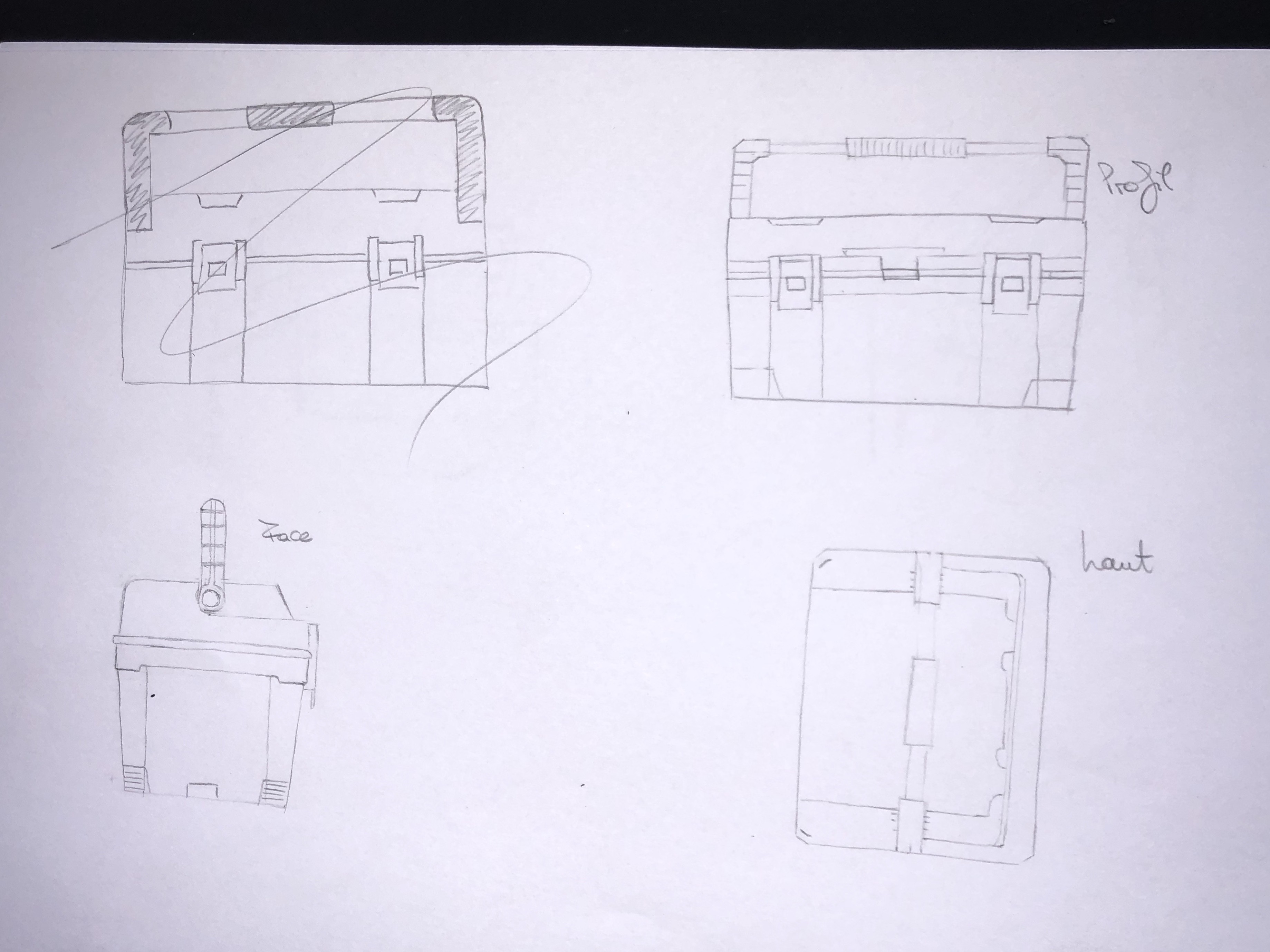 Voilà ma boîte à outils, j'ai commencé par des vues 2D et tenté la 3D. Les proportions largeur/longueur ne sont pas vraiment là 😇