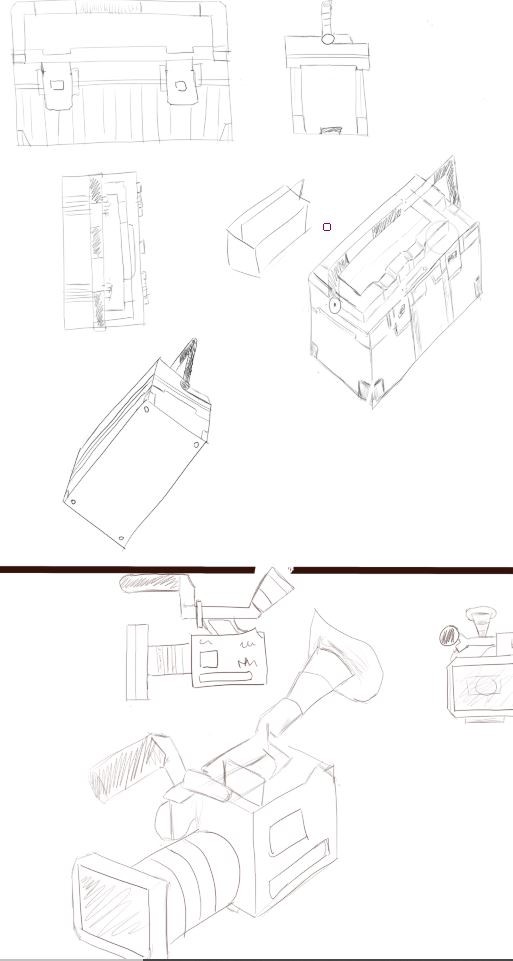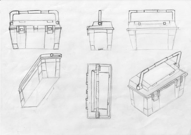 > Attention aux proportions, elles ont parfois tendance à bouger d'une vue à l'autre, c'est plus flagrant sur la caisse à outils que sur la caméra (parfois elle est plus longue, parfois plus trapue, etc.)