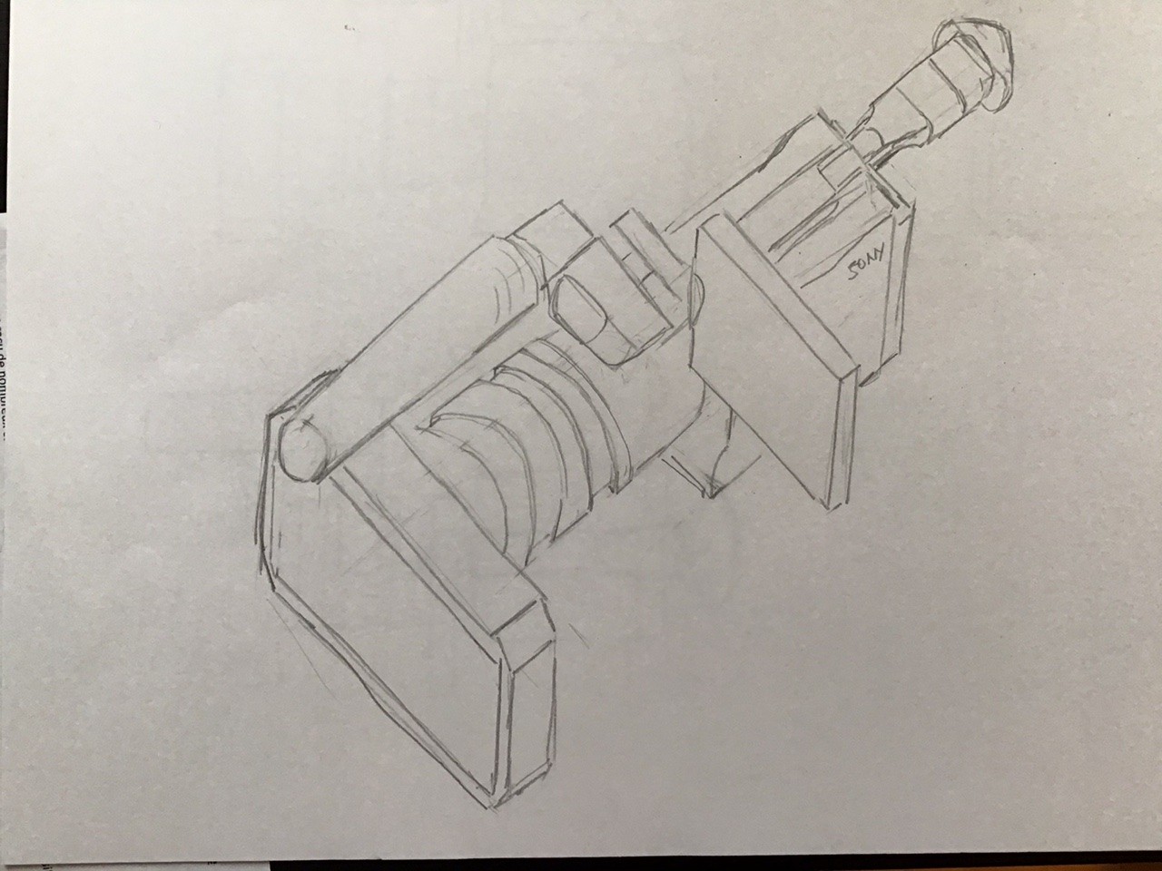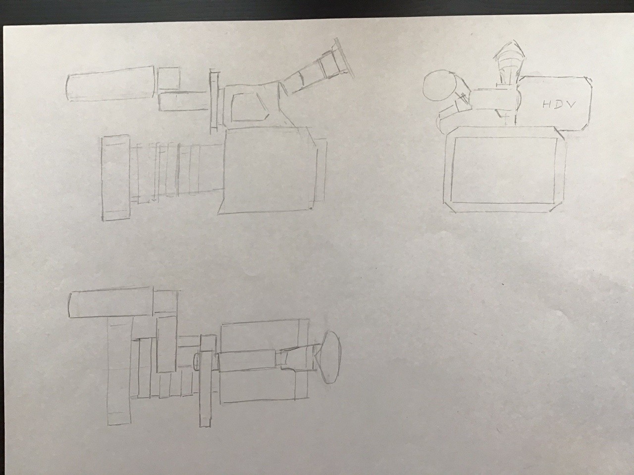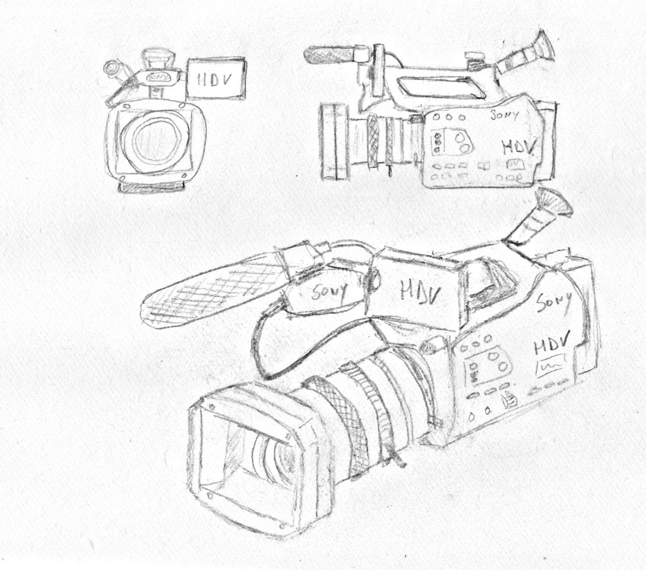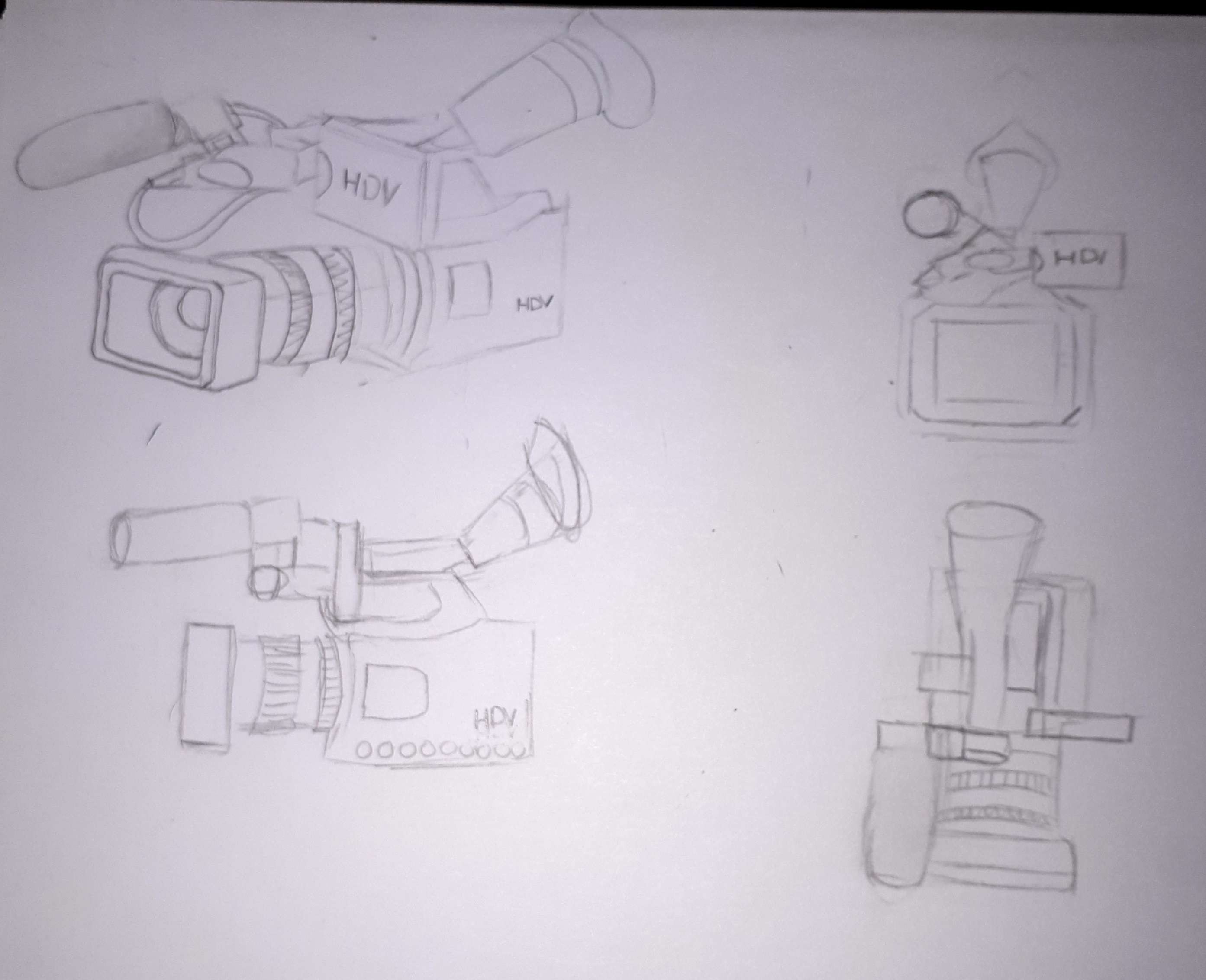 Premier essais de la fameuse caméra. J'ai eu beaucoup de mal et j'ai hésité à la dessiner, mais avec un peu de temps c'est un peu plus facile que ça n'y parait 🙂 Toujours le même problème : les proportions ...
