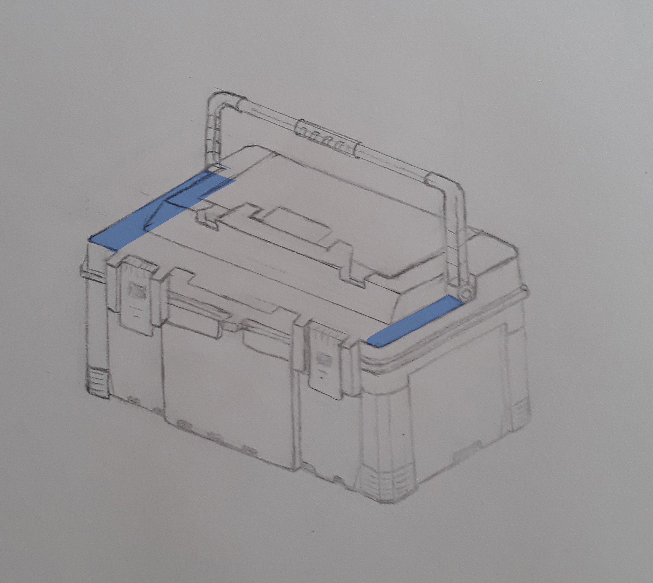 Tu t'en es pas mal tiré, même si tu as fait une marge vers le fond du couvercle que vers l'avant et décalé la poignée (parce que ton couvercle n'a pas tout à fait des traits parallèles j'ai l'impression). Je suis pas sûr que ce soit clair alors j'ai mis en couleur ce que je voulais dire ^^