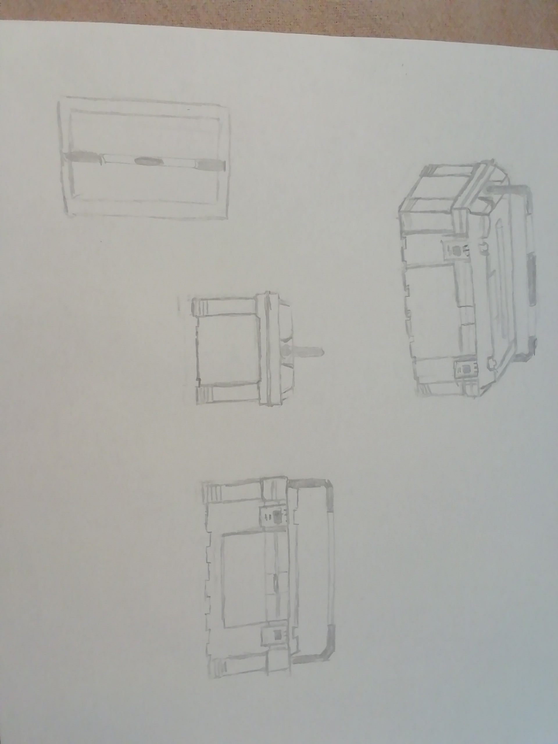 voici mon travail sur la caméra. J'ai eu beaucoup de mal a représenter l'écran et la poignée en donnant l'illusion que ces éléments sont en avant et au dessus de la structure carré+cylindre. La correction m'a bien aidé mais pas très satisfaite du résutat!