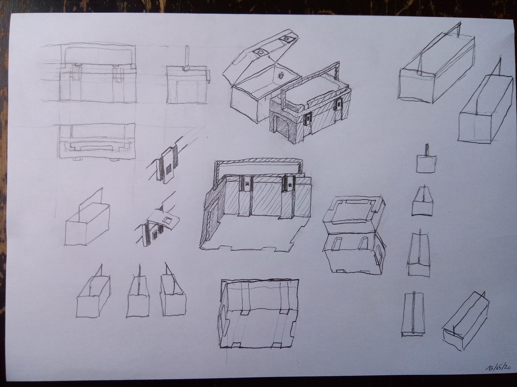 C'est presque parfait, tu as juste une incohérence sur la vue de dessus. Tu as bien compris comment était fixée la poignée de la boite, tu l'as bien placée sur toutes les autres vues. Mais pas sur la vue de dessus. Sur tes autres vues, ta poignée va jusqu'aux bords de la boite, sur ta vue de dessus, il y a une marge entre la poignée et le bord >> incohérence.