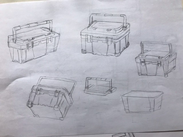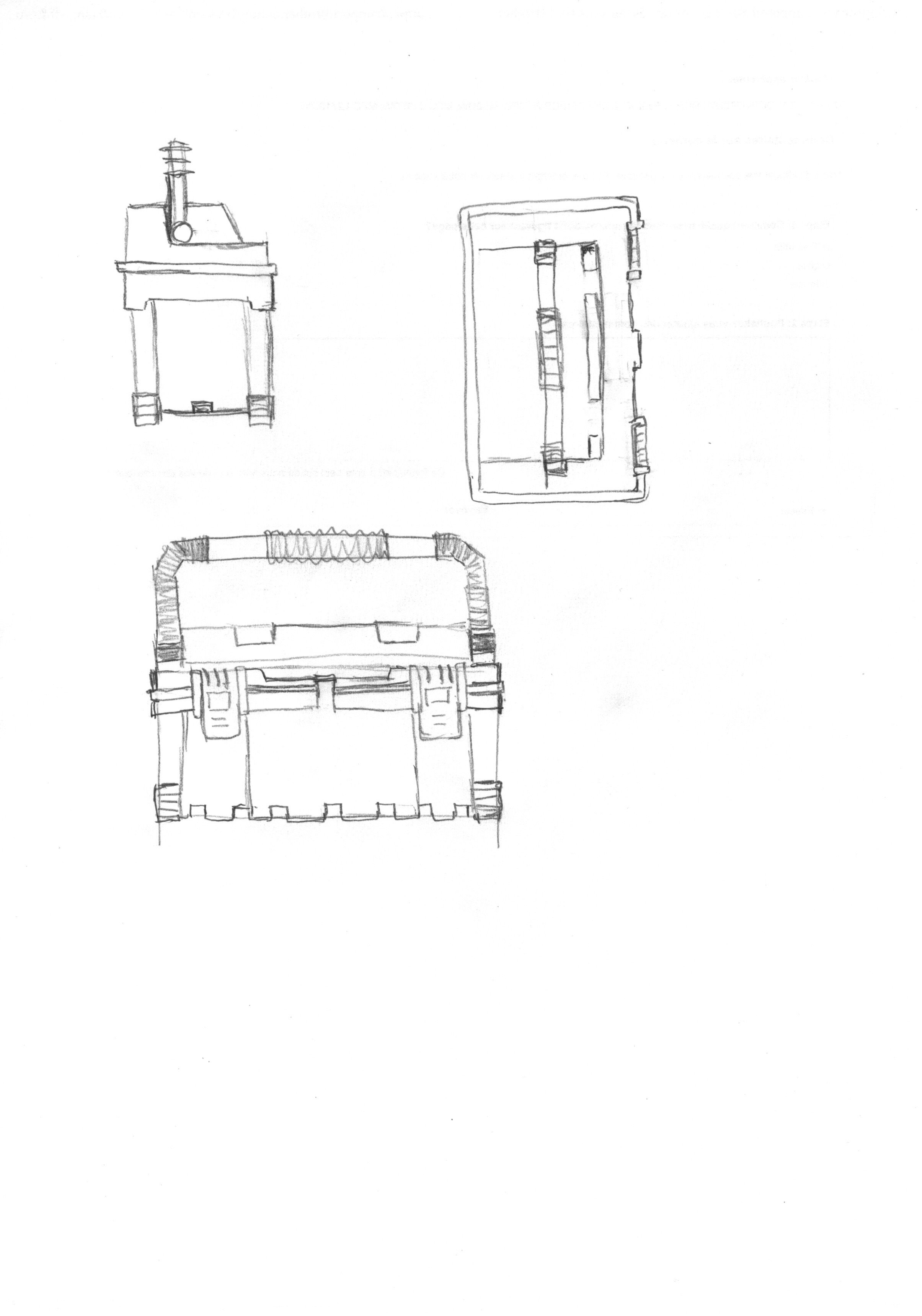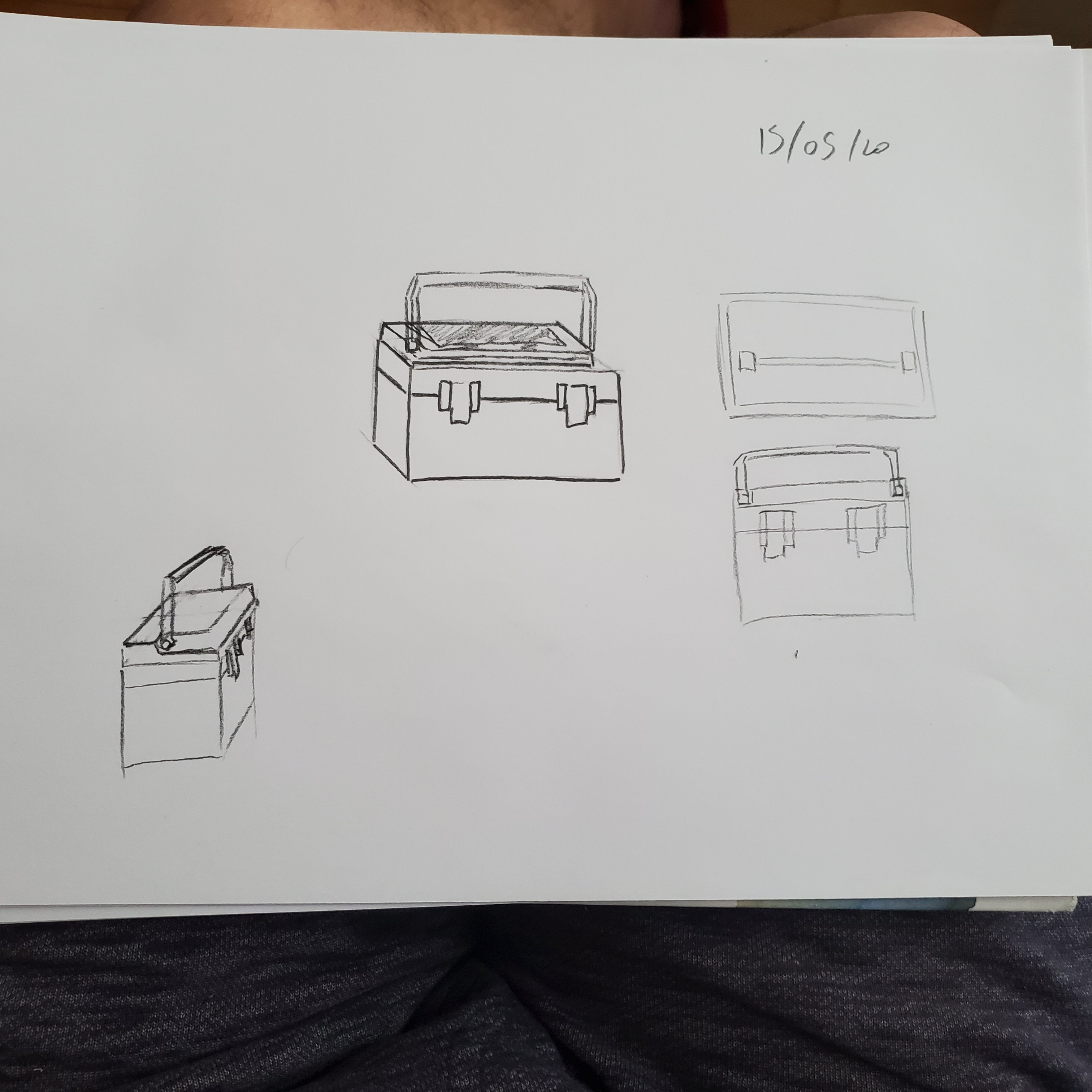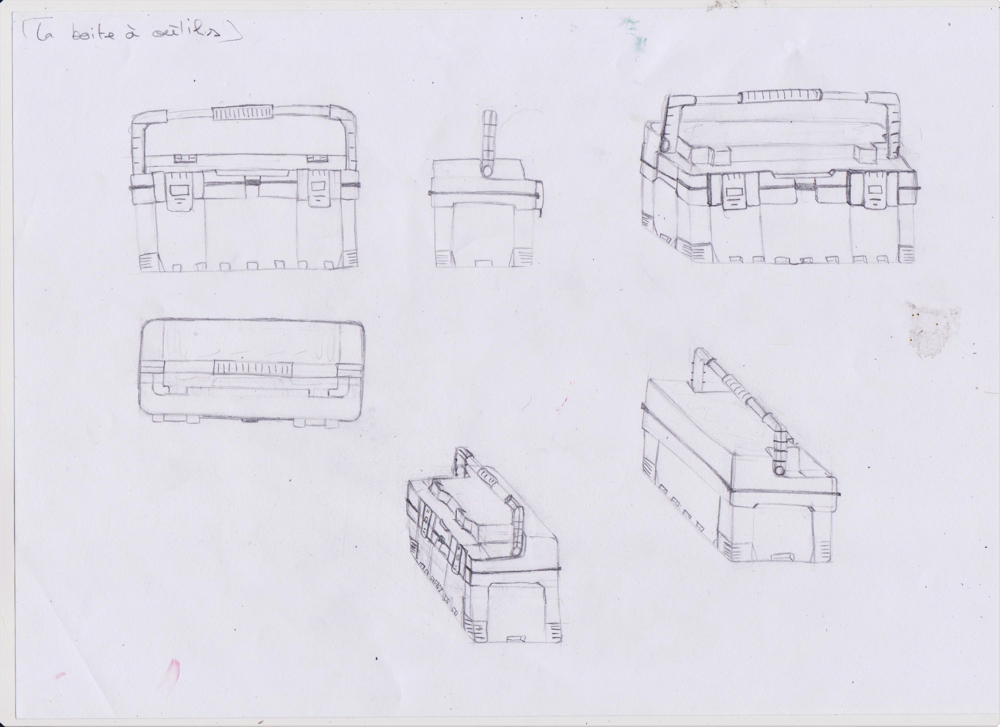 Pour la boite à outils : comment se fixe la poignée au couvercle de la boite ? A quelle hauteur se situe l'ouverture du couvercle ? Sur ta vue de profil ça semble différer des autres vues :)