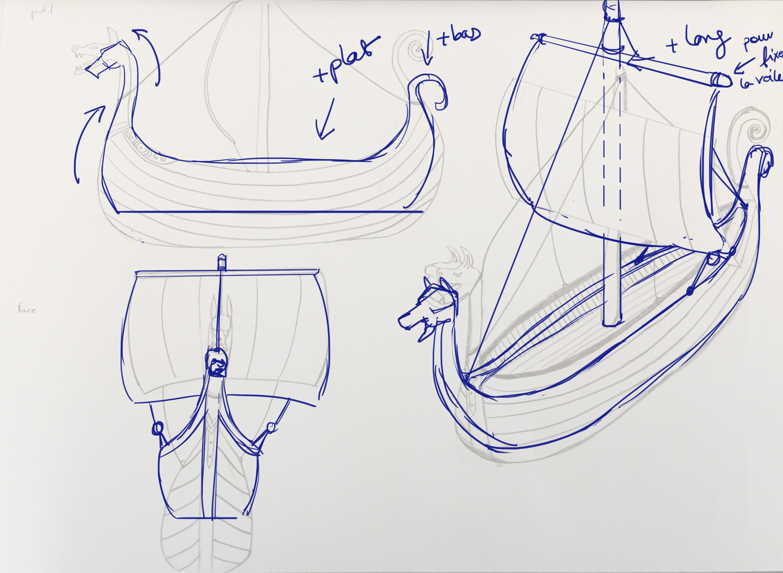 Alors les bateaux j'en ai jamais beaucoup dessiné et je n'ai pas ta référence. Du coup je suis allé prendre un maquette de drakkar pour voir un peu. Globalement j'ai noté les points suivants :
