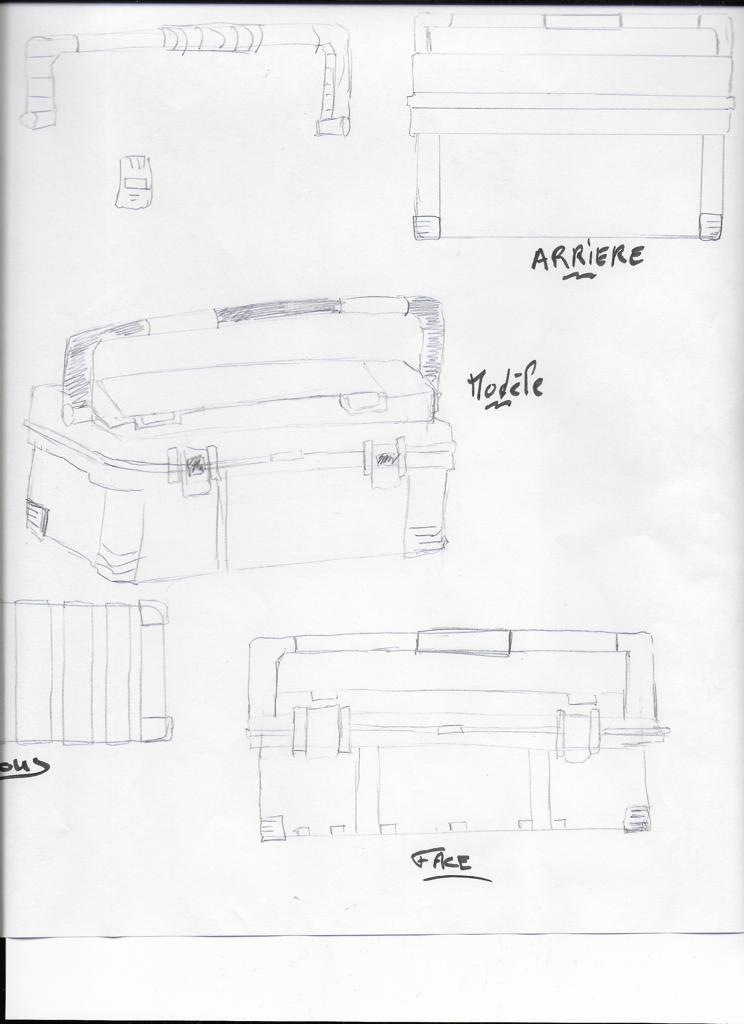 Andererseits fehlt es Tiefe! Ihre Toolbox verfügt über das "Painted Cardboard" -Syndrom, Sie haben nicht alle auf dem Original vorhandenen Volumina reproduziert, aber Sie zeichnen einfach ihre Form auf der Oberfläche der Box. Aber sobald Sie das getan haben, müssen Sie ausführlich oder extrudieren, sonst ist es kein Gehäuse, sondern ein Kartonbox 😉