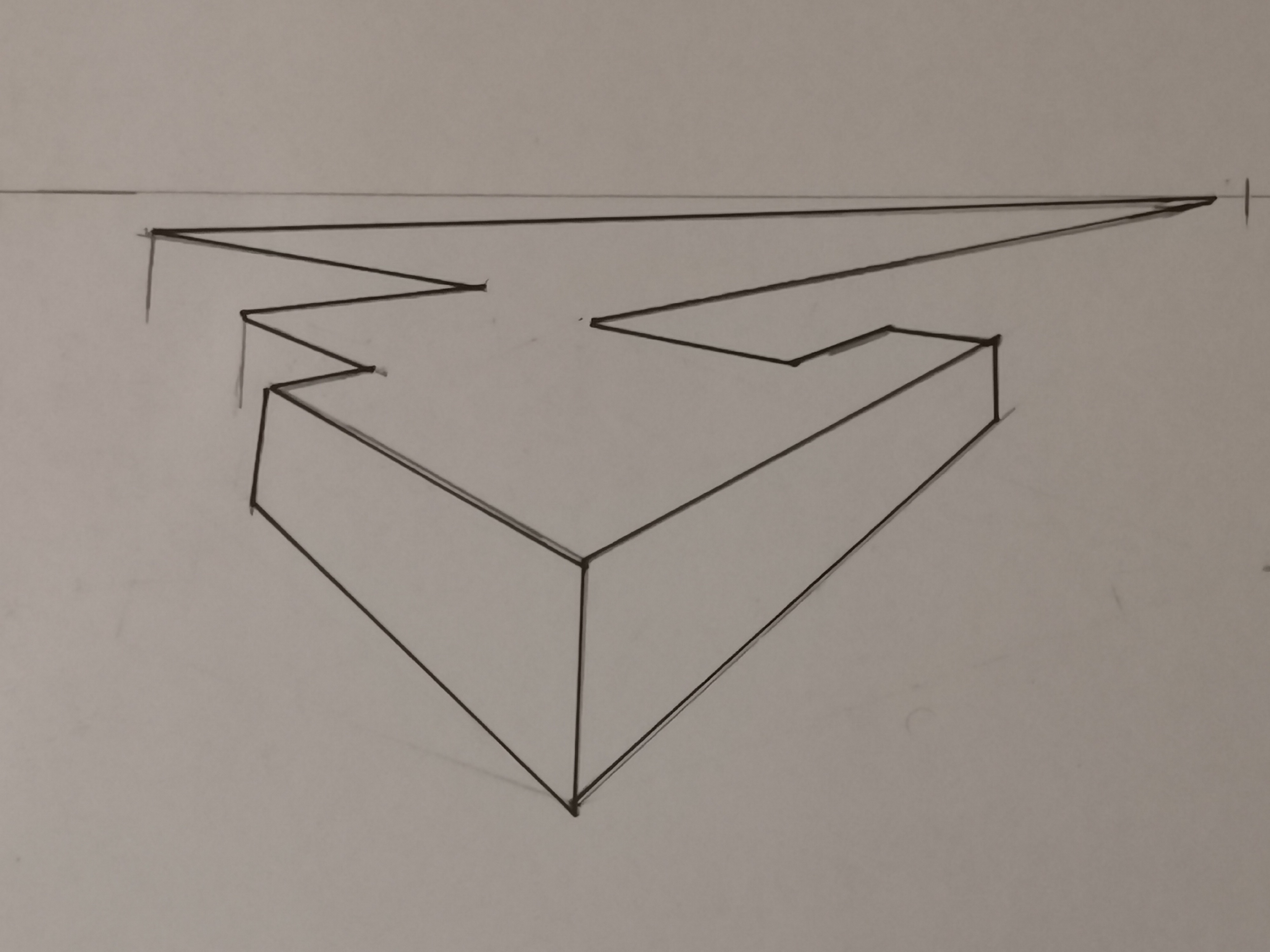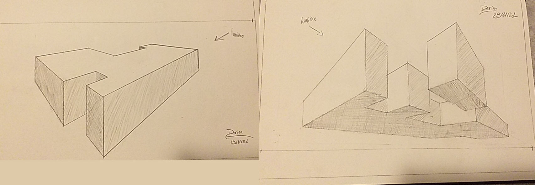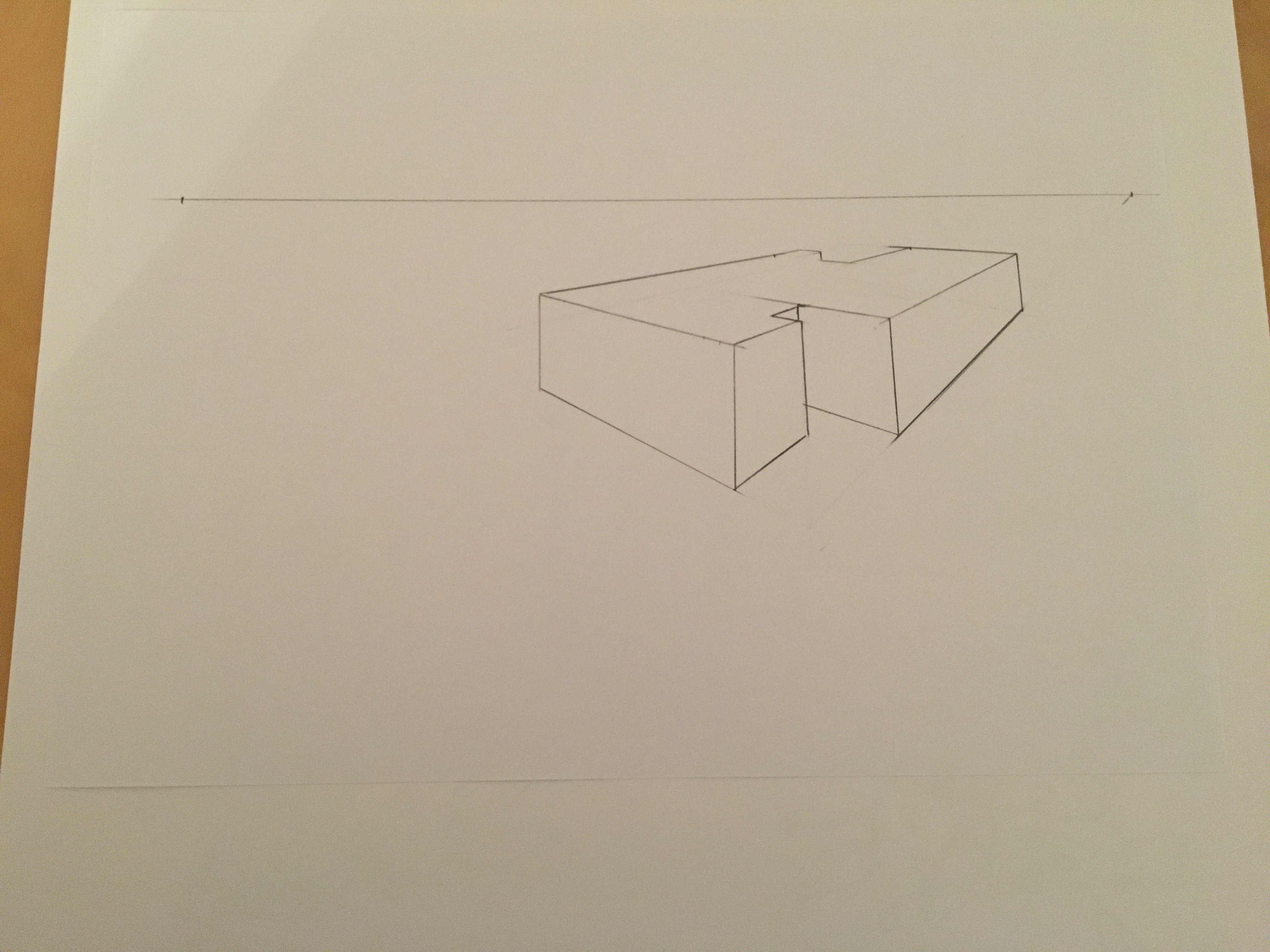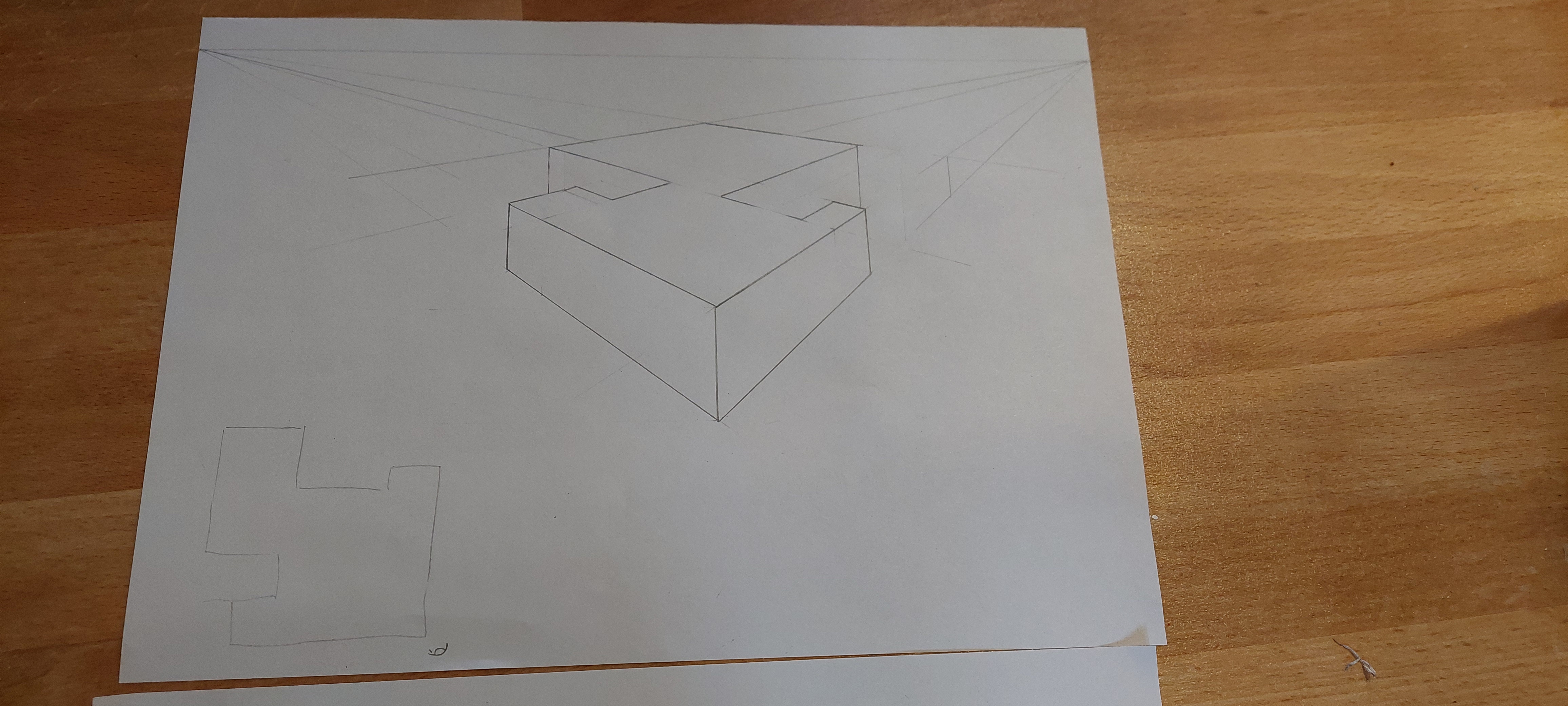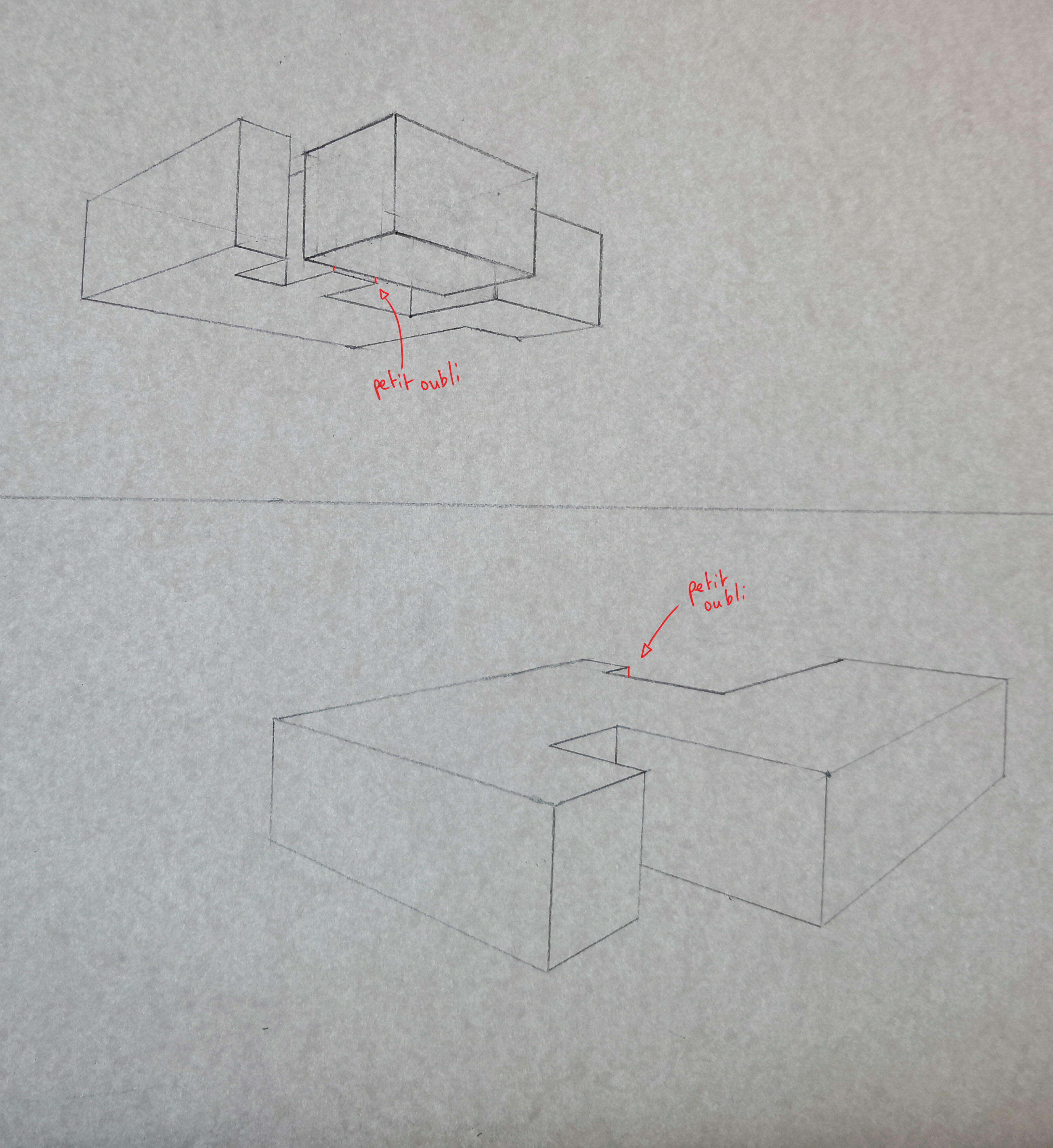 Ici tu es juste, bien que ce soit moins bien lisible que la forme précédente, car forcément, la forme est plus complèxe. Pour que ce soit plus lisible, renforce les arrêtes visibles (à l'encre par exemple ou avec un crayon plus gras) et laisse les lignes en transparence au crayon. Comme ce que tu as fait sur la petite forme flottante, mais sans prendre en compte la transparence que tu laisses au crayon.