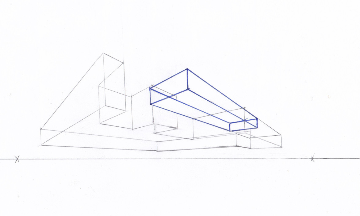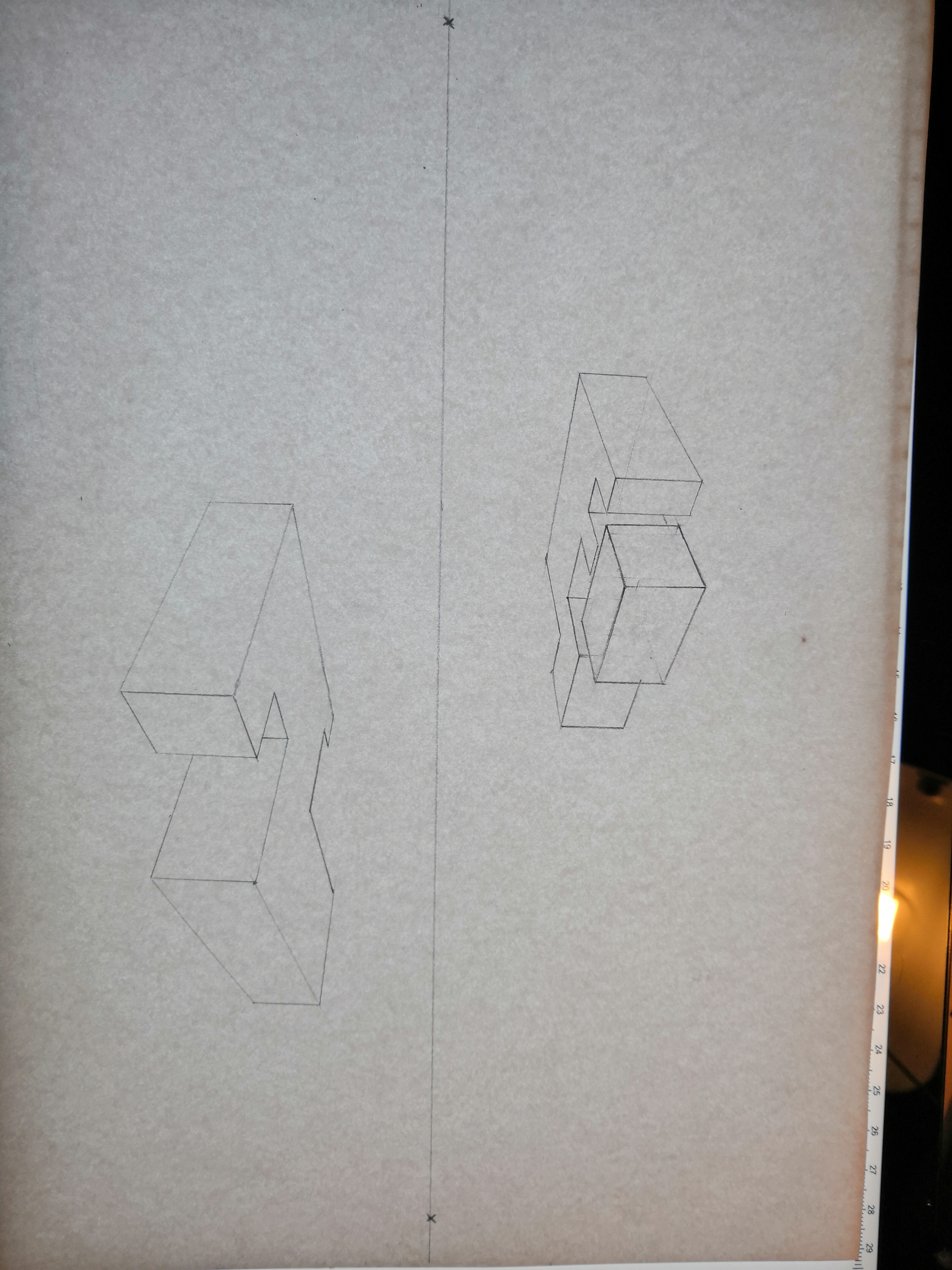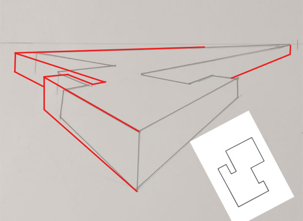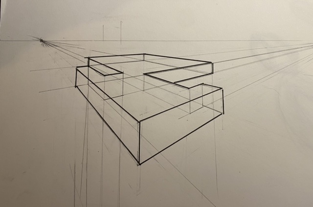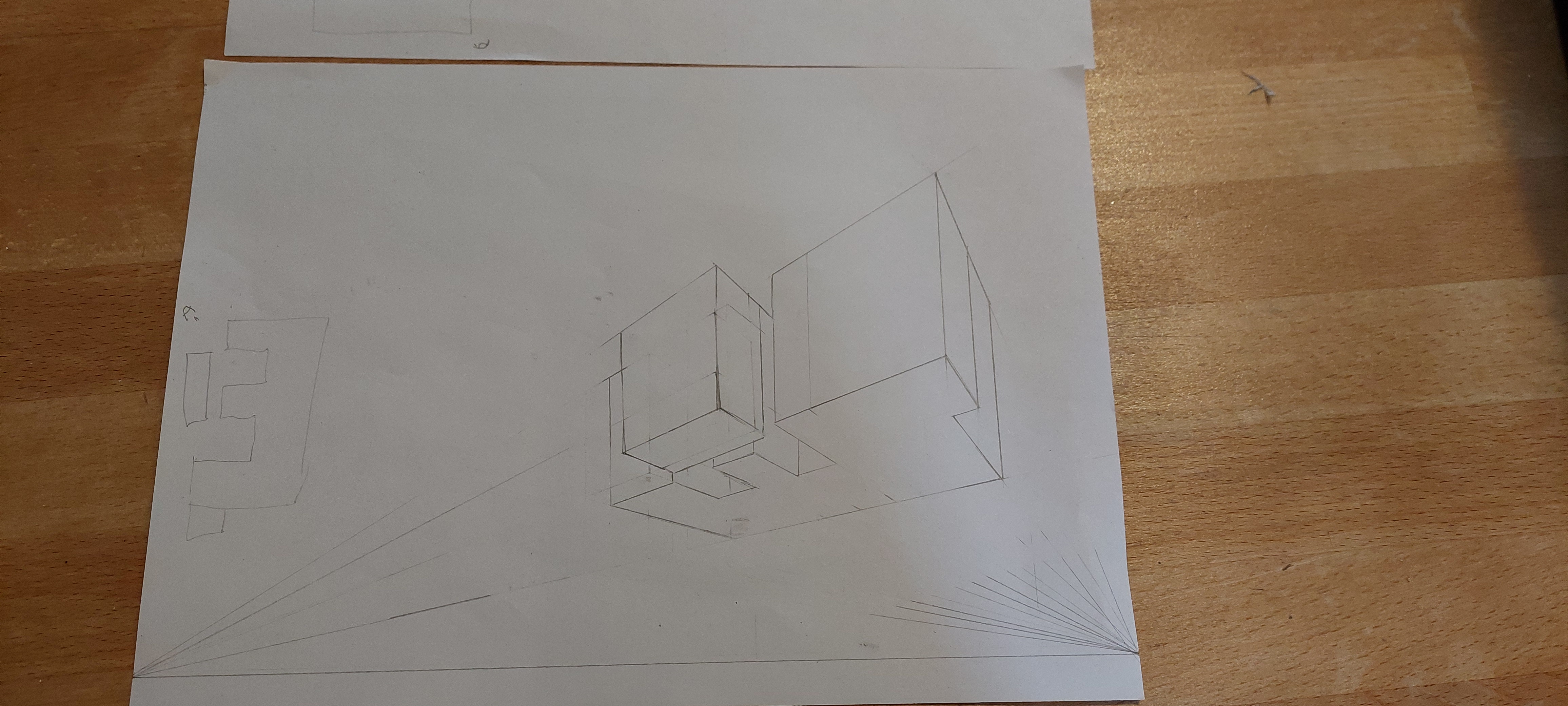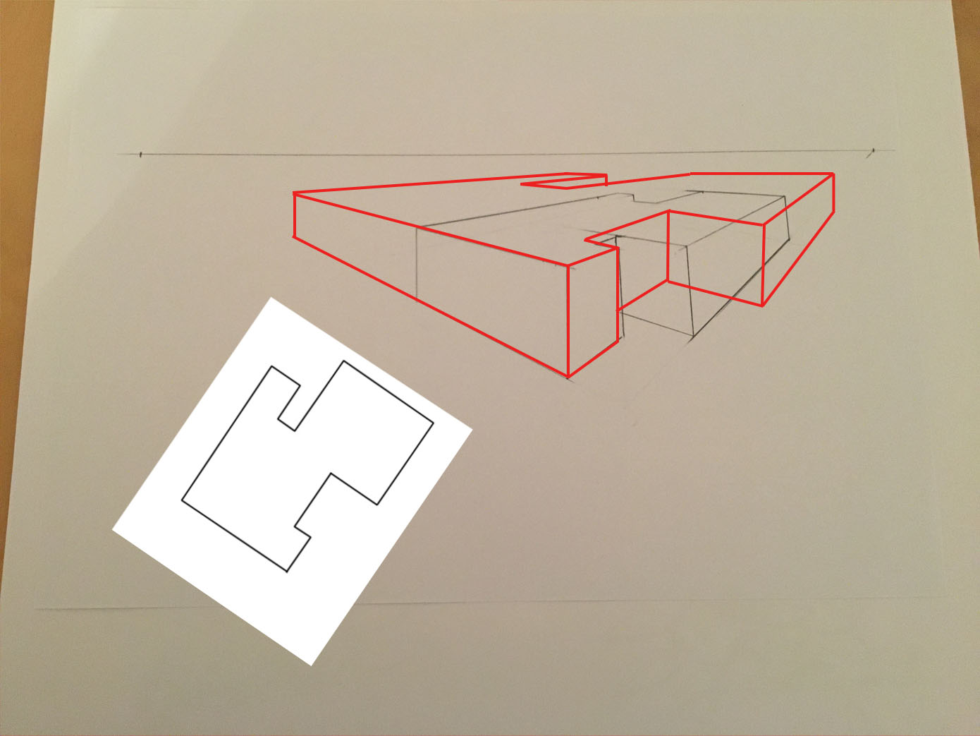 Ici tu es juste, bien que ce soit moins bien lisible que la forme précédente, car forcément, la forme est plus complèxe. Pour que ce soit plus lisible, renforce les arrêtes visibles (à l'encre par exemple ou avec un crayon plus gras) et laisse les lignes en transparence au crayon. Comme ce que tu as fait sur la petite forme flottante, mais sans prendre en compte la transparence que tu laisses au crayon.