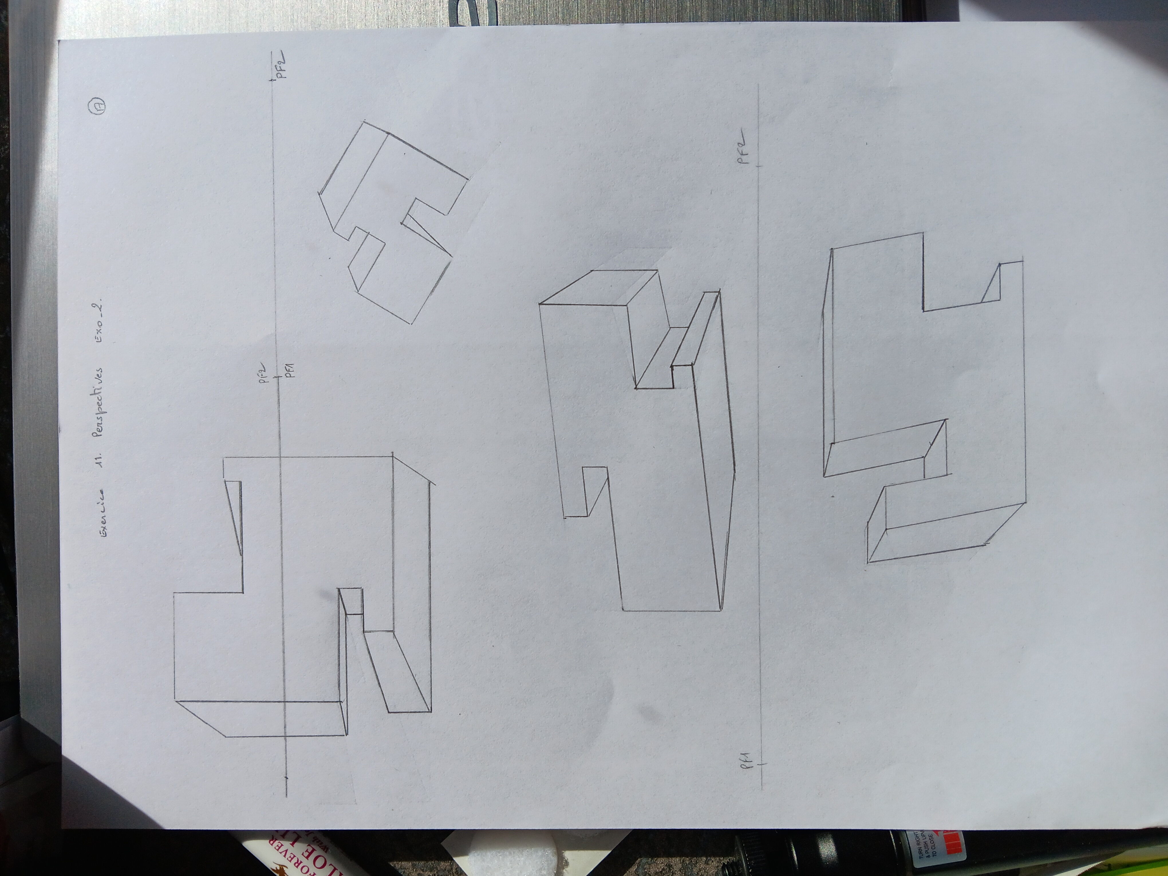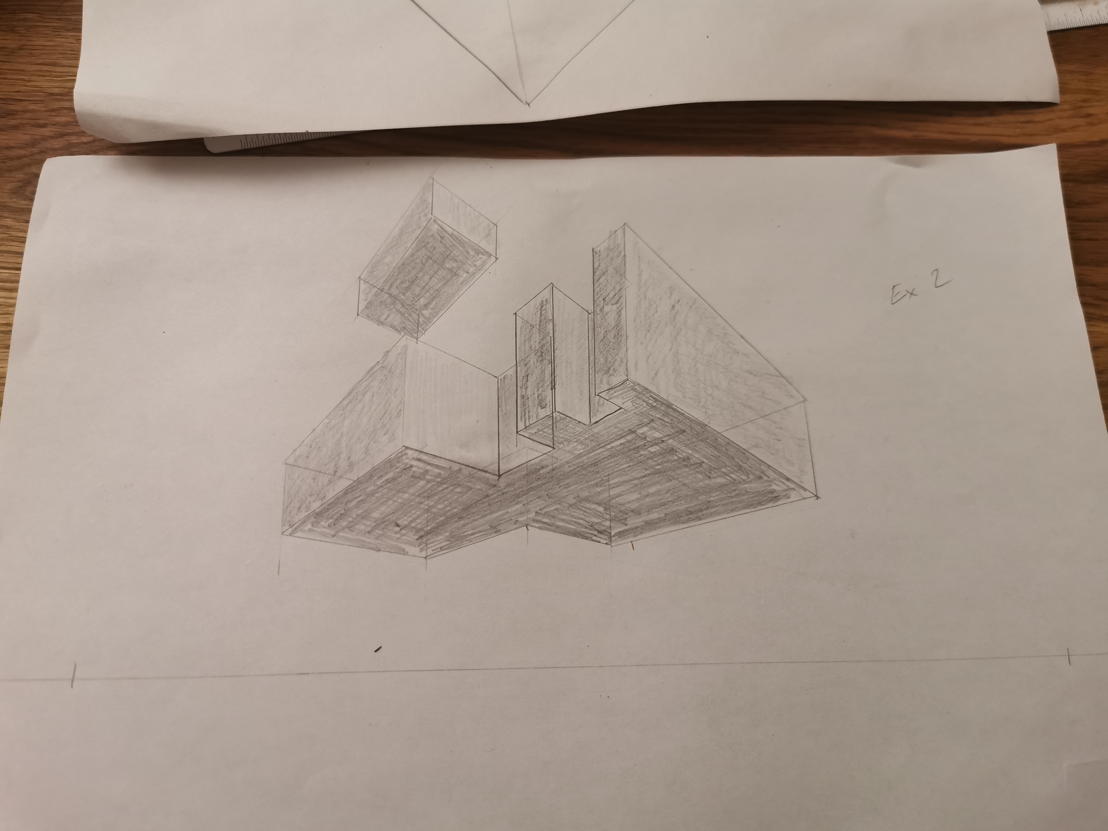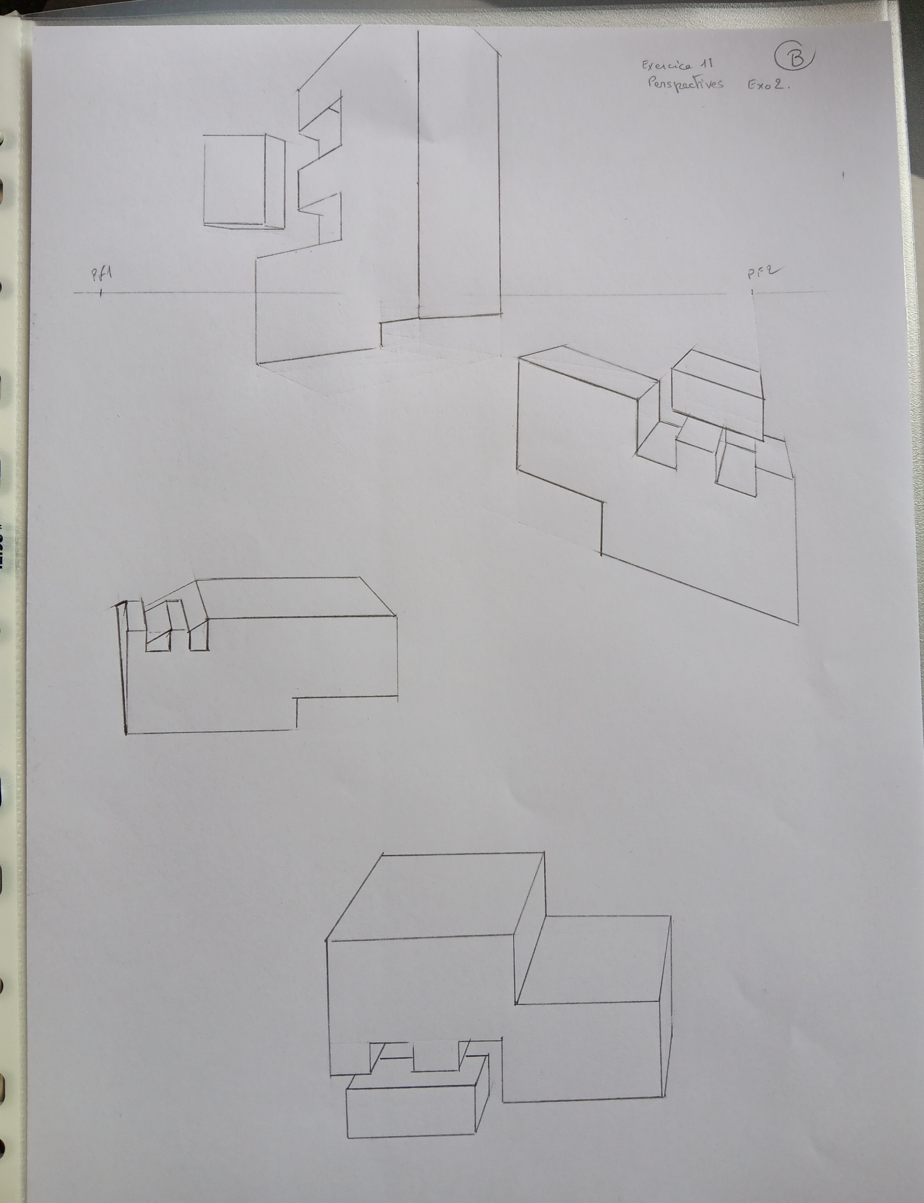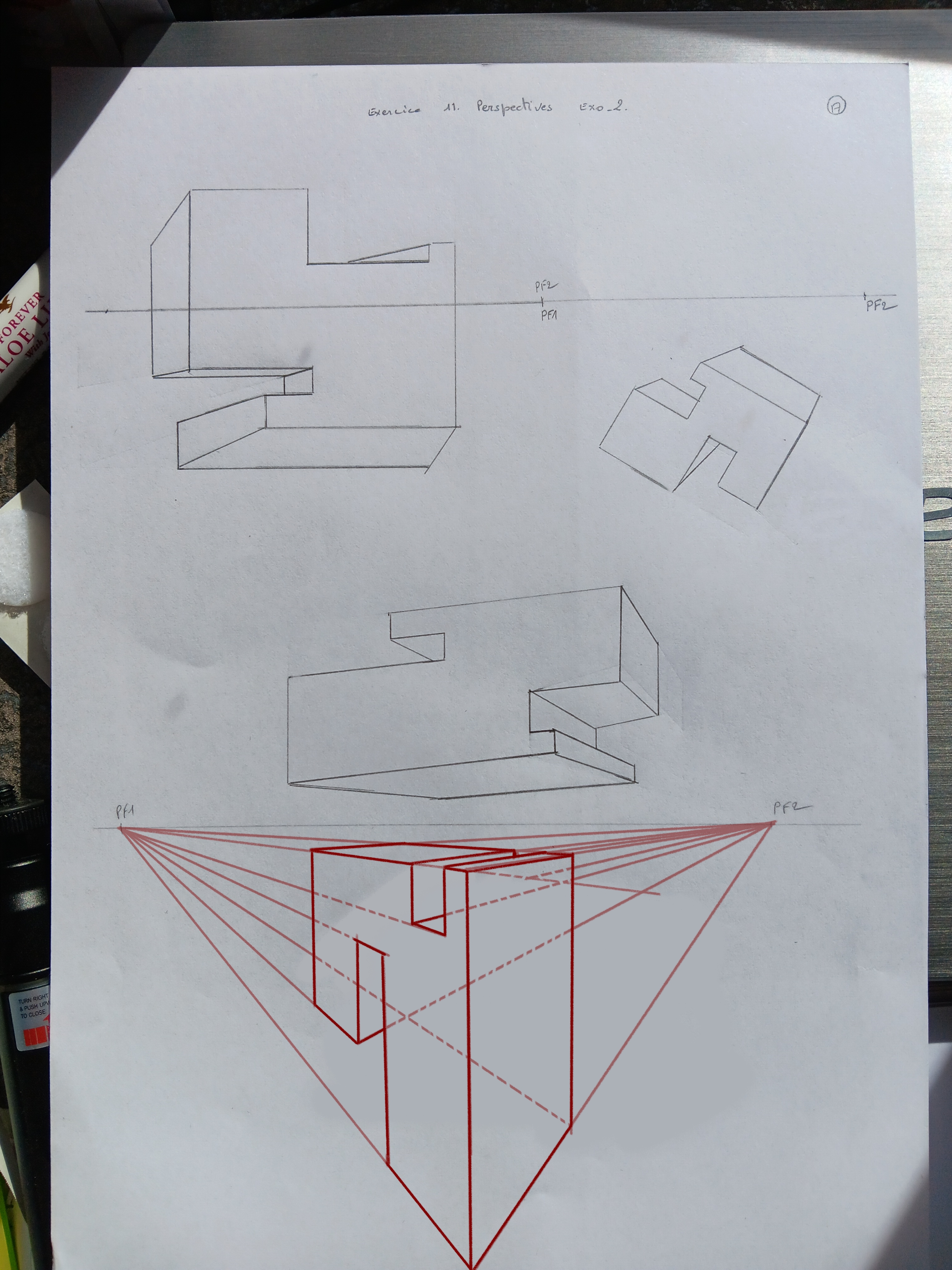 Bonjour Sof, tu as mal compris l'exercice. Il faut que la forme soit reproduite en perspective à deux point au sol. Sur tes deux exercices, on a l'impression que les deux formes sont en lévitation dans les airs et suivent deux point de fuites opposés... J'espère que mon correctif sera plus parlant! ;)