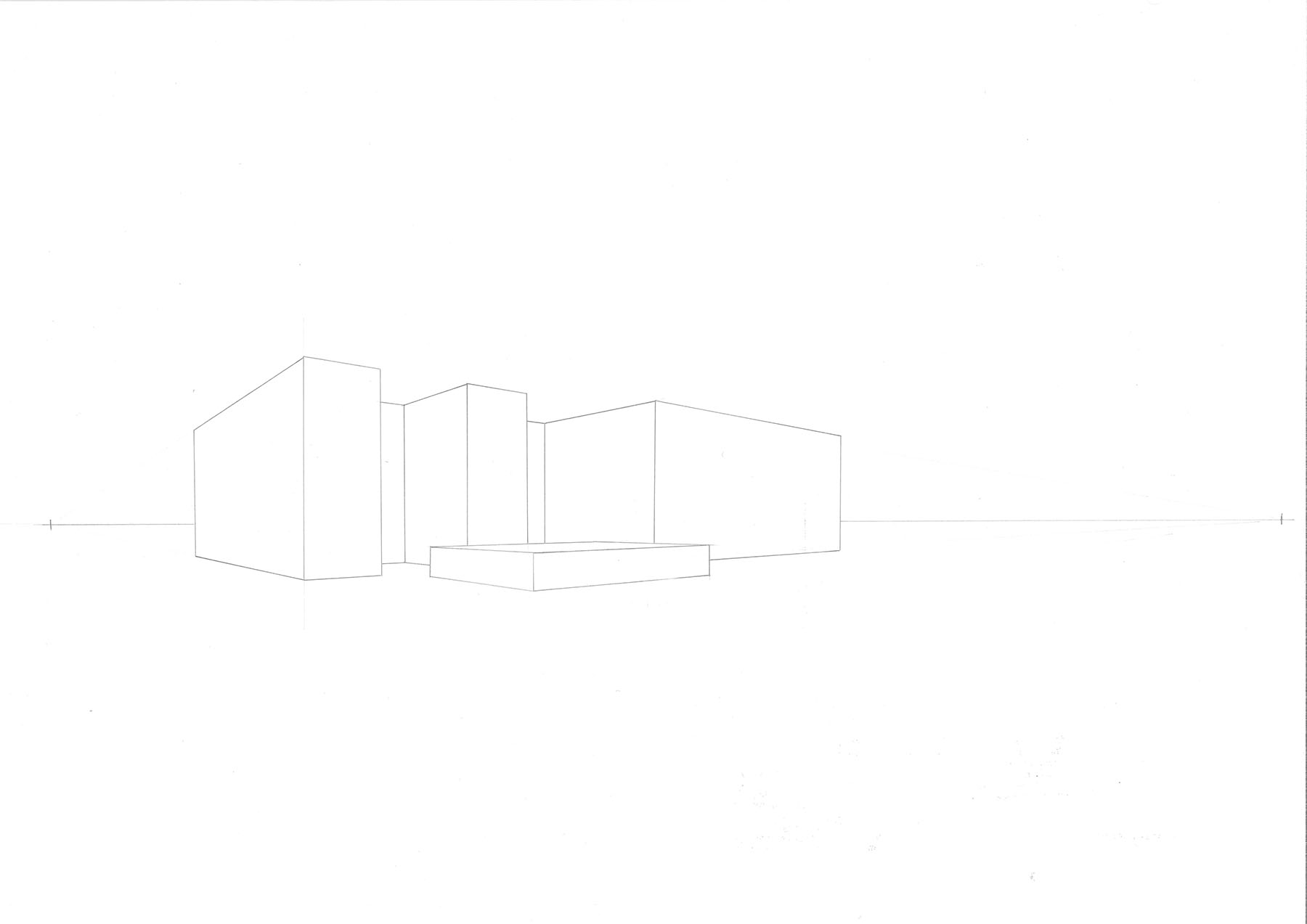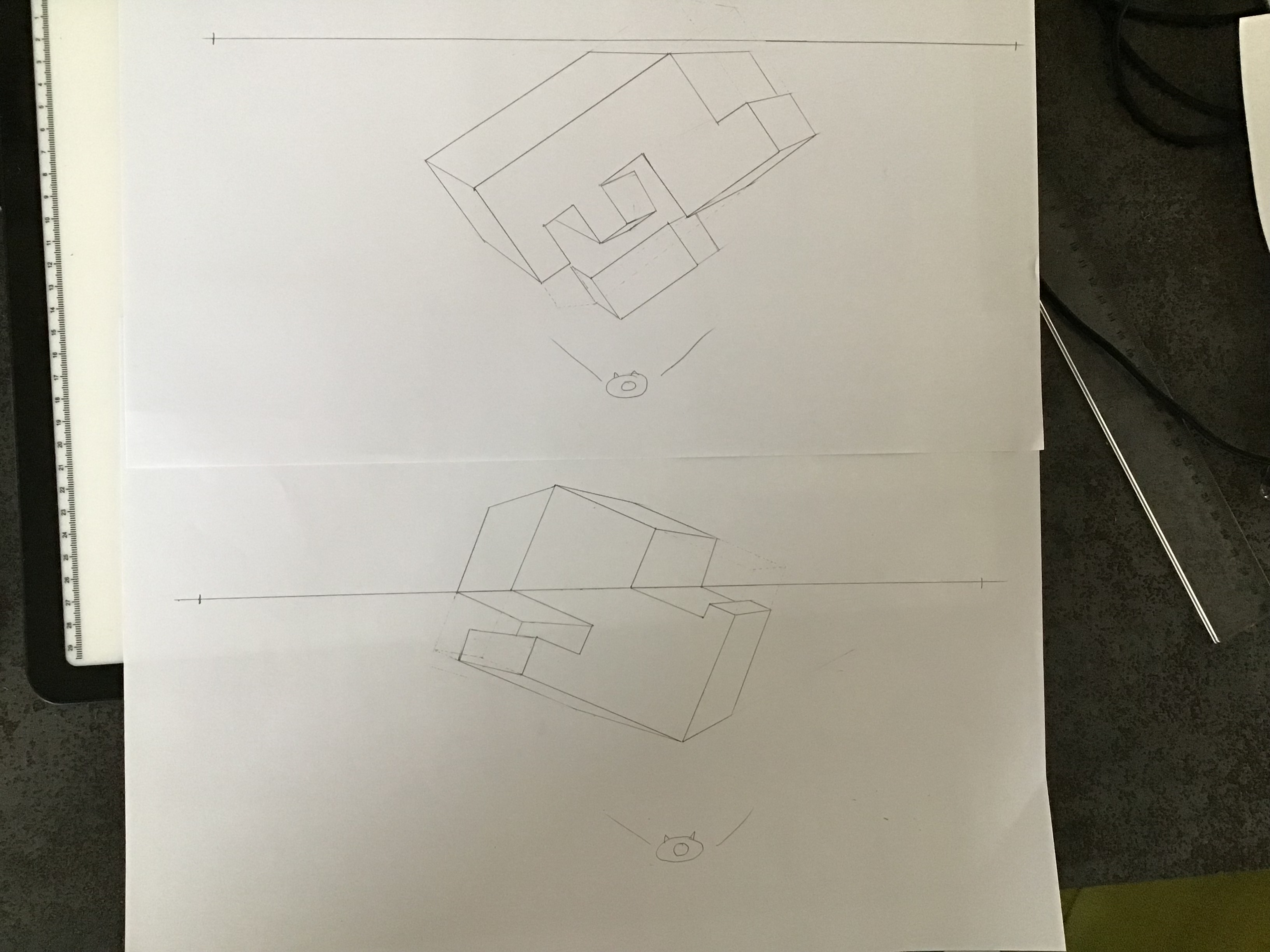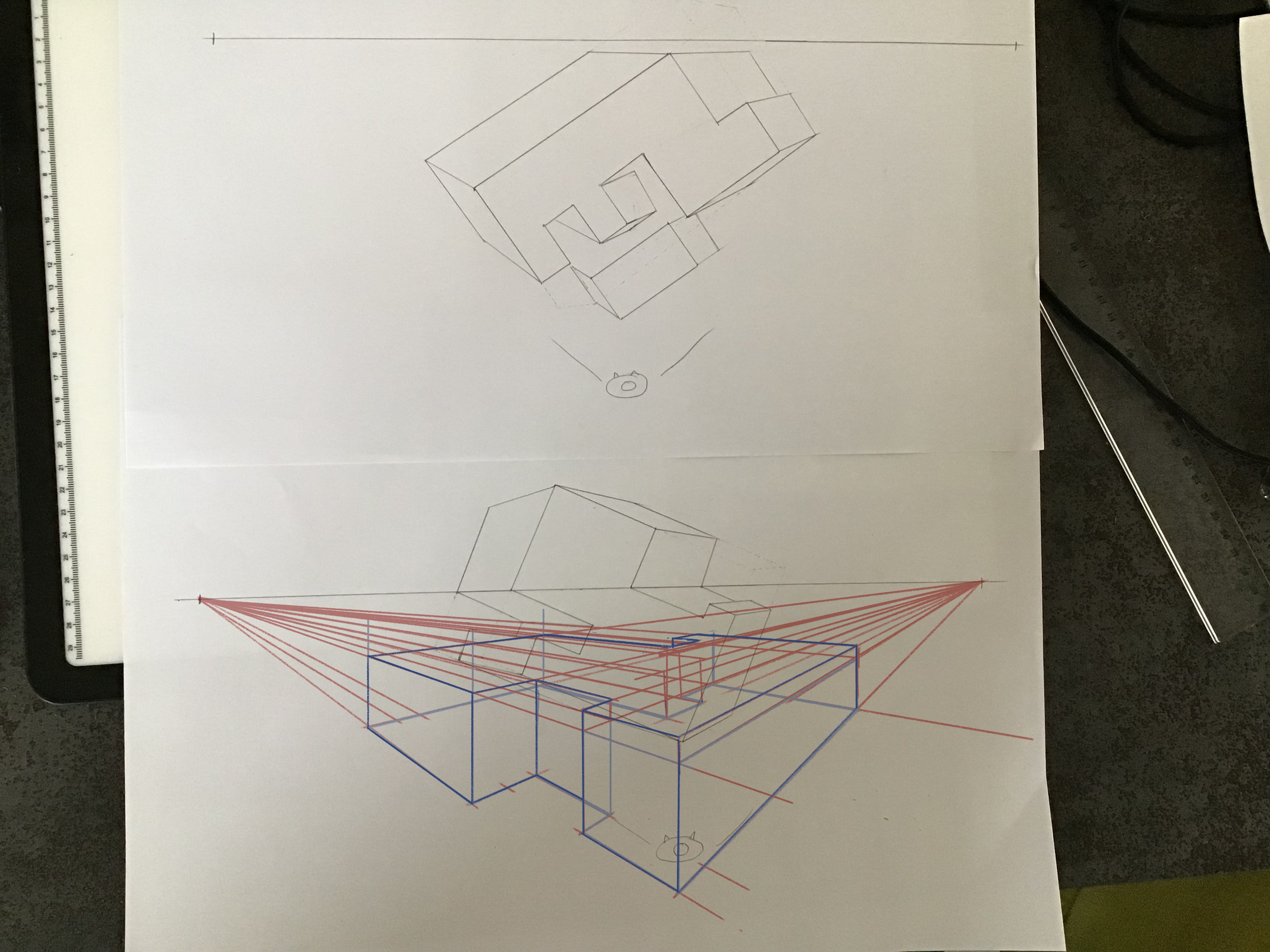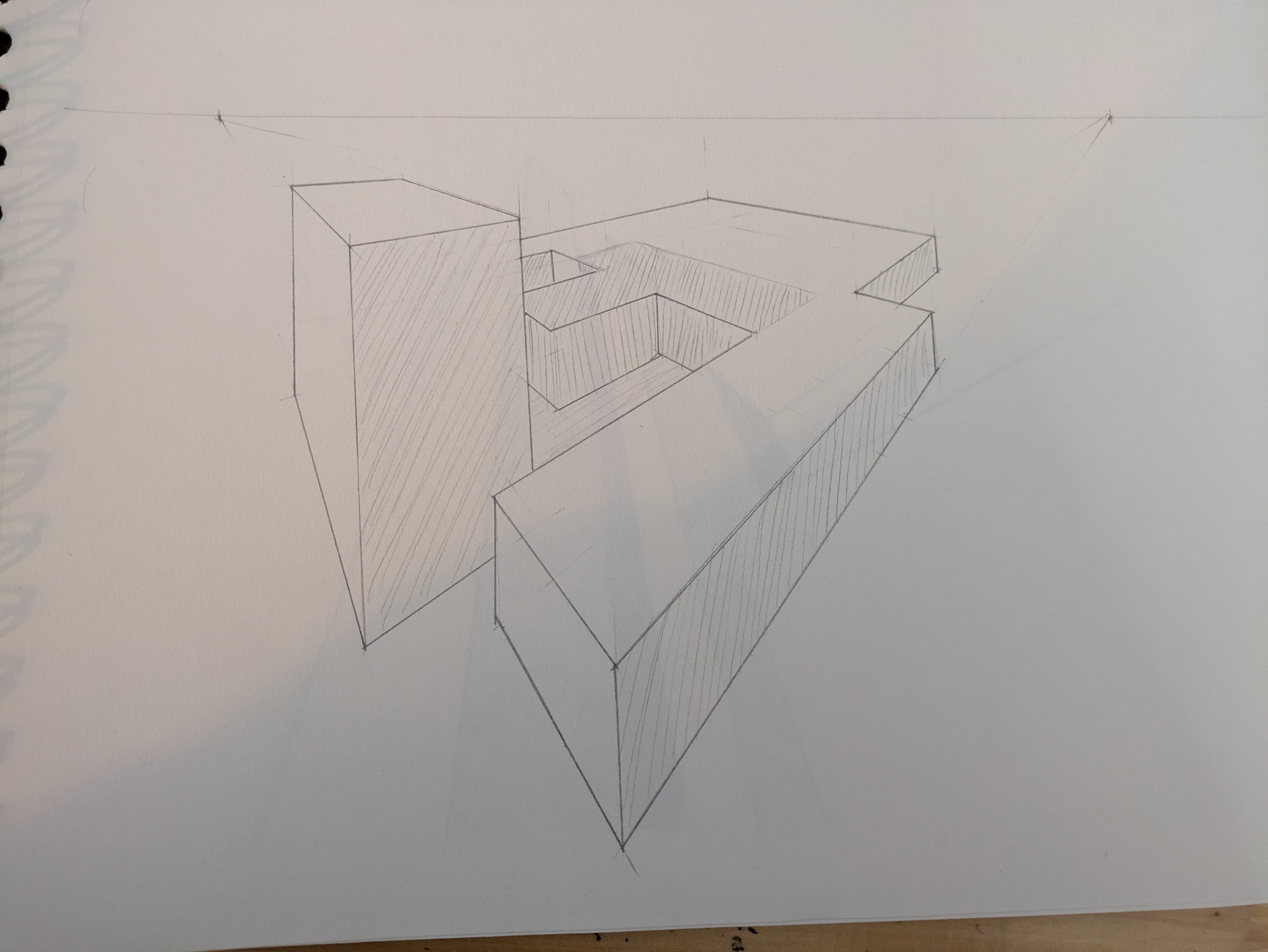 Ich habe vom Prinzip angefangen, dass es sich um ein Gebäude handelte (mit einem kleinen Pool vor :-) Daher die Sichtweise mit einer Perspektive über und unterhalb der Horizontlinie.