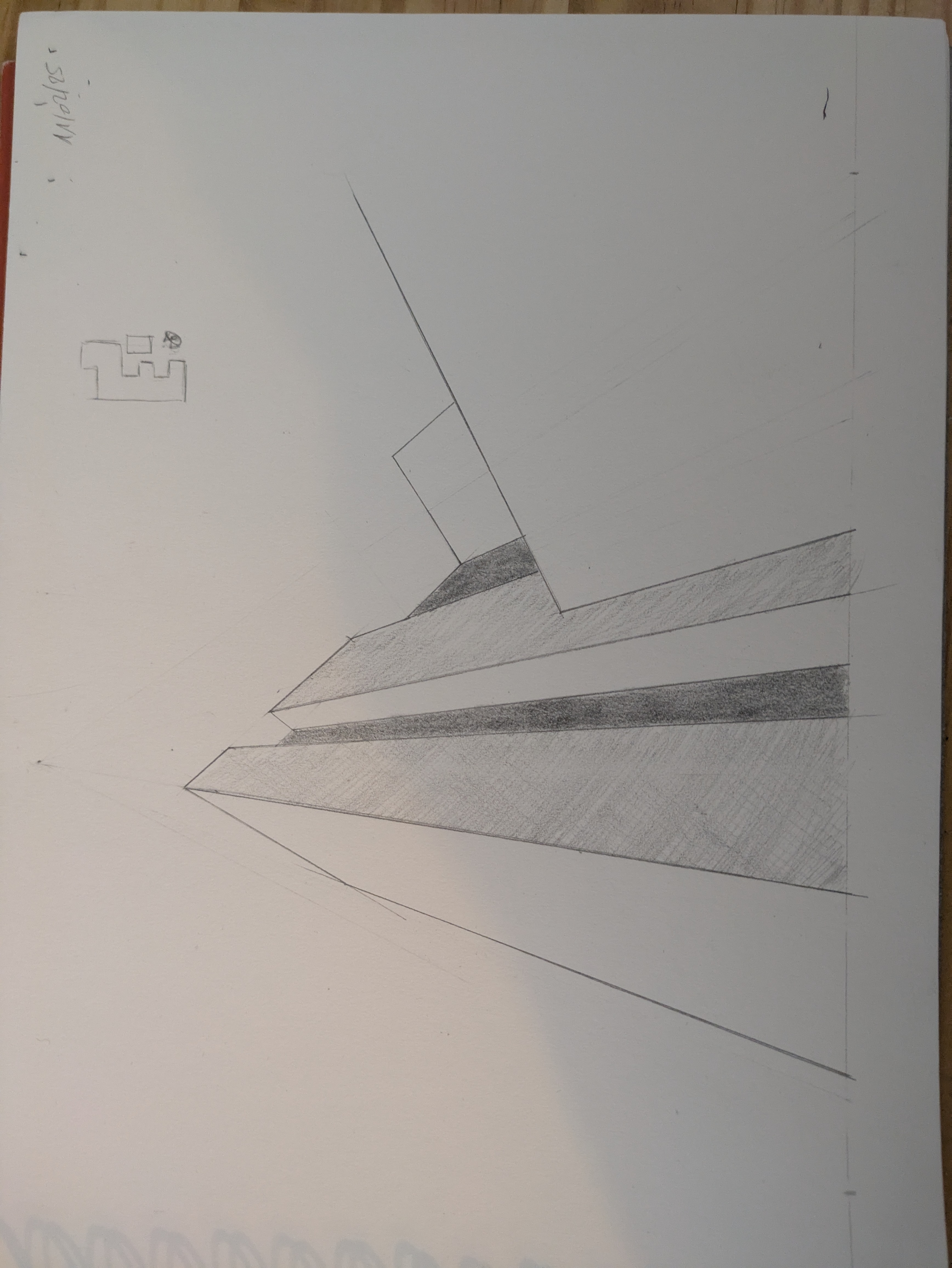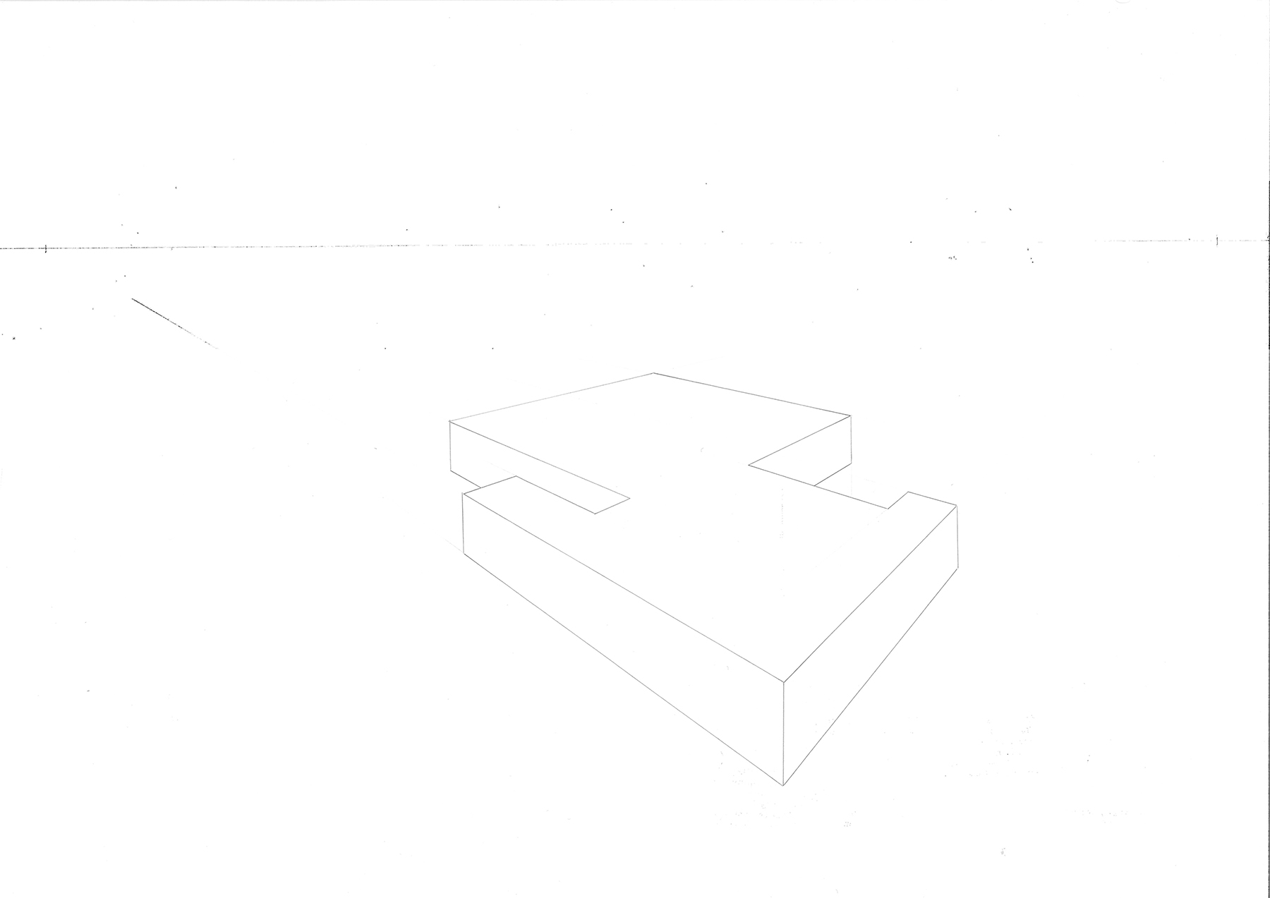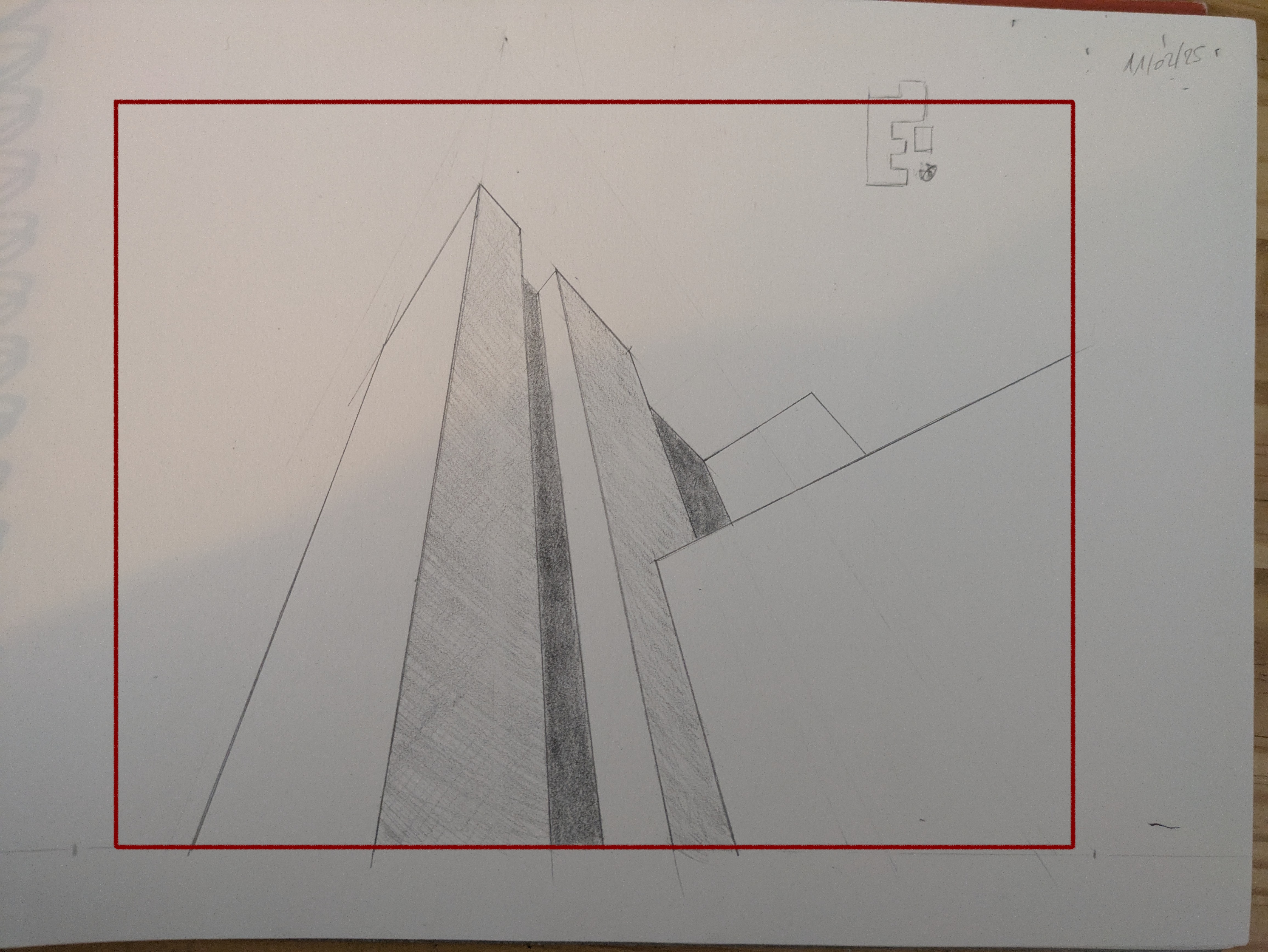 Ich habe vom Prinzip angefangen, dass es sich um ein Gebäude handelte (mit einem kleinen Pool vor :-) Daher die Sichtweise mit einer Perspektive über und unterhalb der Horizontlinie.