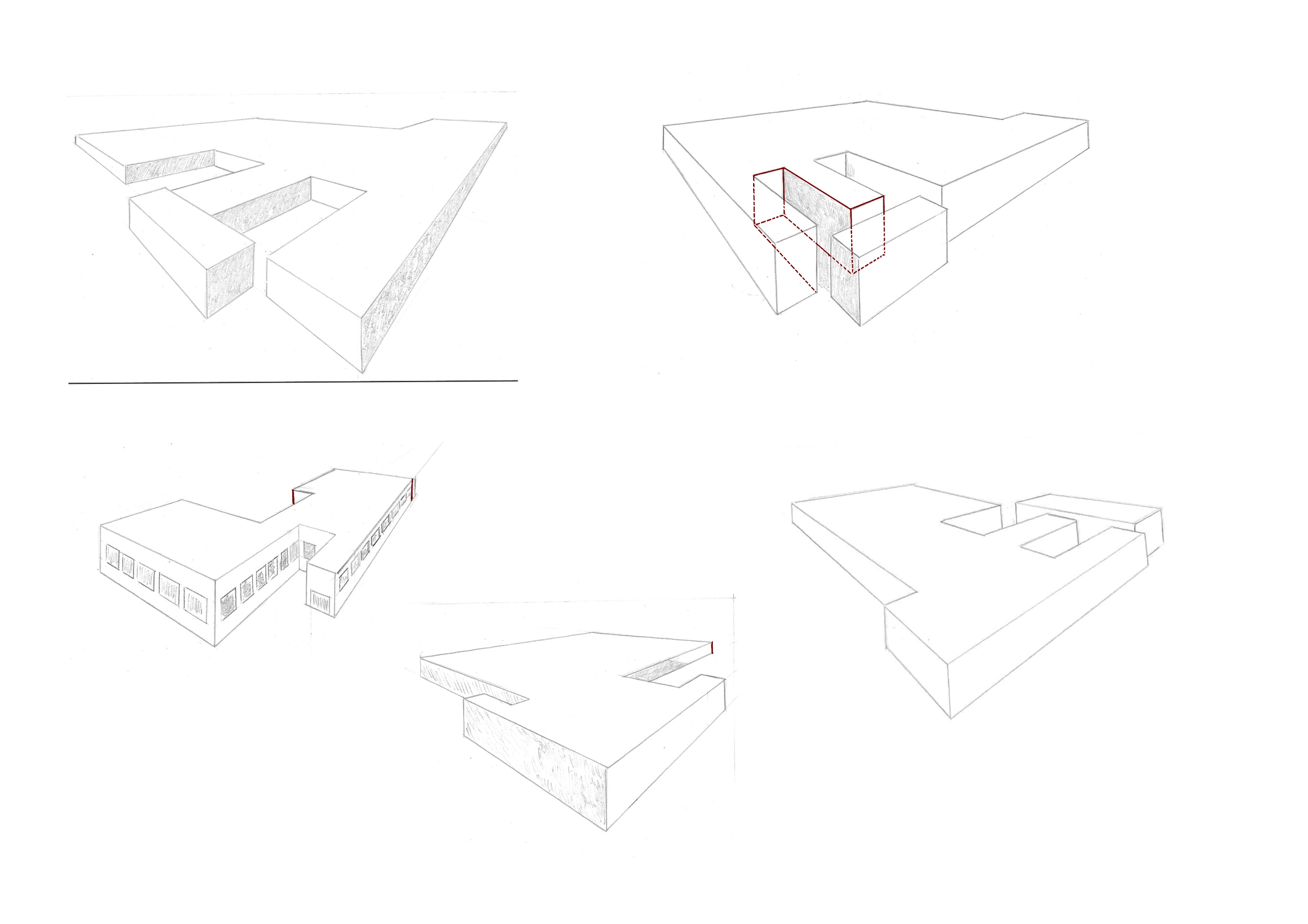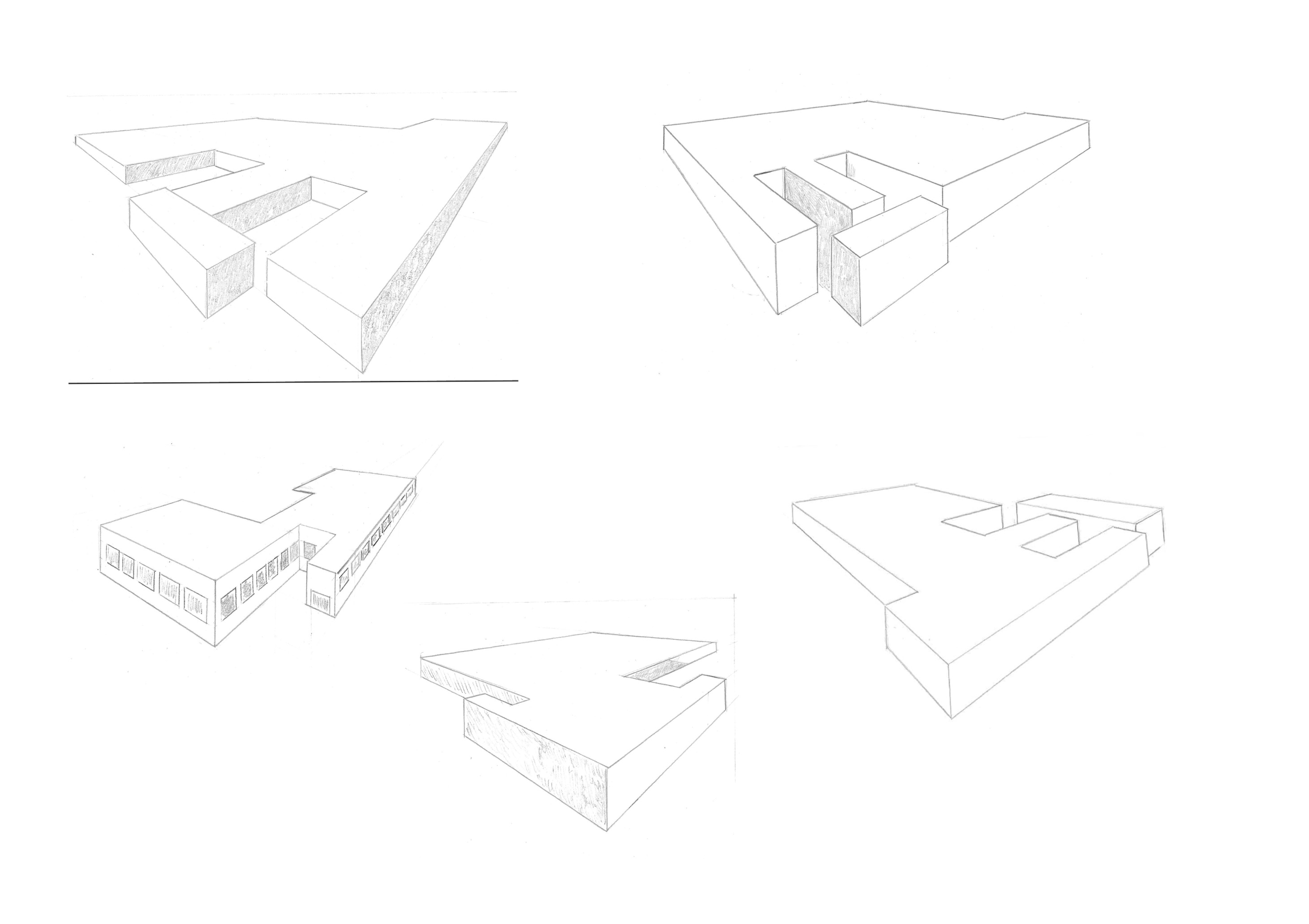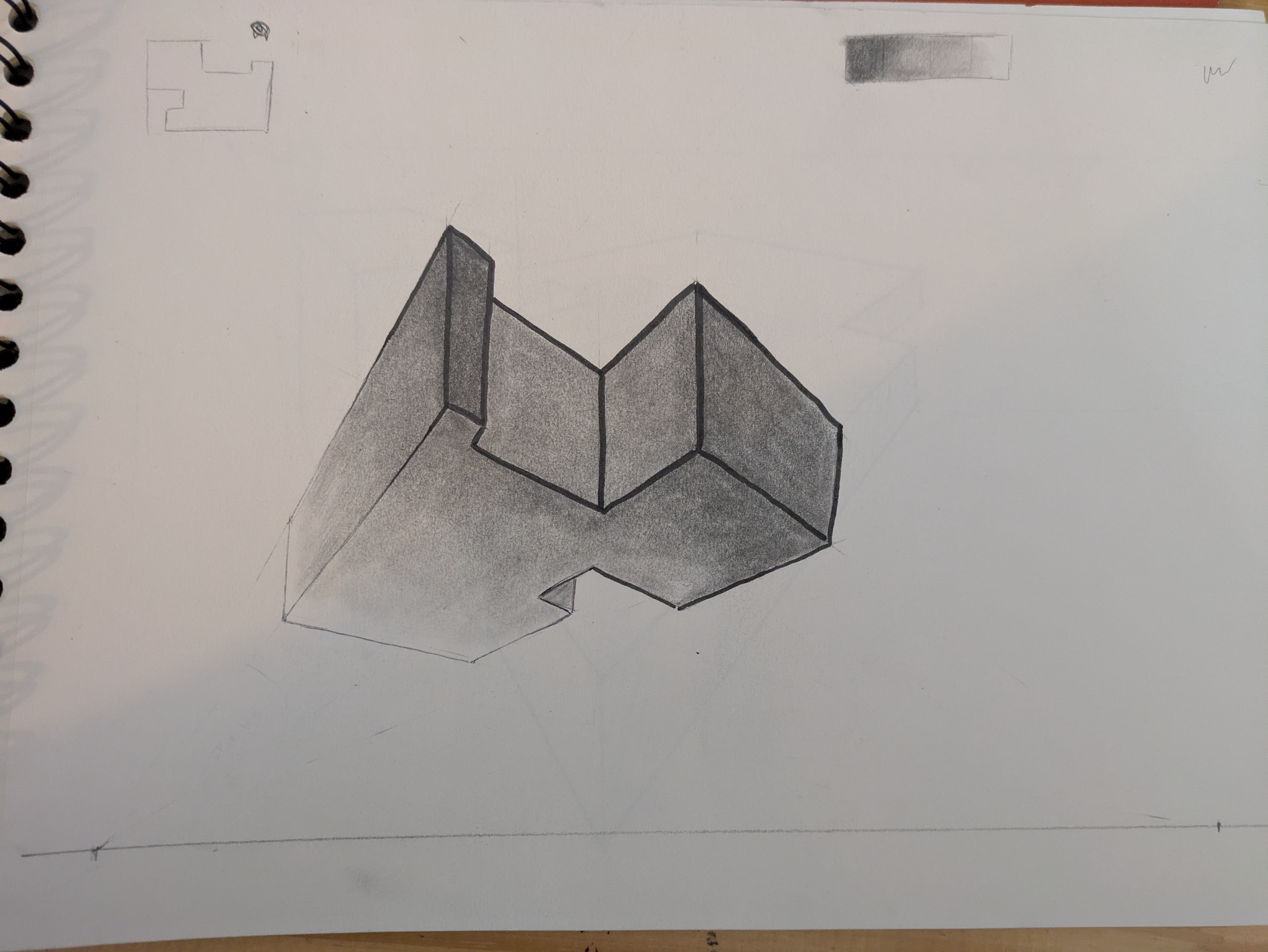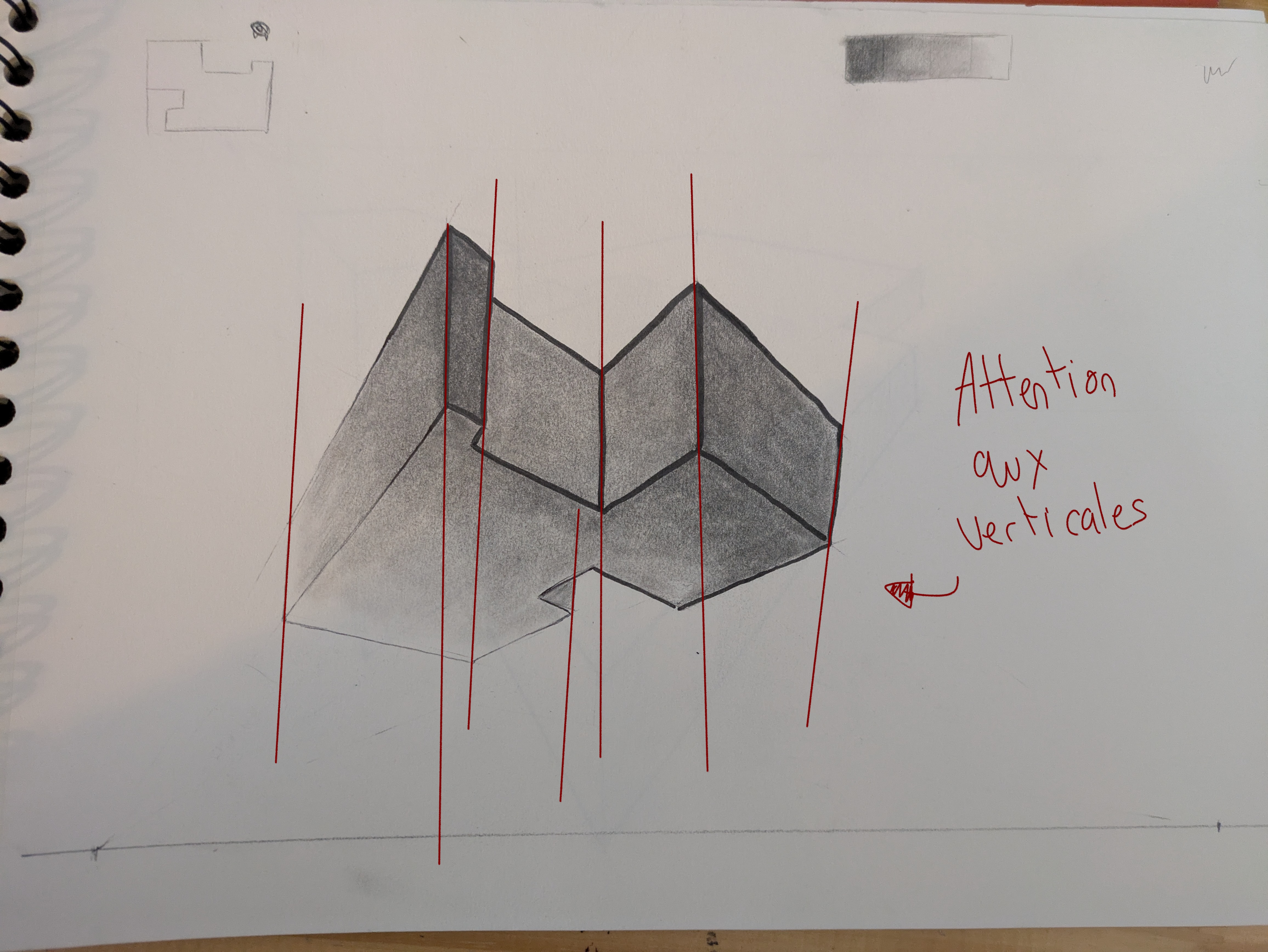 Ich habe vom Prinzip angefangen, dass es sich um ein Gebäude handelte (mit einem kleinen Pool vor :-) Daher die Sichtweise mit einer Perspektive über und unterhalb der Horizontlinie.