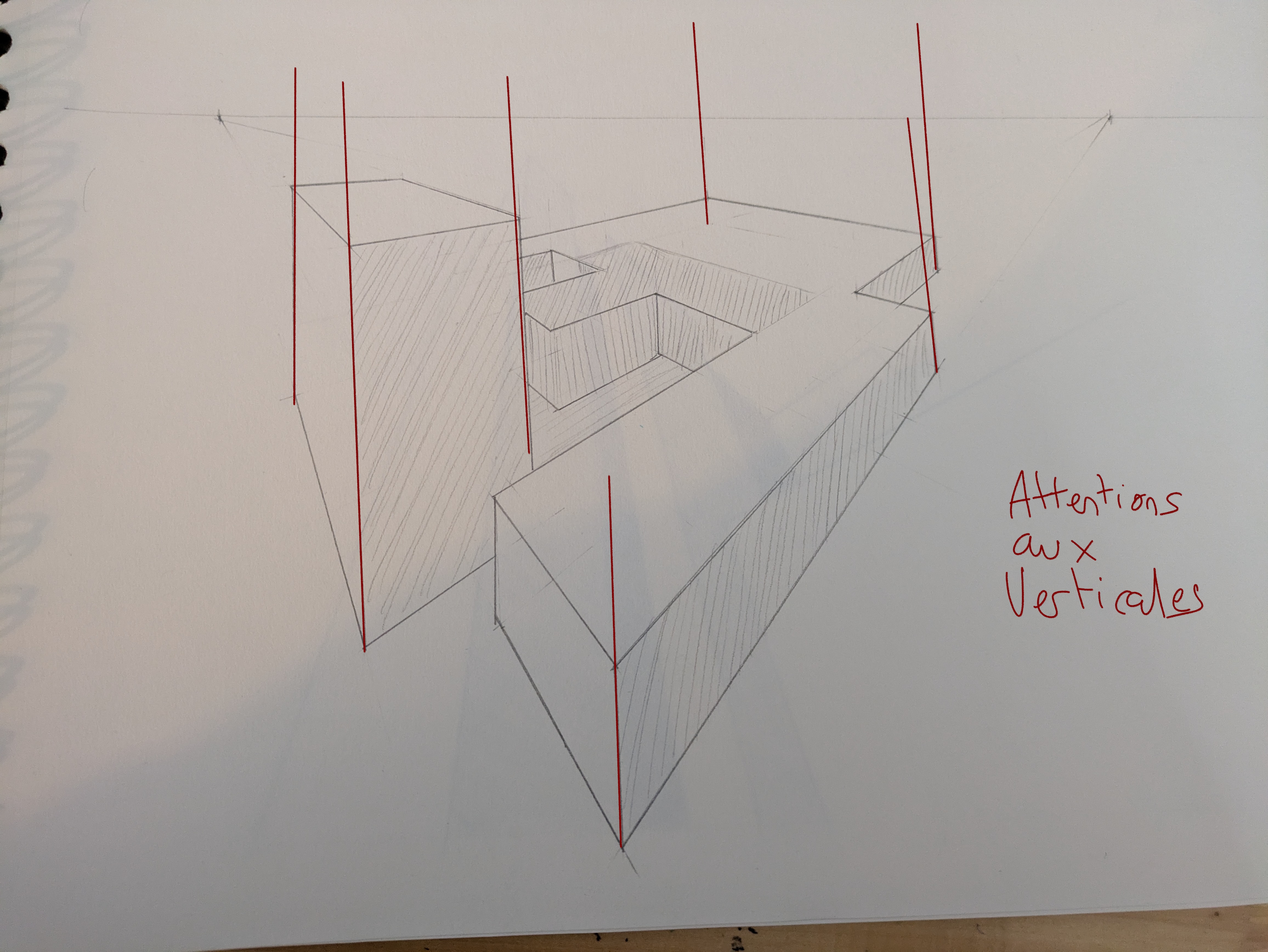 Hallo Sof, du hast die Übung missverstanden. Die Form muss an zwei Punkten am Boden in der Perspektive reproduziert werden. Bei Ihren beiden Übungen haben wir den Eindruck, dass die beiden Formen in der Luft schwebend sind und zwei entgegengesetzte Punkte von Lecks folgen ... Ich hoffe, meine Korrektur wird mehr sprechen! ;)