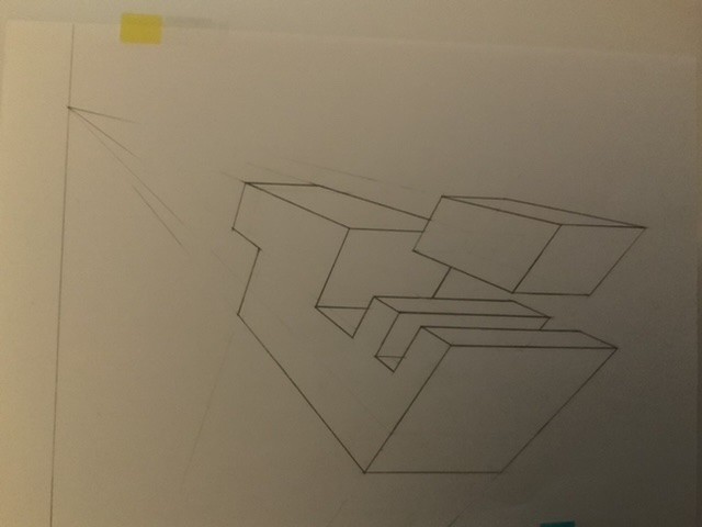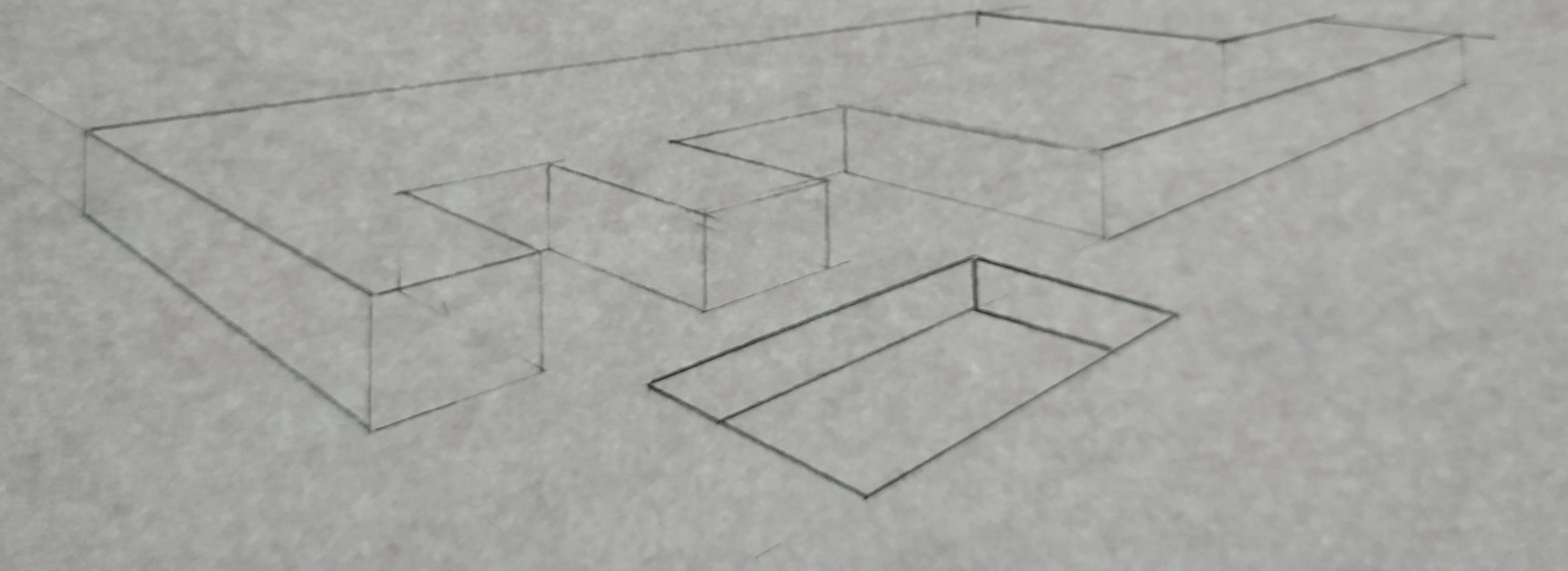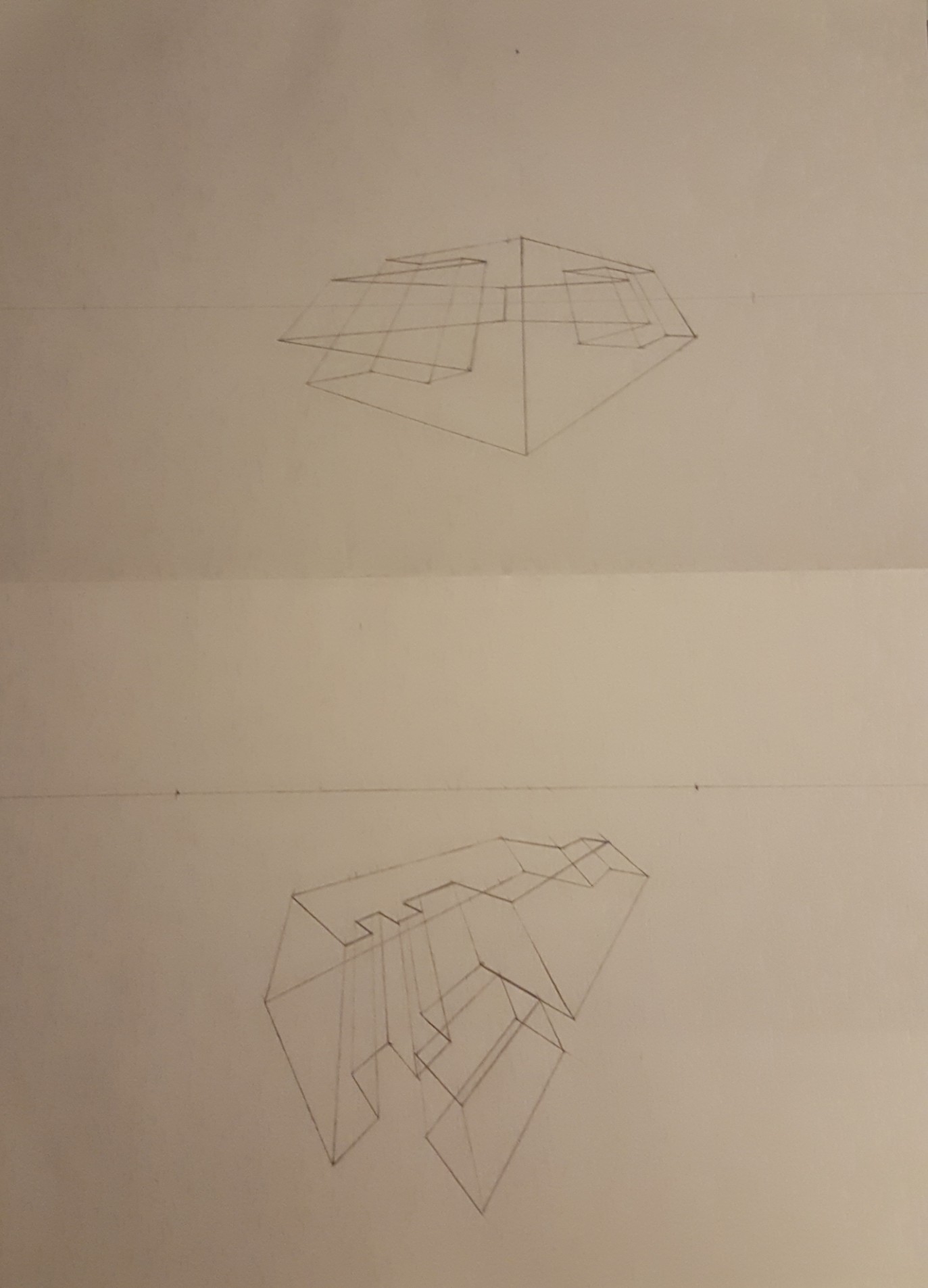 Eh bien c'est une pers' en 3 points de fuites qui fonctionne ! Tu m'as l'air d'avoir tout compris, je te conseillerais juste de repasser un peu plus fort tes contours d'objet et/ou de gommer un peu/complètement tous les points/lignes intérieures que l'on est pas sensé voir. (Bon dans le cas de ta première pers' l'objet n'aurait plus été reconnaissable du tout ahah, mais pour le deuxième ça aurait rajouté beaucoup de clarté car là on s'y perd un peu)