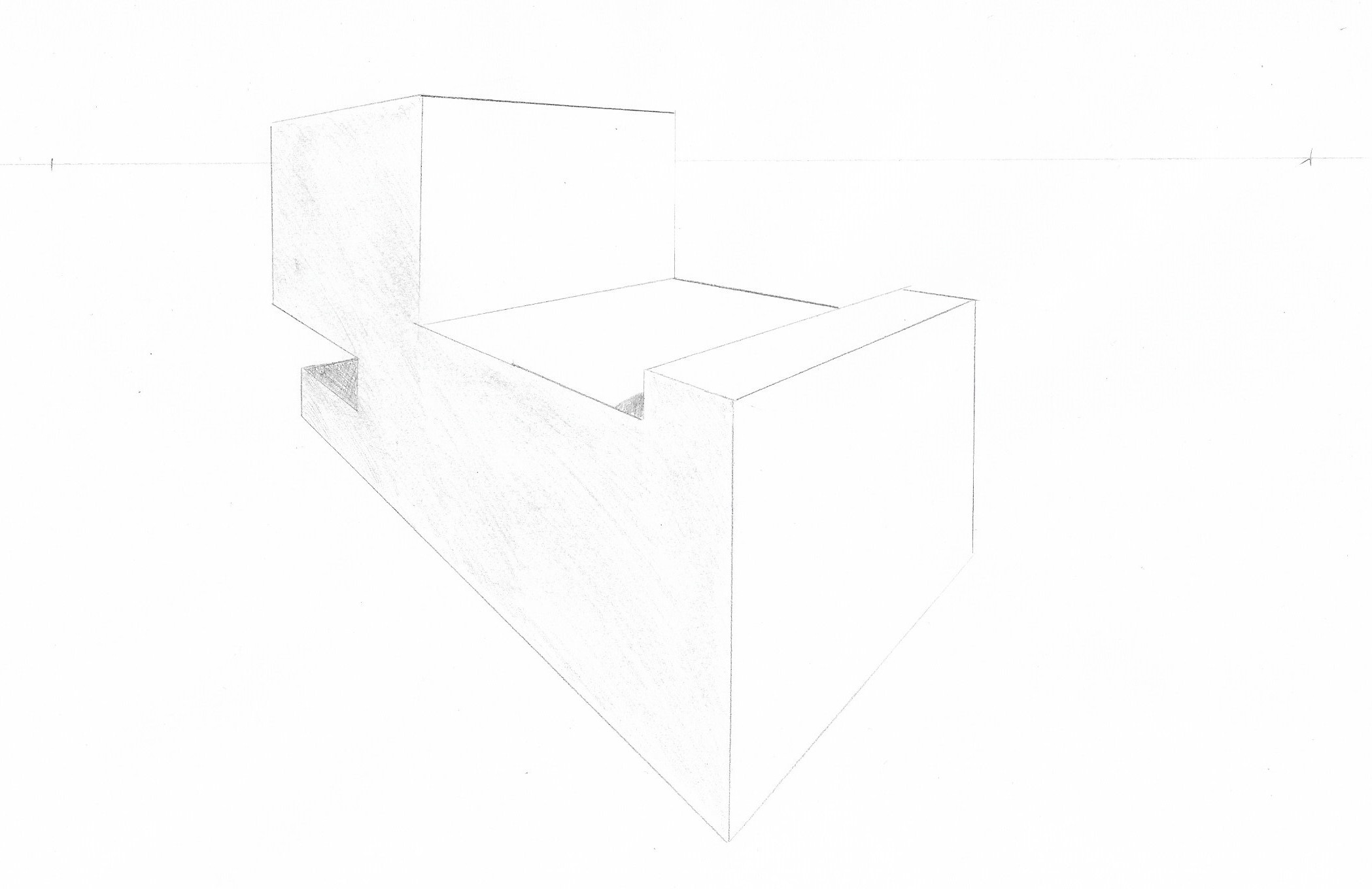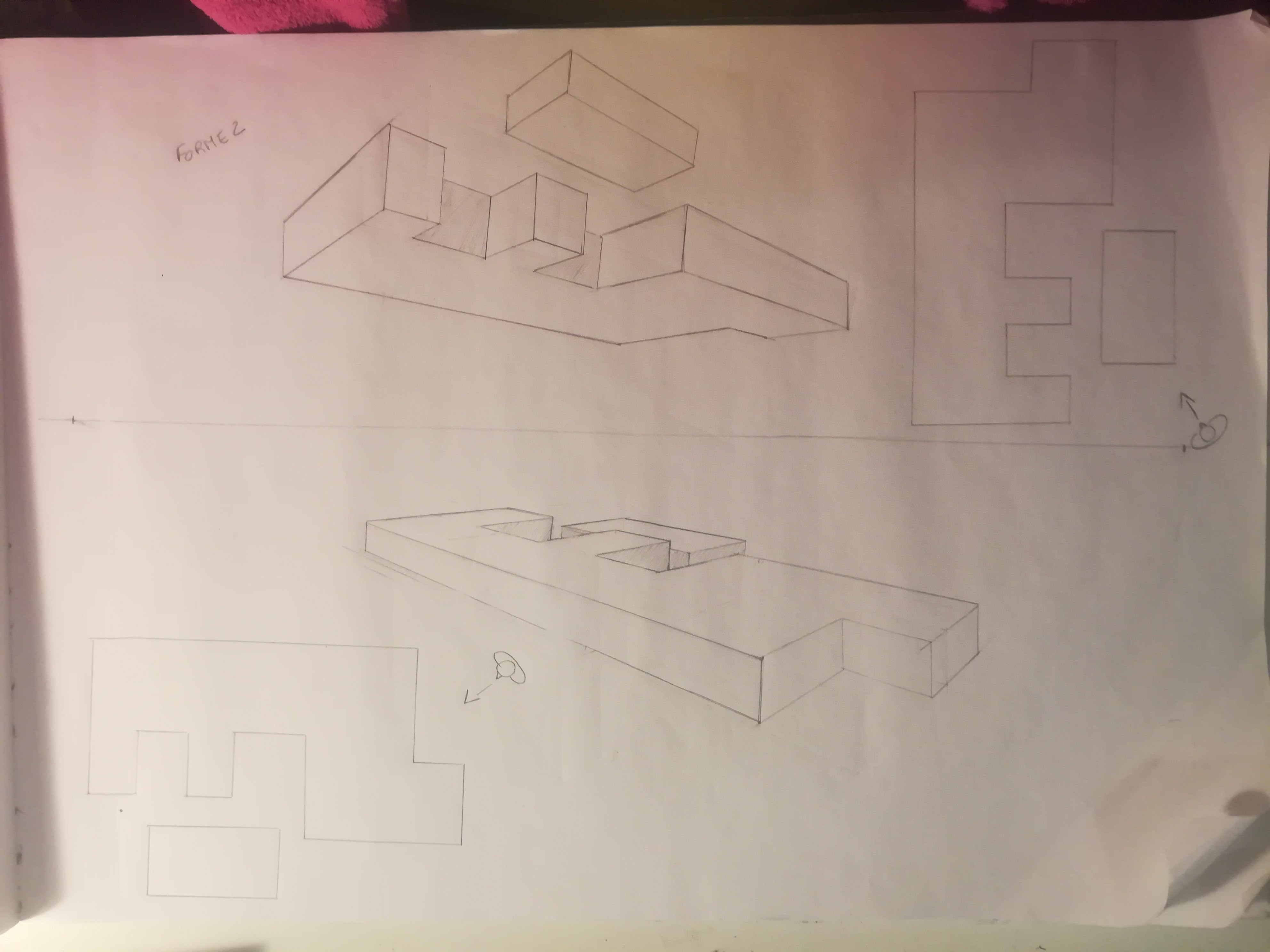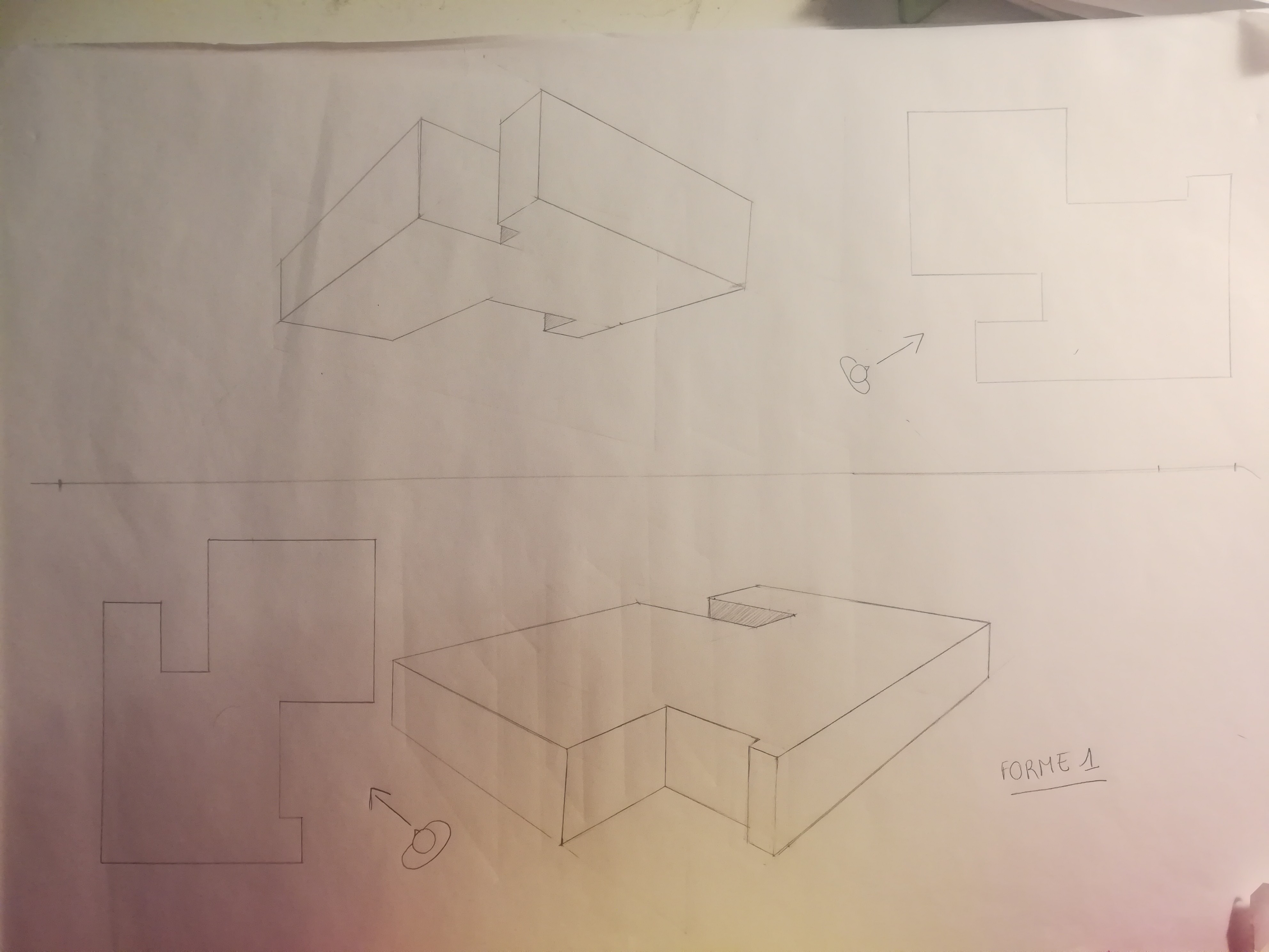 Eh bien c'est une pers' en 3 points de fuites qui fonctionne ! Tu m'as l'air d'avoir tout compris, je te conseillerais juste de repasser un peu plus fort tes contours d'objet et/ou de gommer un peu/complètement tous les points/lignes intérieures que l'on est pas sensé voir. (Bon dans le cas de ta première pers' l'objet n'aurait plus été reconnaissable du tout ahah, mais pour le deuxième ça aurait rajouté beaucoup de clarté car là on s'y perd un peu)