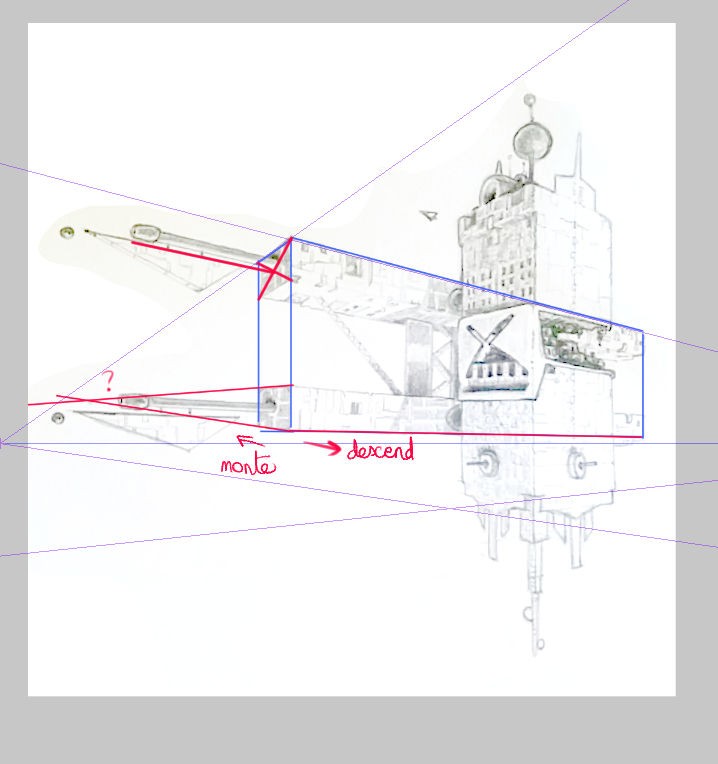 Elle passe pile au milieu du canon du bas. Après j'avoue avoir un peu triché avec la perspective des canons, à la base ils devaient être plus petit mais je trouvais que ça ne donnait pas le résultat que je voulais, alors je les aient rallongés et ils dépassent un peu de mon point de fuite.