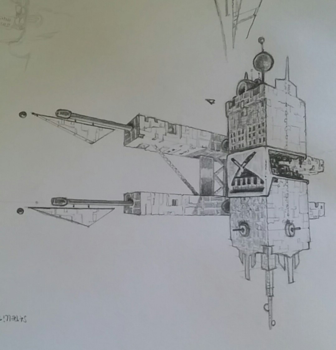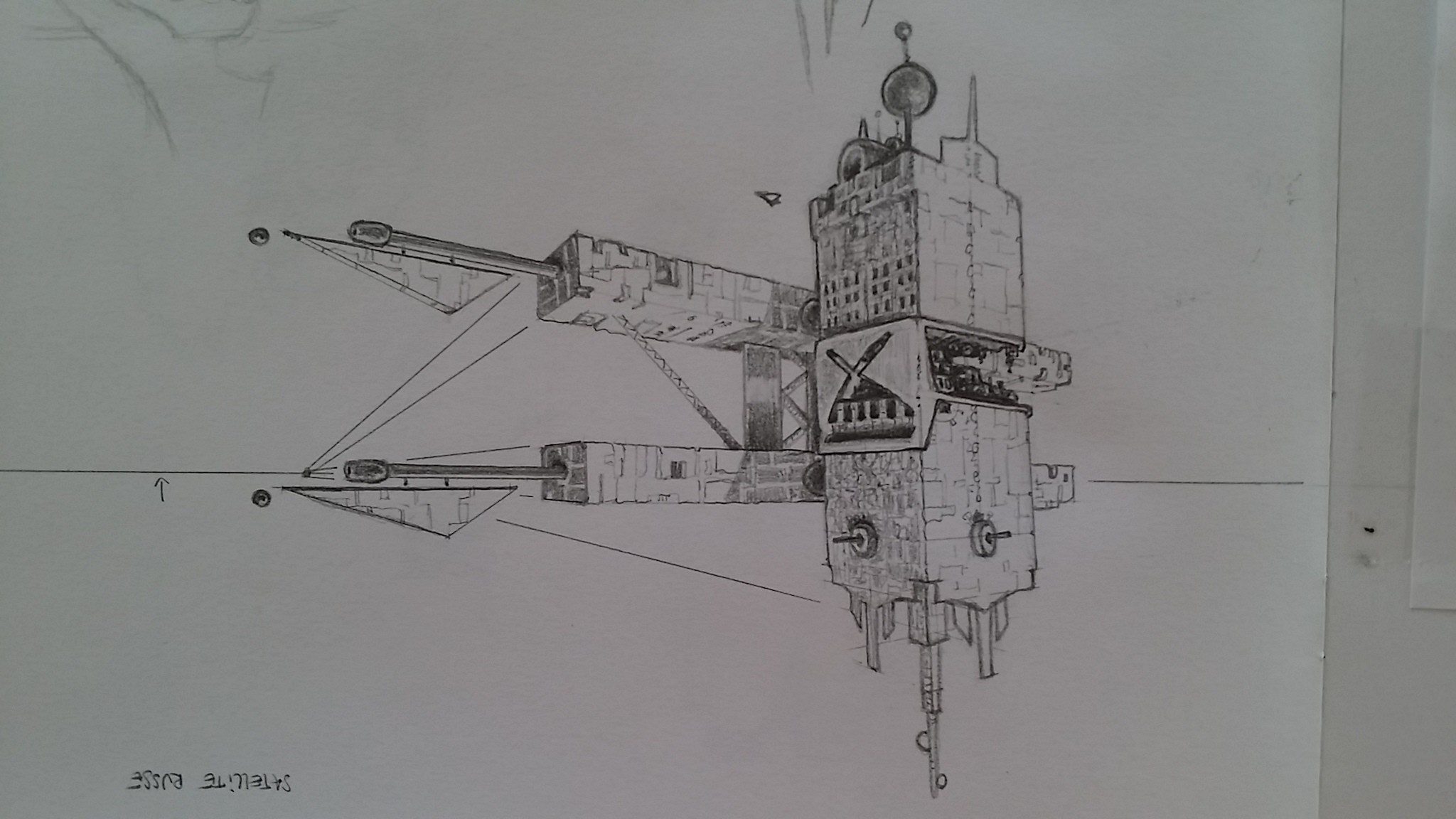 J'ai réalisé un satellite spatial de combat avec 2 points de fuite. Au niveau des ombres j'ai l'impression que c'est pas fini... Mais bon ce n'est pas le sujet. ( Je l'avais dessiné dans l'autre sens mais je trouve qu'il rends mieux comme ça )