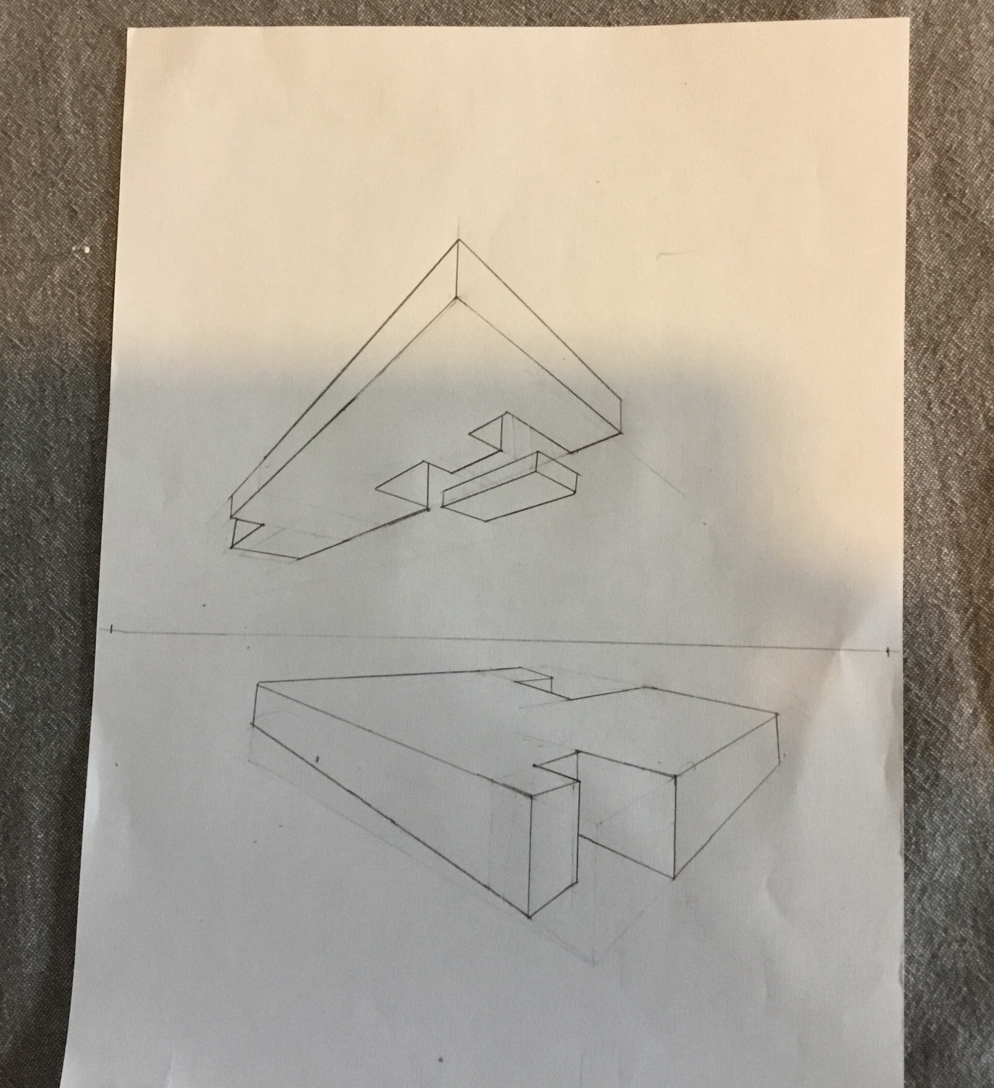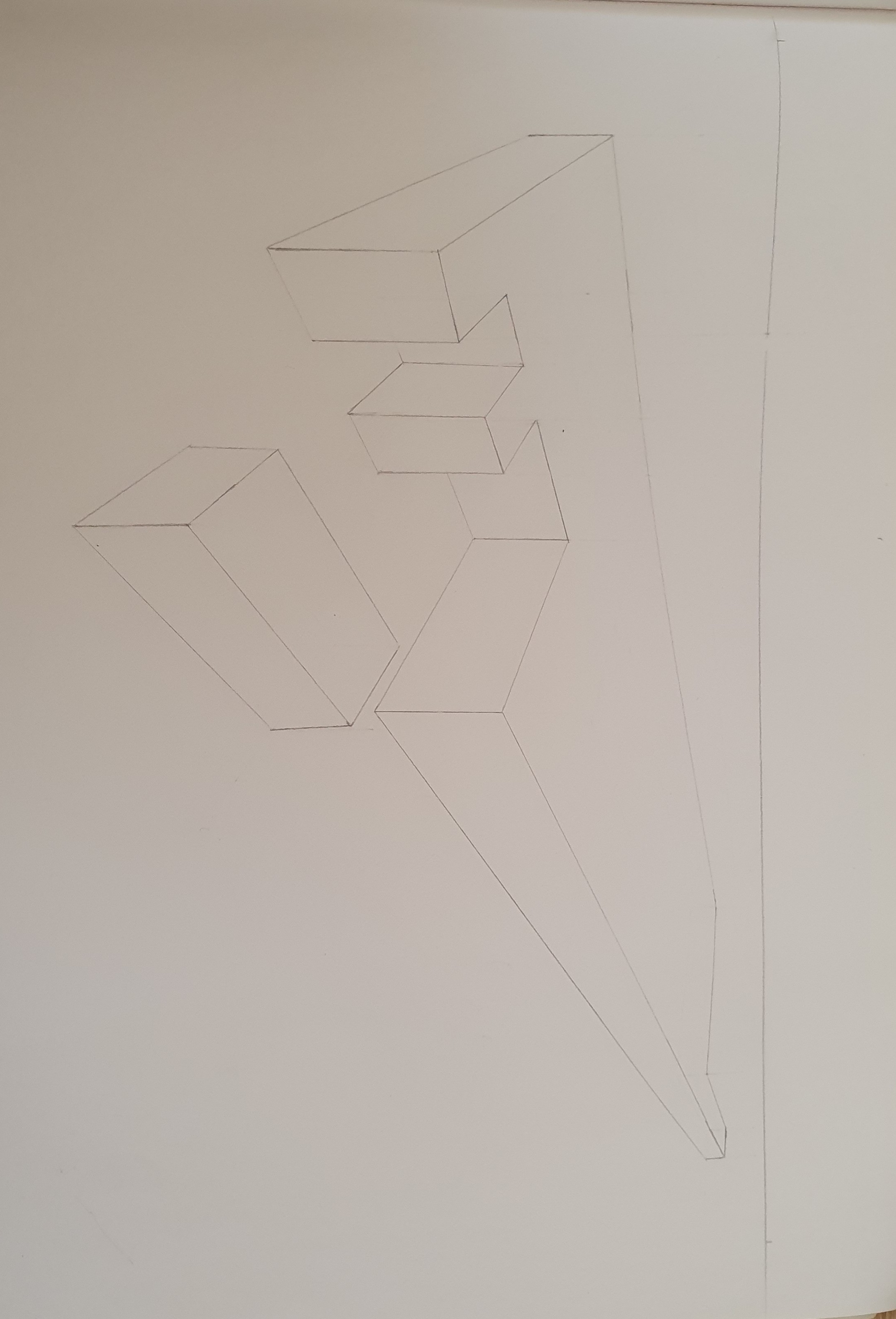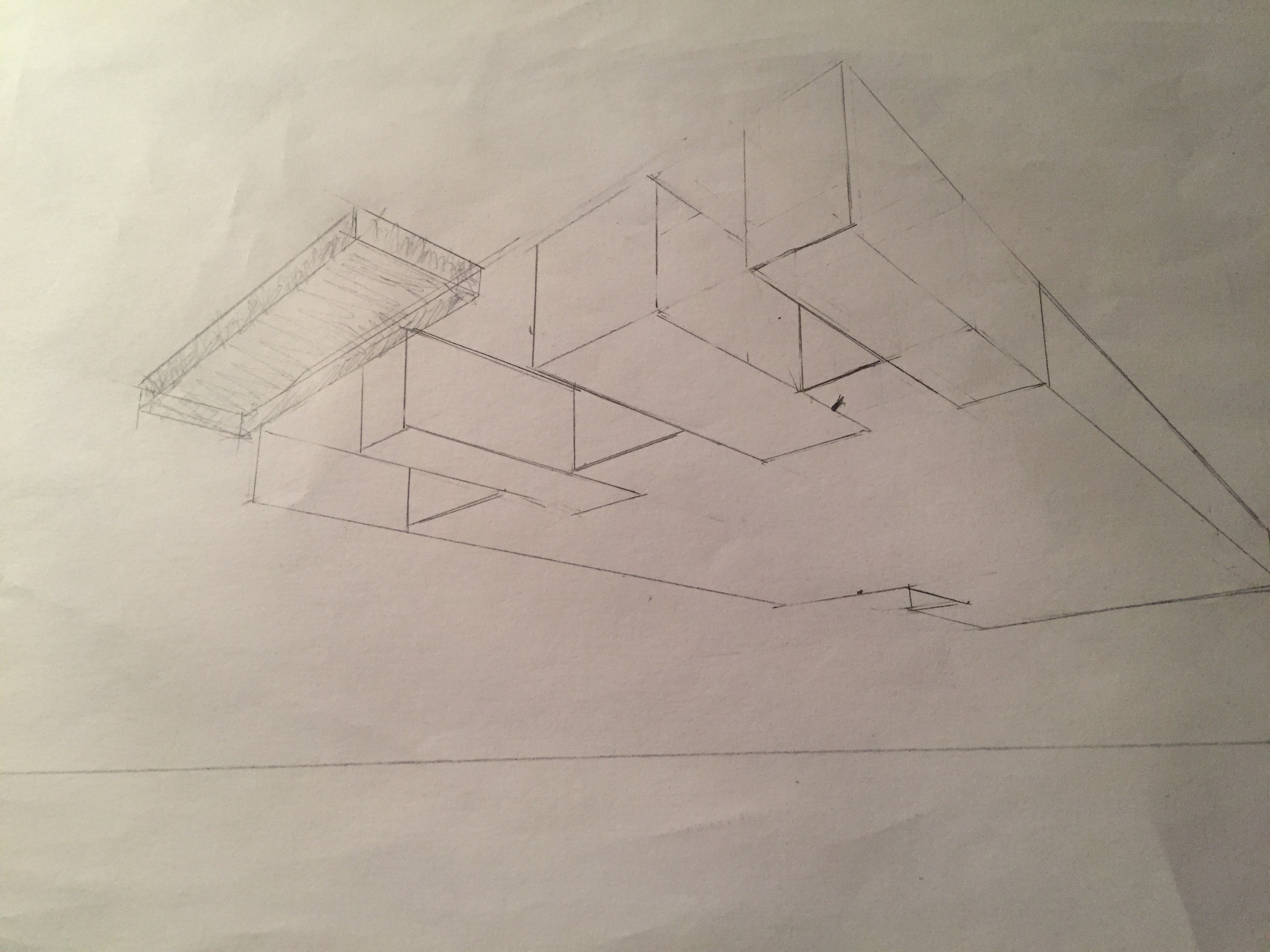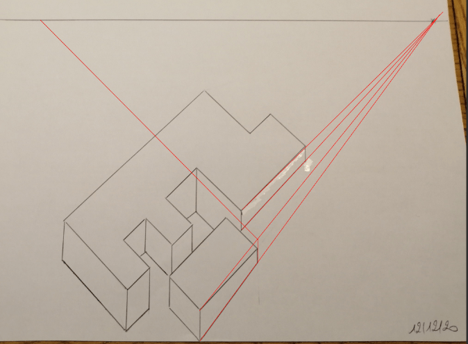 Navrée pour le délai d'attente, j'ai été retenue par les fêtes de fin d'année ^^' . Après réinspection, je comprends ton rendu et pourquoi j'ai bugué sur le nombre de point de fuite... C'est que ta ligne d'horizon est factice, dans le sens où le deuxième point de fuite n'est pas *du tout* dessus mais plus ou moins à l'infini. Pourquoi pas, mais à ce moment là c'est bizarre de tracer la ligne d'horizon.