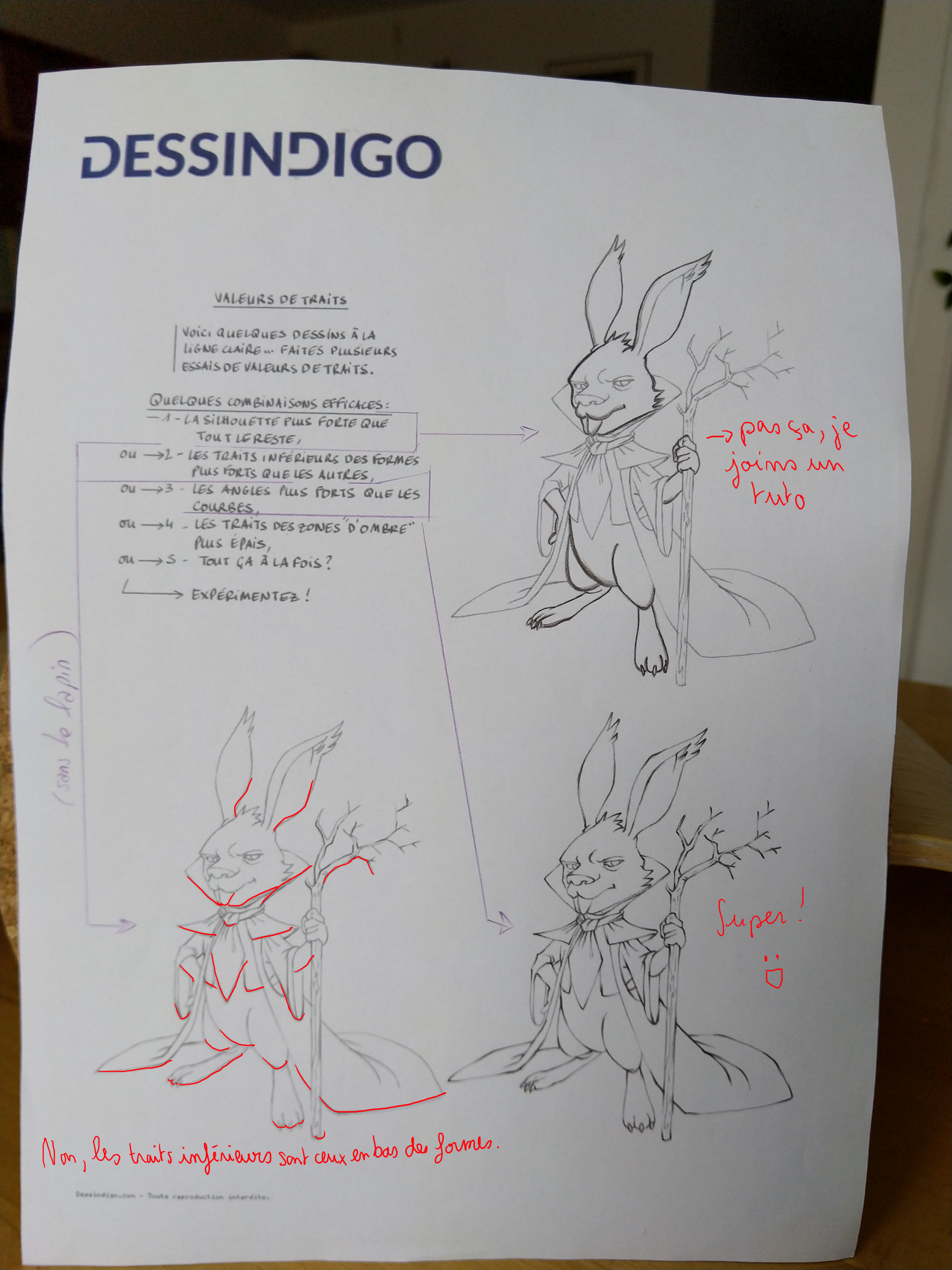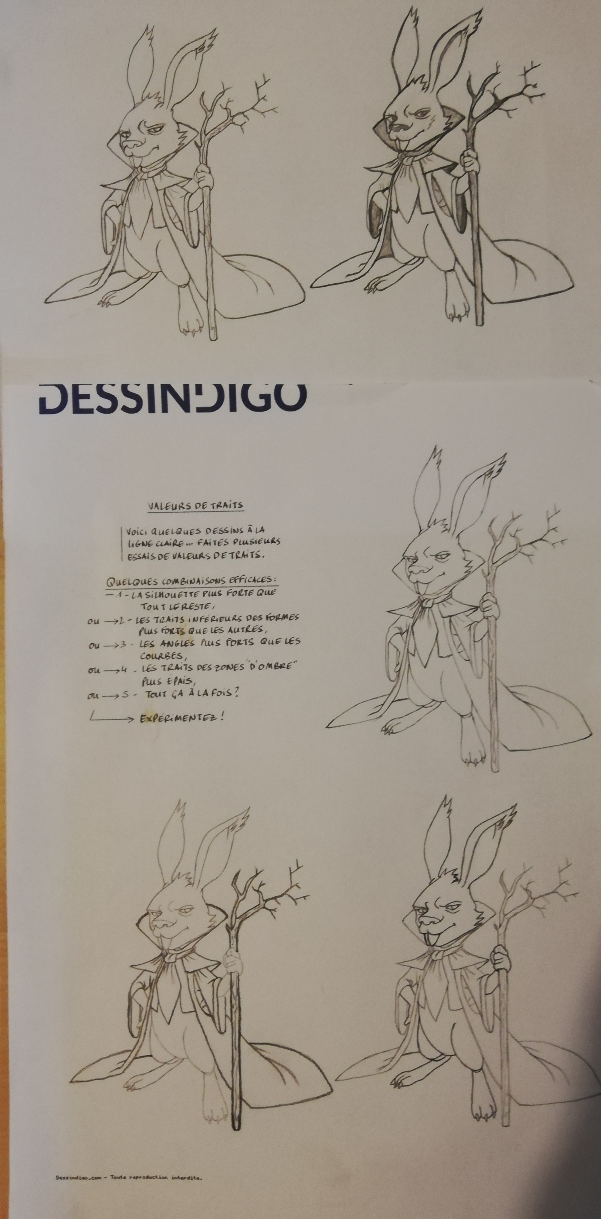 Déjà, le dessin est bien réussi :) Mais effectivement, les valeurs de traits n'ont pas vraiment été utilisées, les traits ont toujours une épaisseur similaire (le problème ne vient pas tant du côté légèrement brouillon, c'est plutôt normal ce n'est pas une mise au propre au stylo). Ce qu'il serait possible de faire c'est de faire une mise au propre au stylo à la ligne claire (donc sans changer d'épaisseur), sur une feuille différente si tu as une table lumineuse, ou bien directement sur le dessin. Ensuite scanner ça et imprimer ça en plusieurs fois, et faire l'exercice comme avec le lapin en venant épaissir les traits par dessus le dessin à la ligne claire. Essayer de mettre en valeur la silhouette extérieure, puis sur d'autres les angles (formés par tous les croisements de lignes), les ombres, les traits inférieurs des formes... Voir chaque type de valeur de traits peut aider à retenir les notions et les réutiliser.