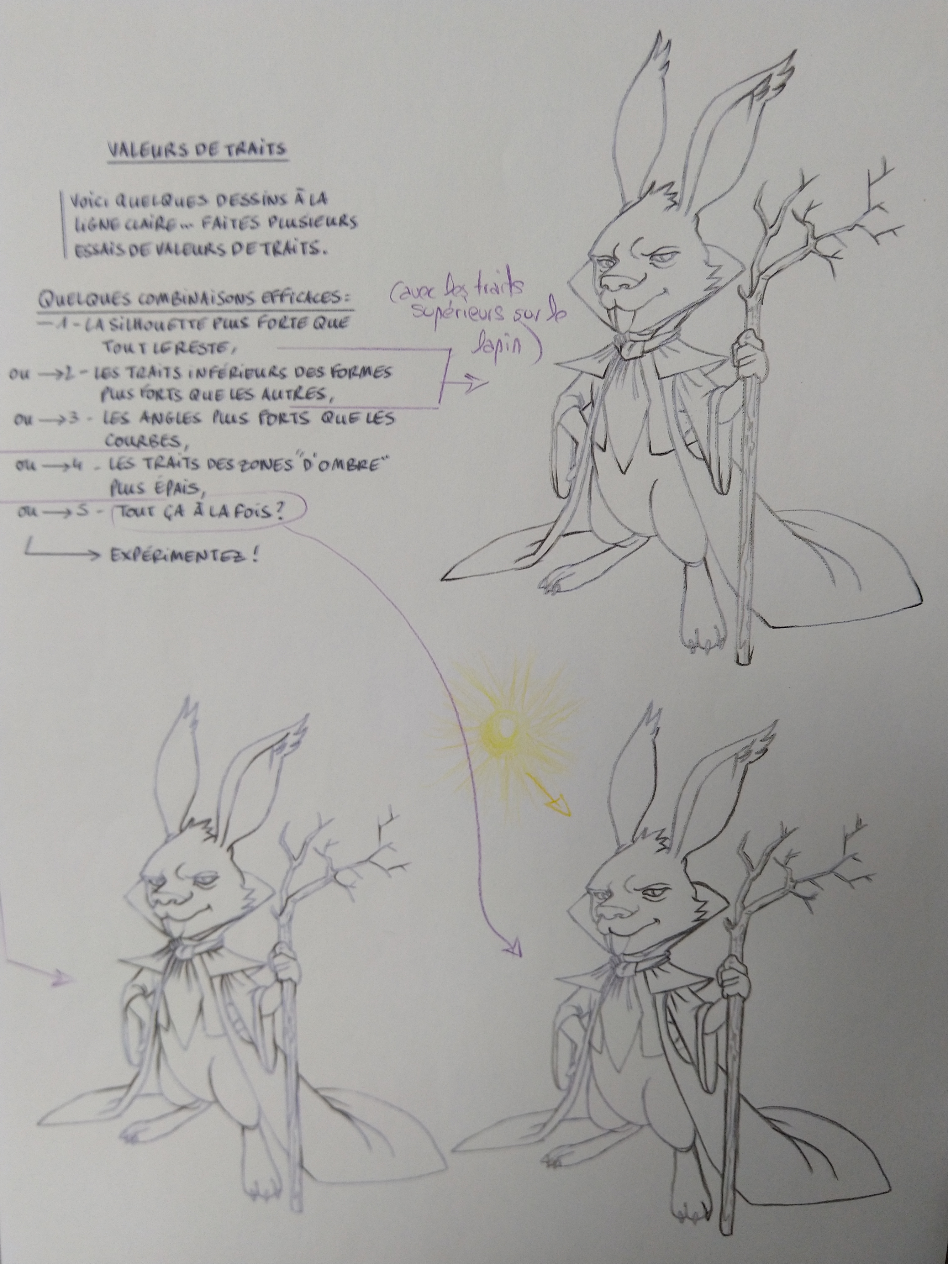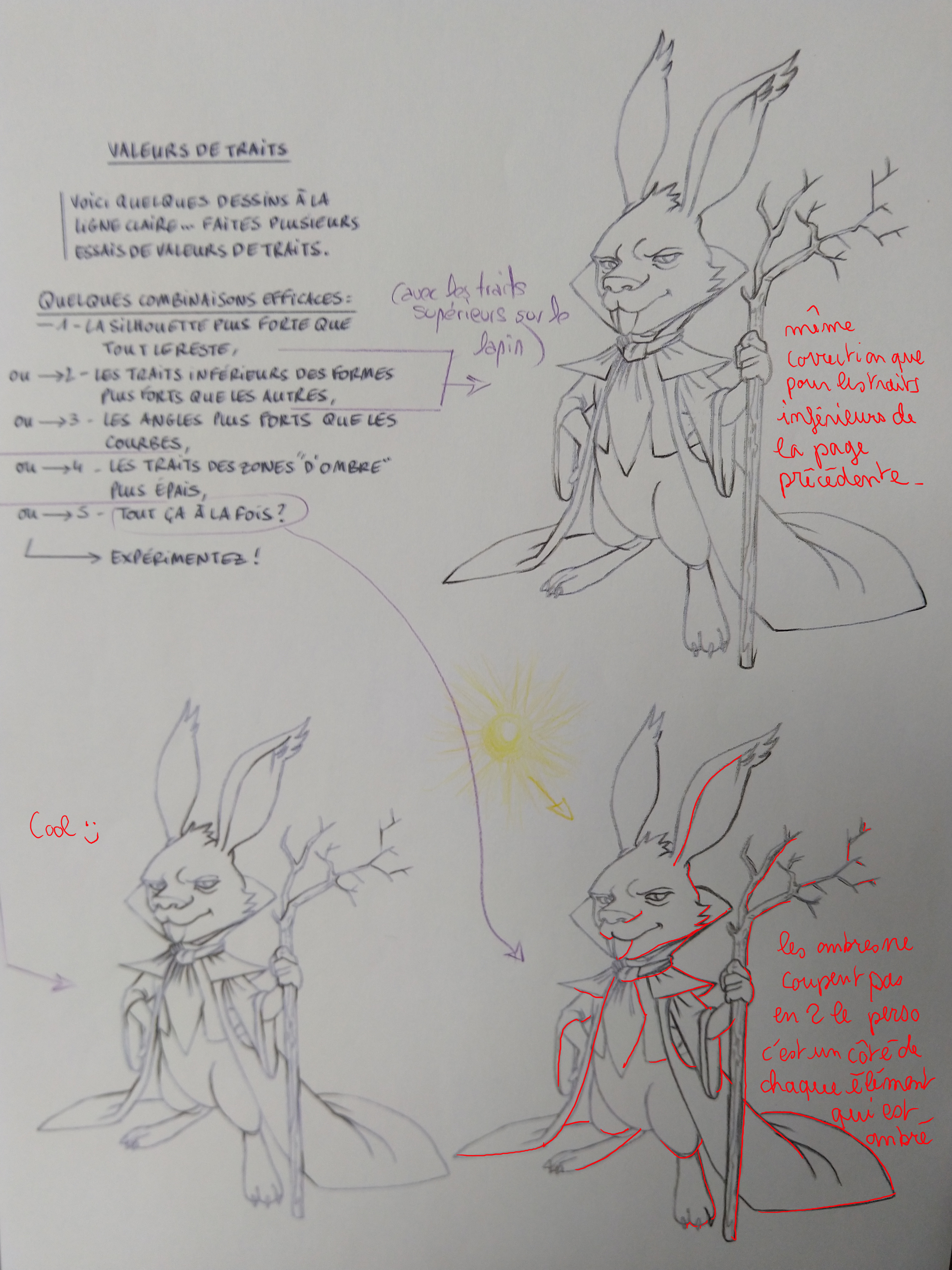 Das Prinzip der Verdickungen ist enthalten :) Ich denke jedoch, dass Sie das Thema ein wenig nehmen müssen. Achten Sie auf die Funktionen von Mate, die sie zu einer kleinen Jacke machen. Wenn Sie zurückkehren möchten, müssen Sie darauf achten, dass es gut über der bereits bestehenden Linie geht. Andernfalls ist es für die Silhouette der äußere Umriss des gesamten Kaninchens mit seiner Kleidung, die verbessert werden muss, ich füge ein erklärendes Tutorial für das 2. Kaninchen bei, ich nehme an, dass es die Arbeit der Schatten betrifft. Achten Sie darauf, nicht nur die Mulden zu verdicken, sondern auch an eine Lichtrichtung. Alle Merkmale der verschiedenen Elemente, die nicht das Licht haben, das es trifft, werden verdickt. Es ist möglich, auch andere Kaninchen nach anderen Anweisungen auszuprobieren. Mut, es ist auf dem richtigen Weg :)