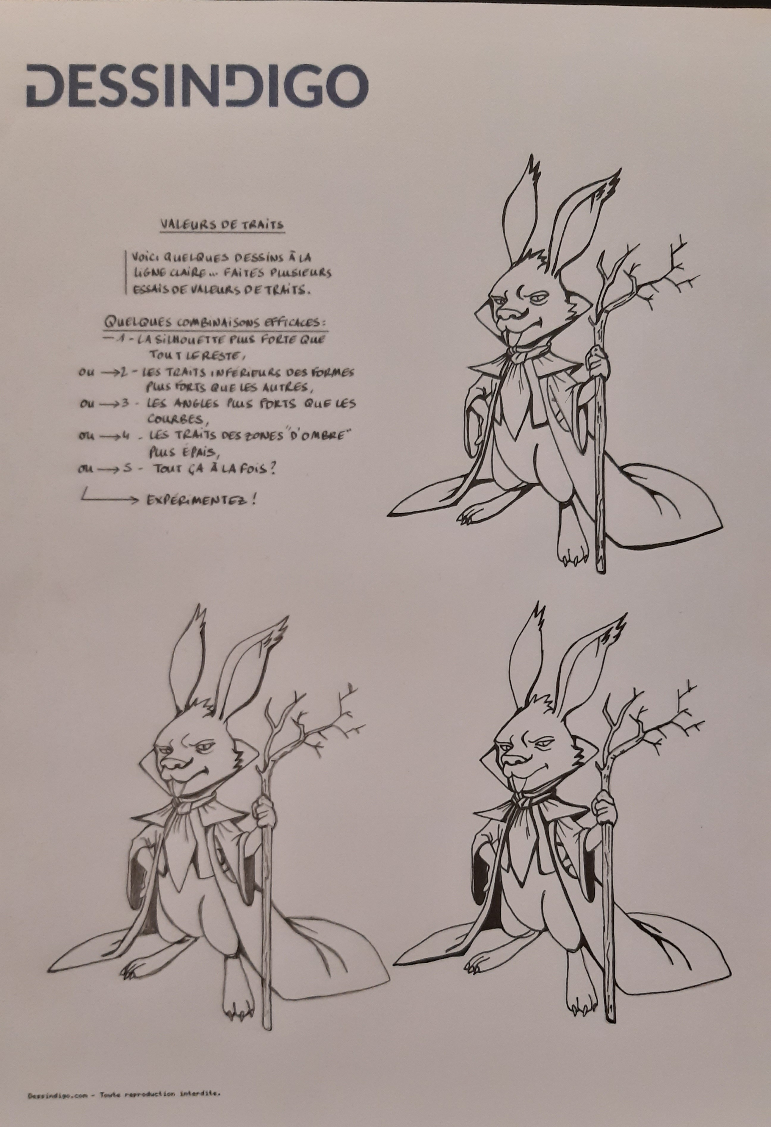 Er ist schon gut erfolgreich :) Aber in der Tat wurden die Linien von Linien nicht wirklich verwendet, die Linien haben immer eine ähnliche Dicke (das Problem ist nicht so sehr auf der leicht rauen Seite, es ist ziemlich normal, dass sie im Stift nicht sauberer ist). Es wäre möglich, eine Reinigung des Stifts an die klare Linie zu reinigen (daher ohne sich zu ändern), auf einem anderen Blatt, wenn Sie einen leichten Tisch haben, oder direkt auf der Zeichnung. Scannen Sie das dann und drucken Sie es mehrmals ein und machen Sie die Übung wie beim Kaninchen, indem Sie die Linien über der Zeichnung auf der klaren Linie verdicken. Der Versuch, die äußere Silhouette zu verbessern, dann auf anderen die Winkel (gebildet durch alle Linienübergänge), Schatten, niedrigere Formenlinien ... siehe jede Art von Linienwert kann helfen, sich an die Vorstellungen zu erinnern und sie wieder zuverwenden.