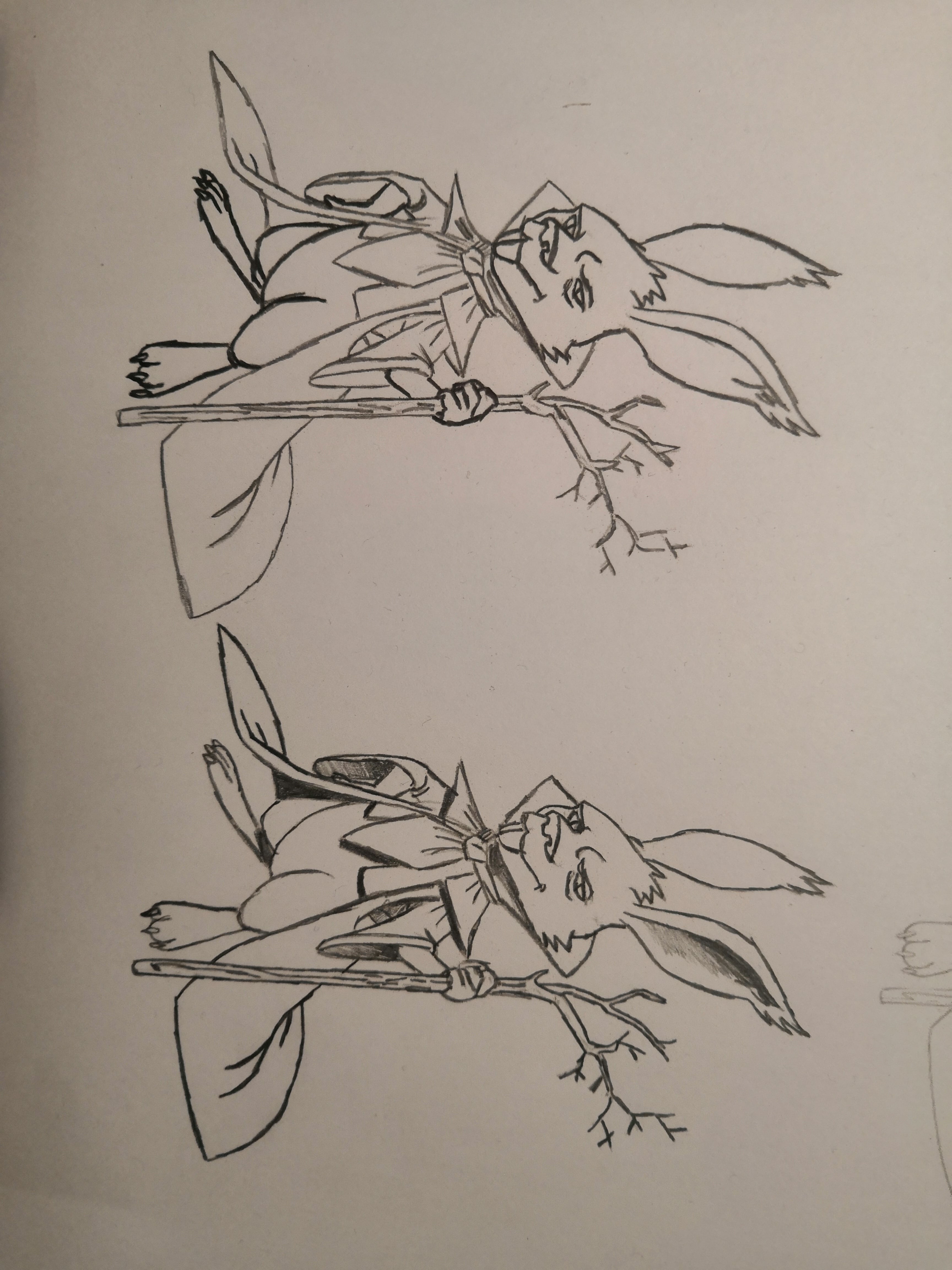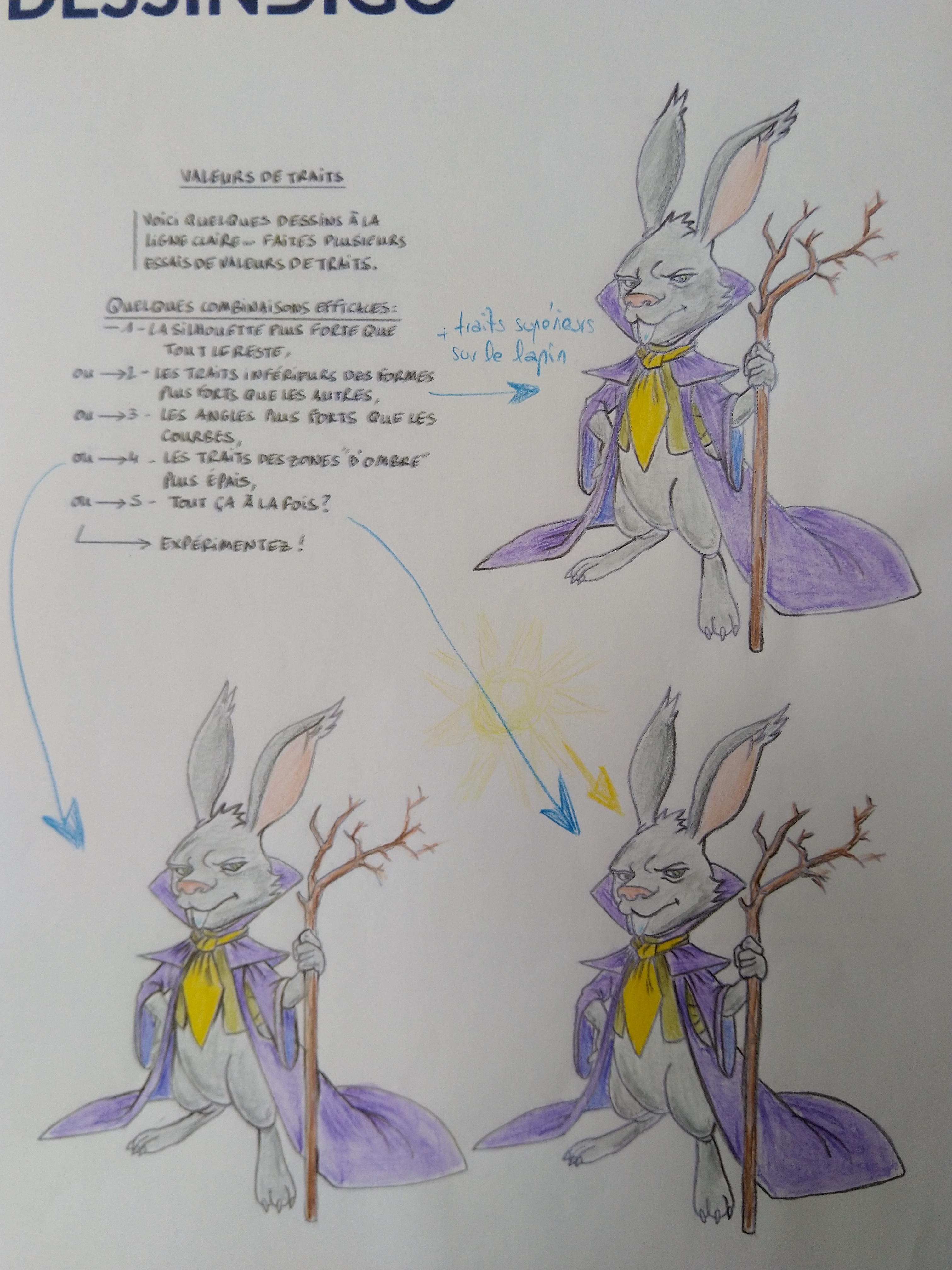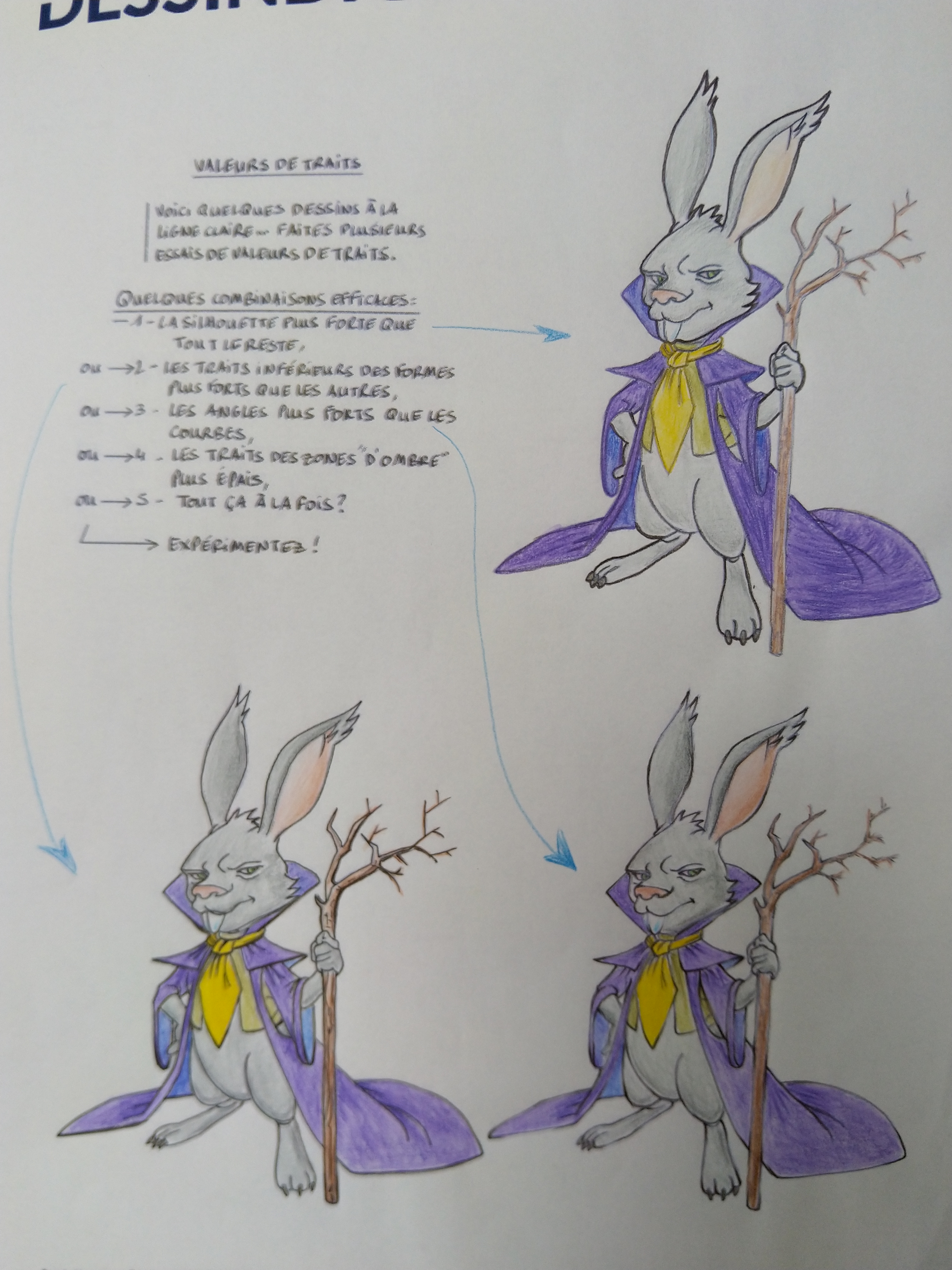 Il y a de belles choses :) Les angles sont bien mis en valeur sur le 1er lapin de la 2ème feuille :) Pour ce qui est des silhouettes je ne pense aps que la consigne ait été comprise. Ce n'est pas mettre en valeur le lapin ou ses vêtements qui est demandé. Je joins un tuto explicatif :) Mélanges intéressants pour les 2 premiers lapins :)