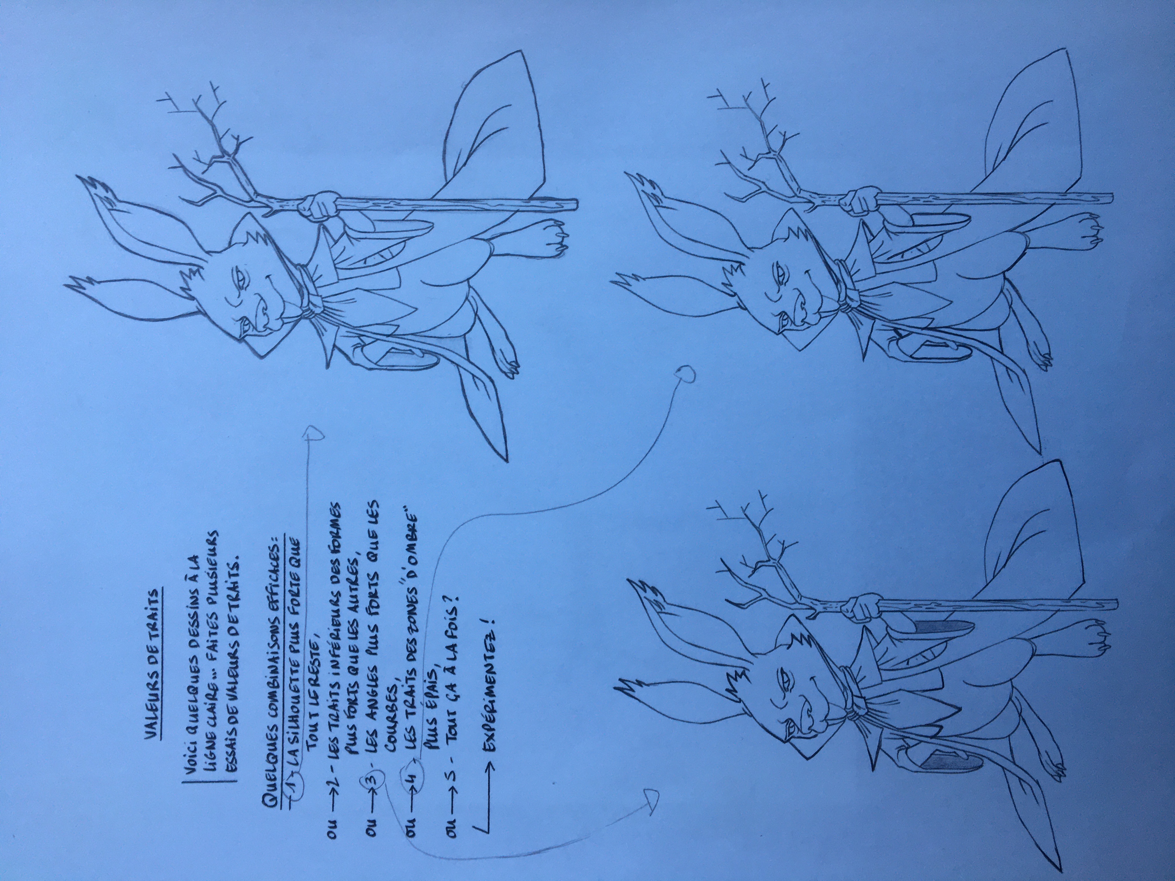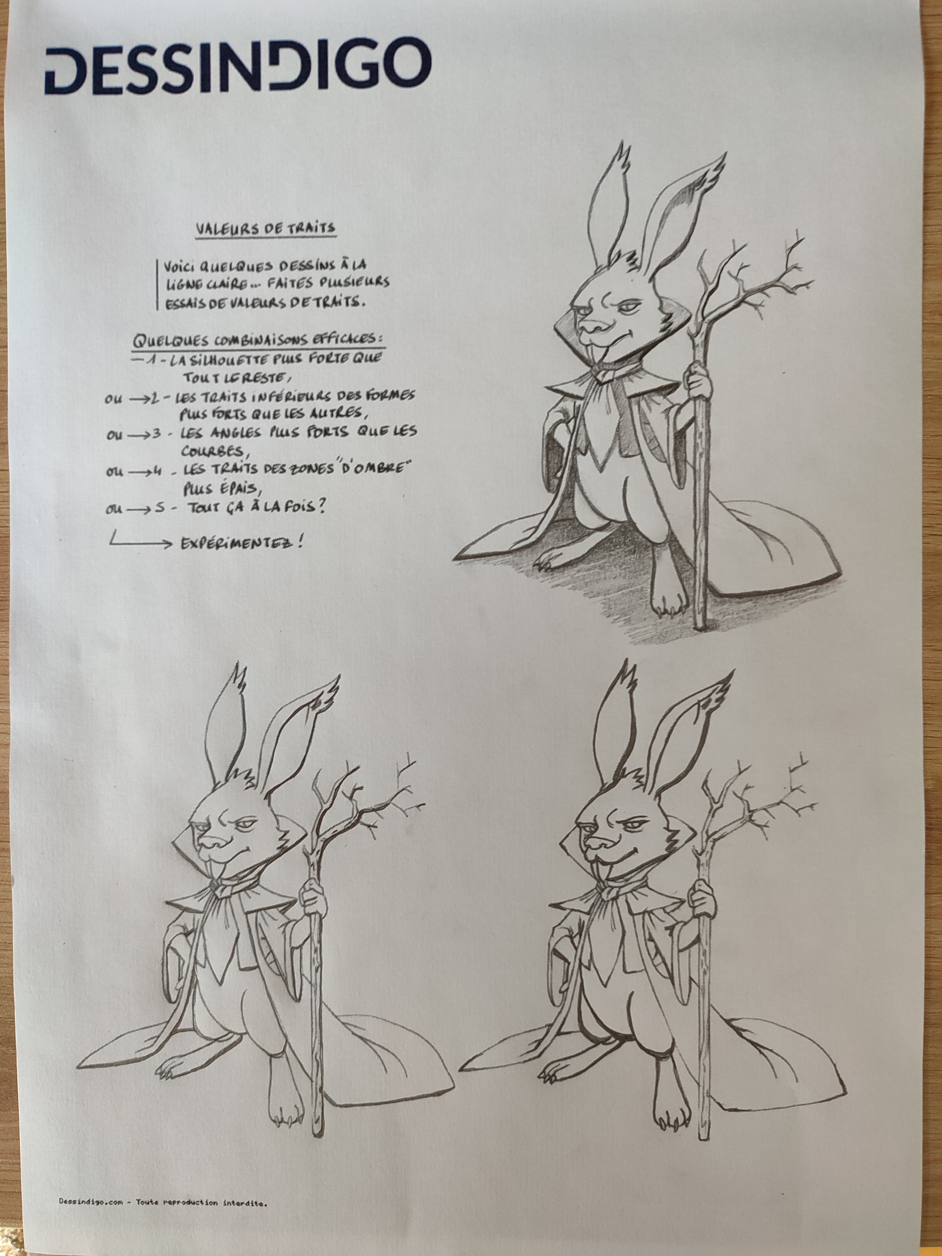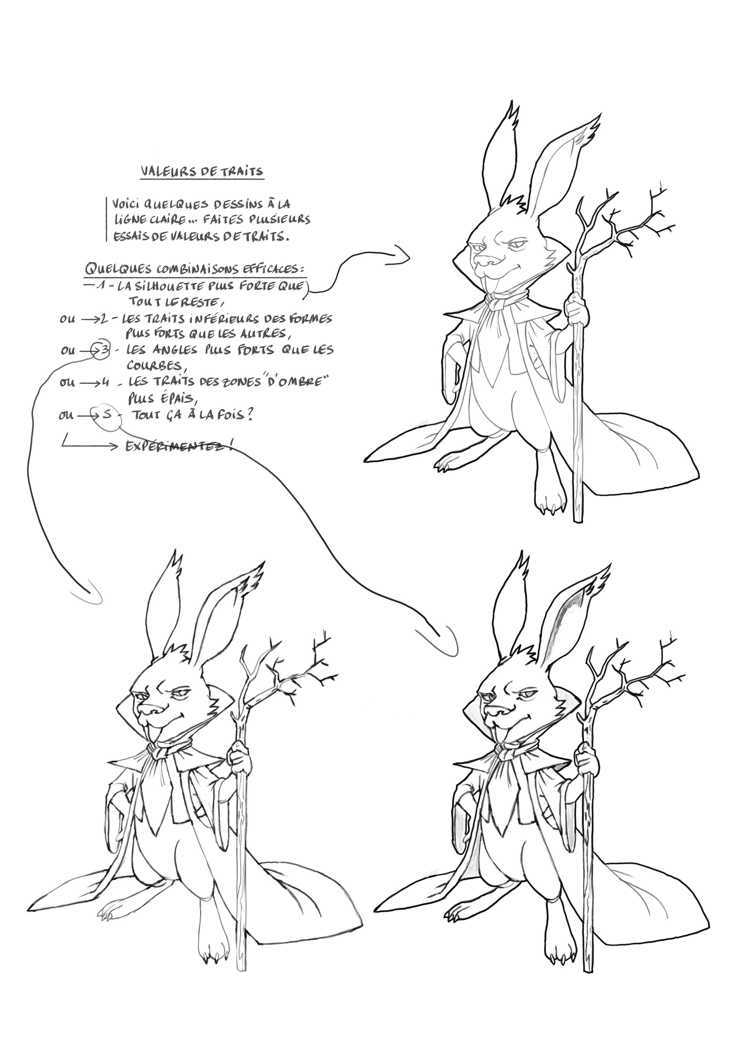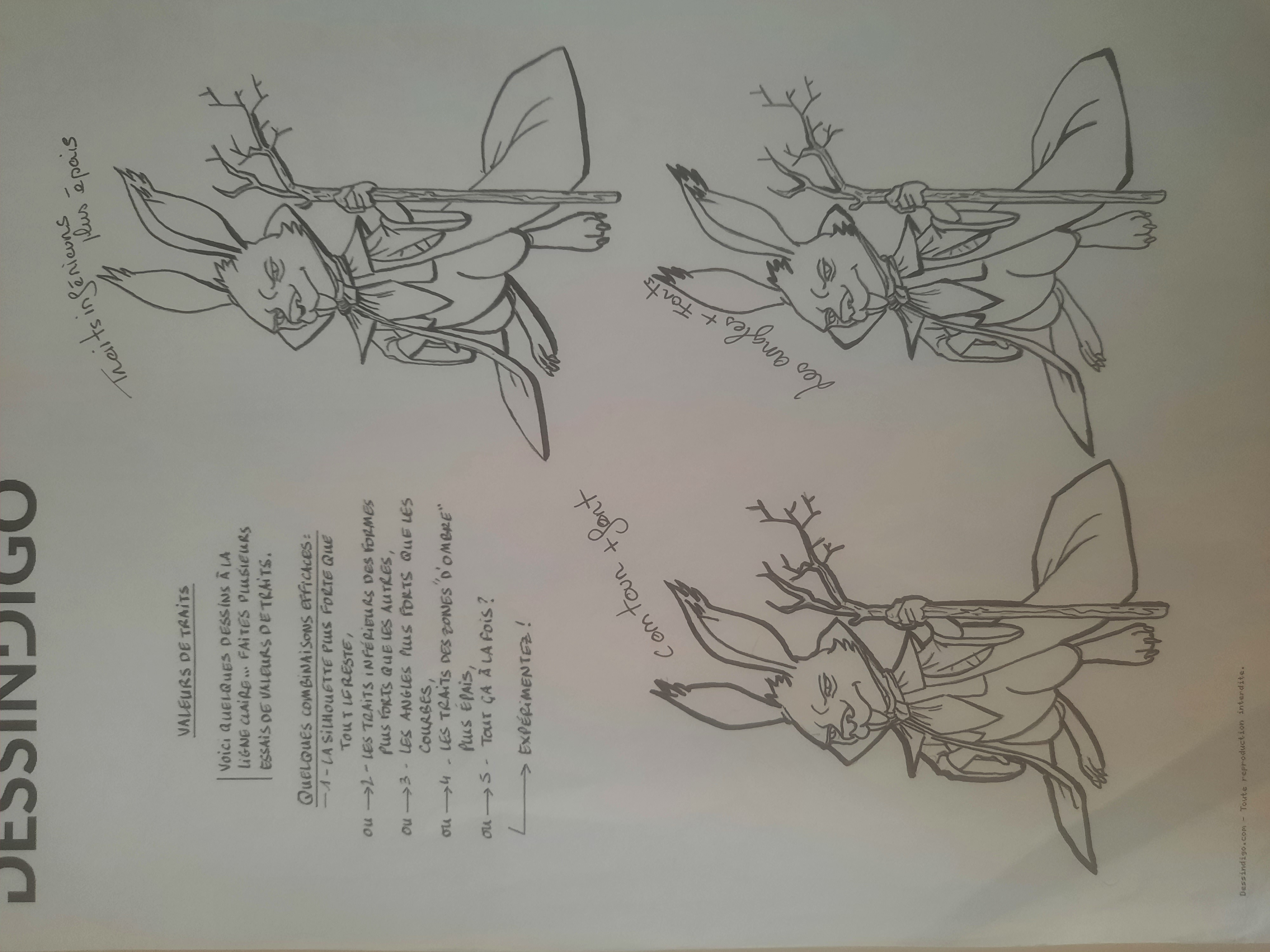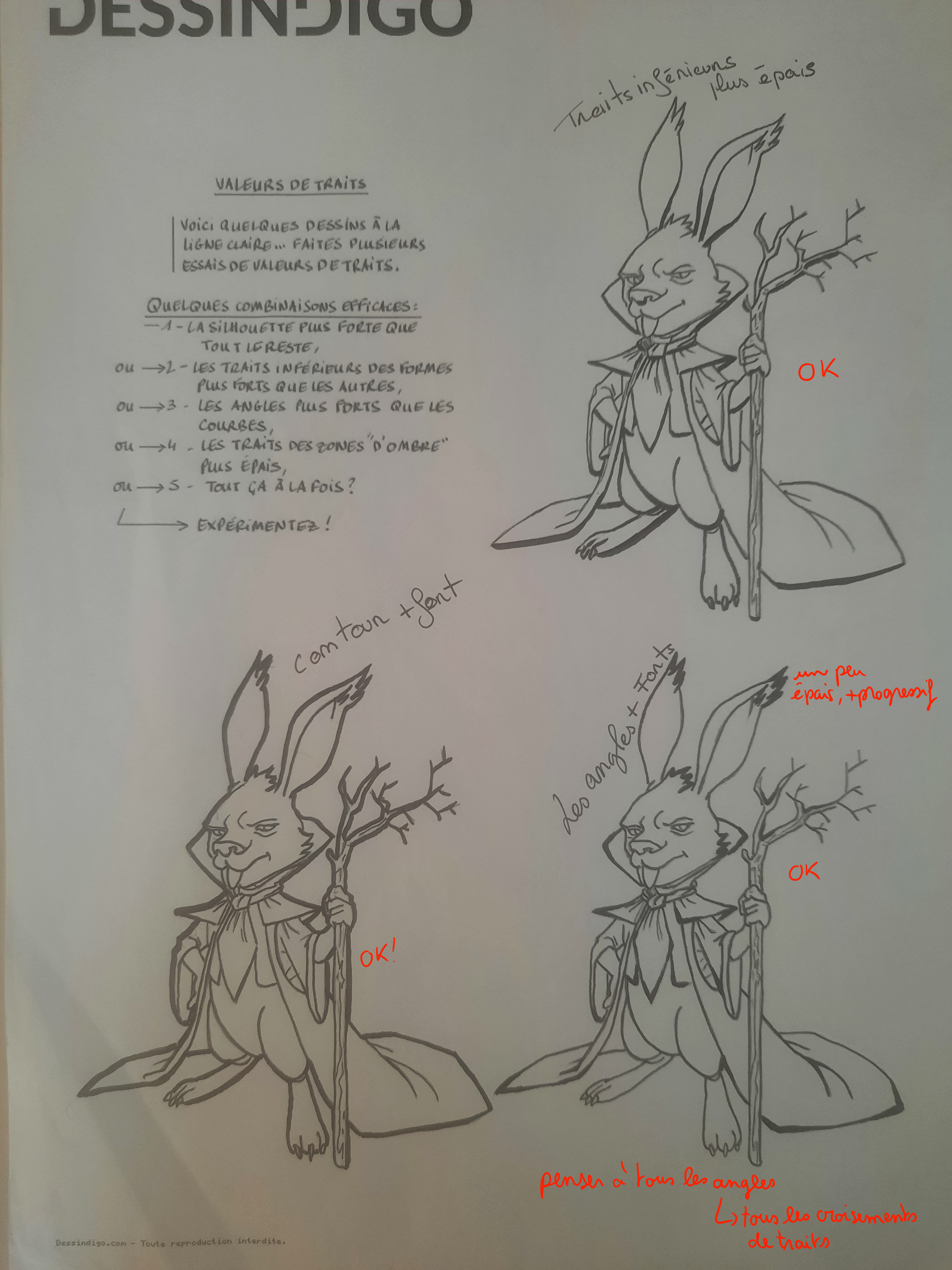 La silhouette c'est compris, il y a juste un oubli que j'ai marqué sur le dessin. Pour les angles c'est compris, mais il en manque : il faut penser que tous les croisements de lignes forment des angles, et tous les accentuer permet plus d'homogénéité. Pour le dernier qui concerne les ombre, le but n'est pas d'accentuer uniquement les zones creuses mais de penser à une direction de lumière, et accentuer les traits des zones qui ne sont pas touchées par la lumière. Ce n'est donc pas tout à fait compris sur ce lapin là. En tous cas le principe des valeurs de trait est compris :)