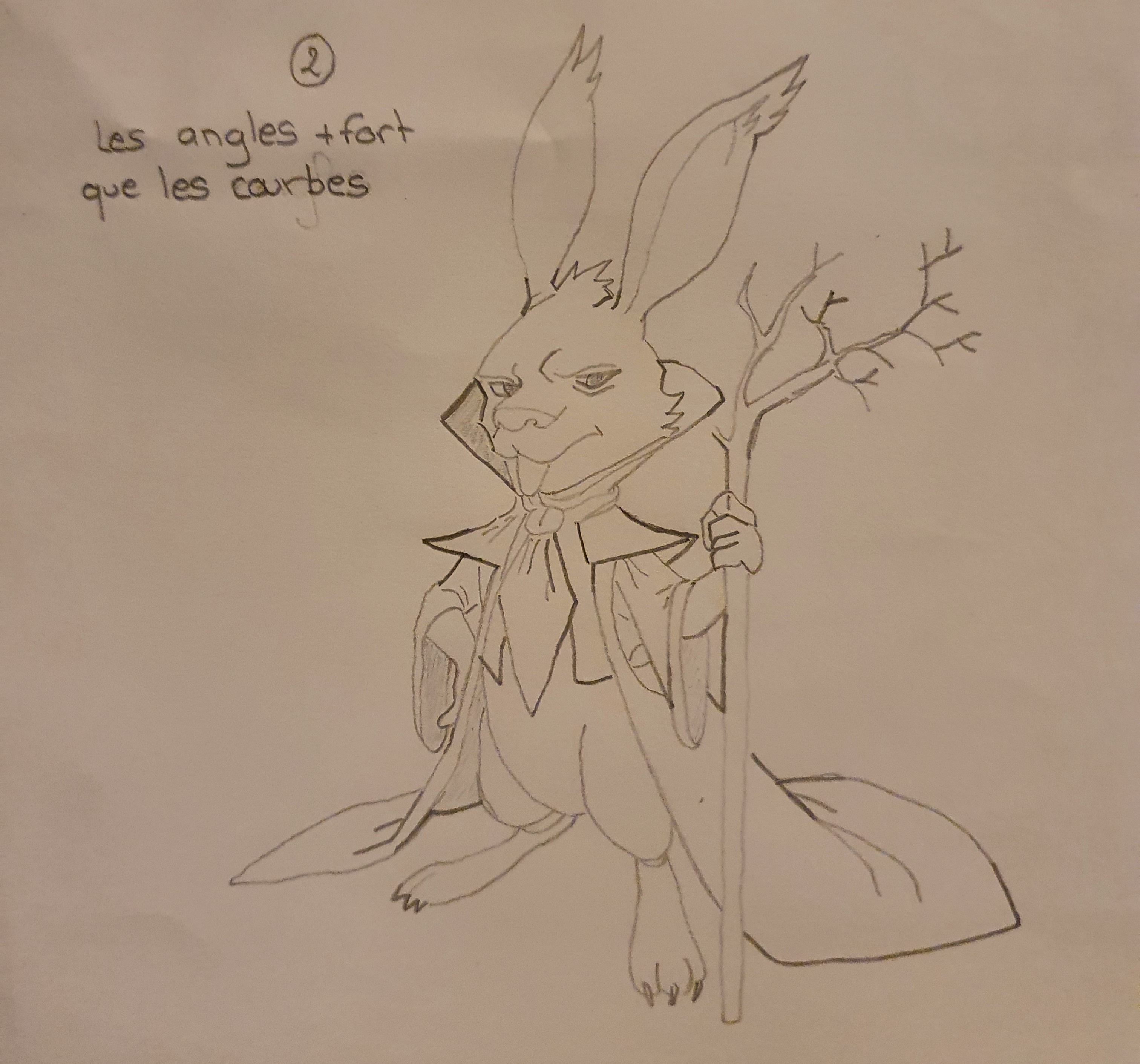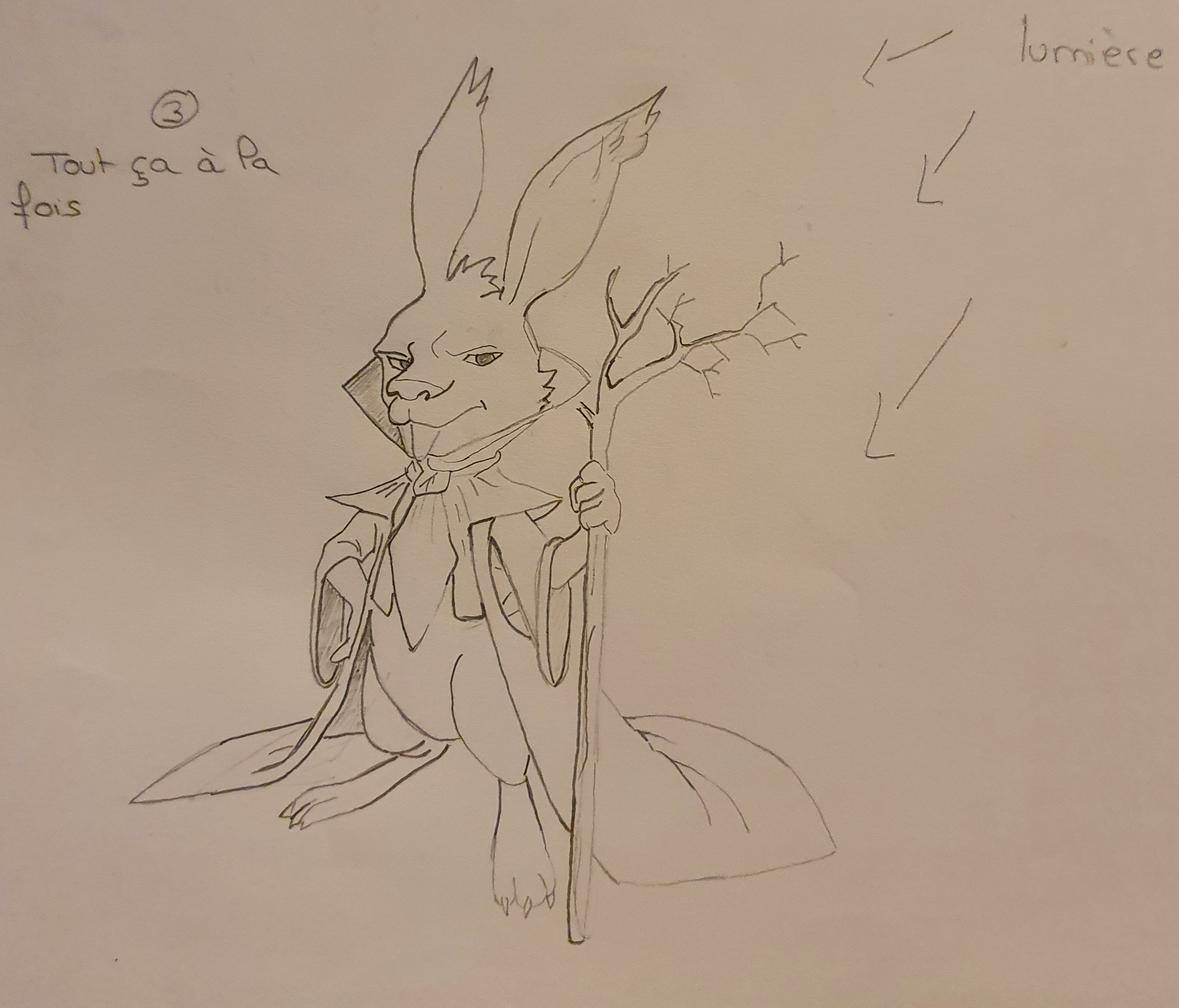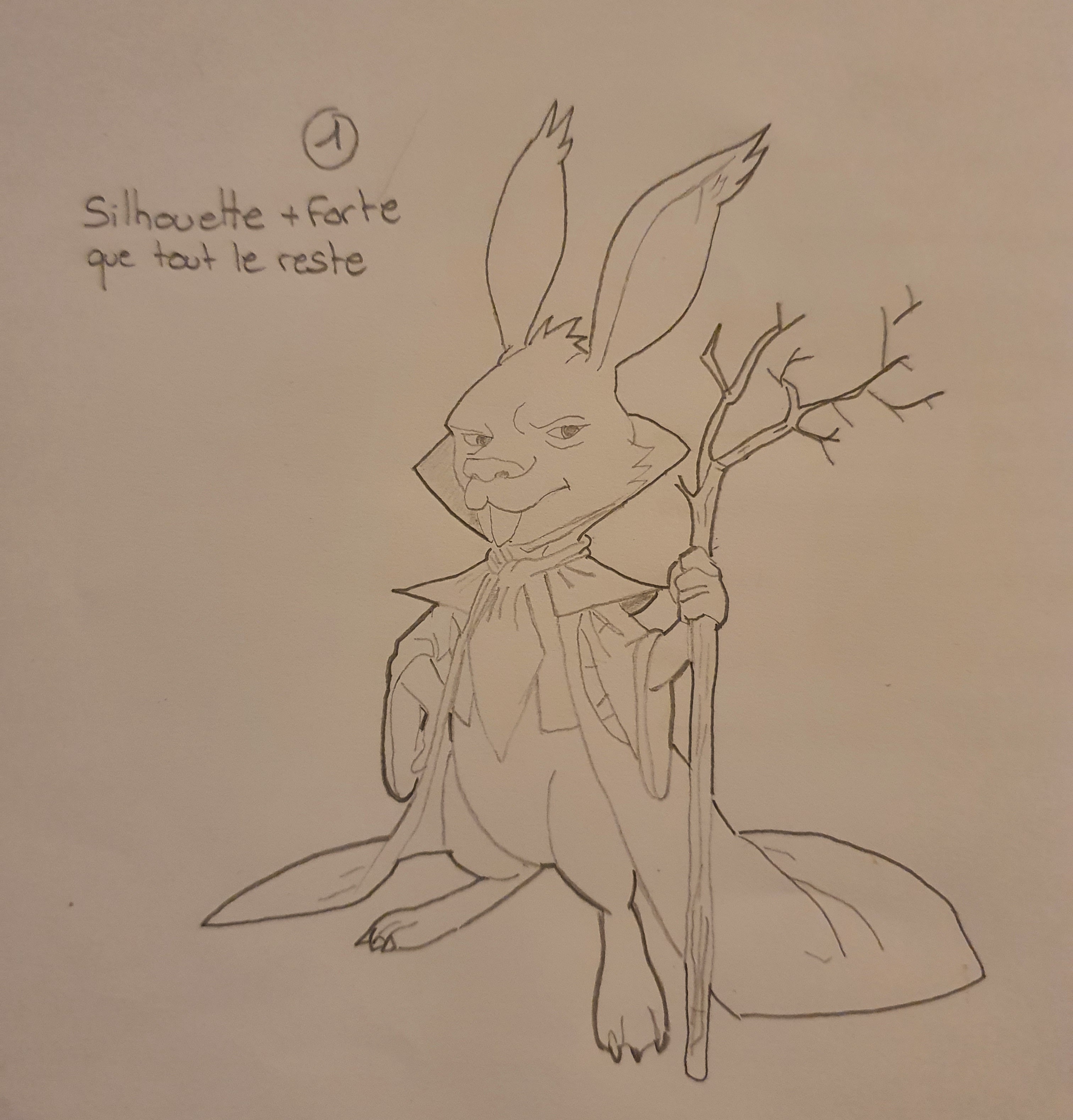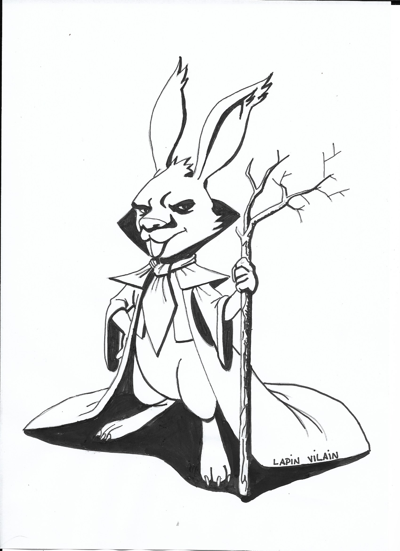 Déjà pour la silhouette c'est compris, il y a juste un bout de cape entre le bâton et la patte qui a été oublié. Je corrige les autres lapins sous chaque dessin ^^