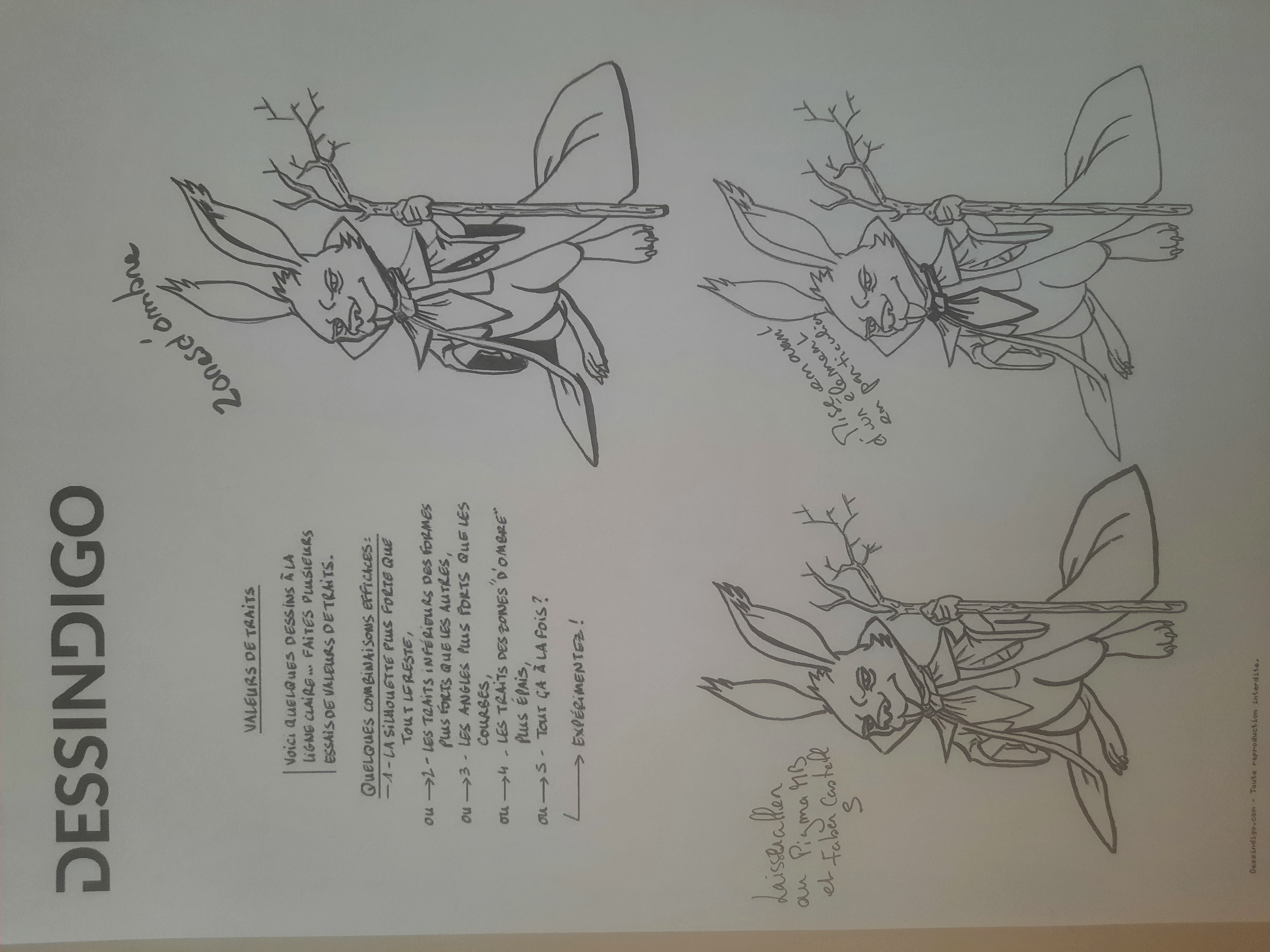 Die Silhouette wird verstanden, es gibt nur eine Vergesslichkeit, die ich auf der Zeichnung markiert habe. Für die Winkel wird es verstanden, aber es fehlt: Es muss angenommen werden, dass alle Linien von Linien Winkel bilden, und alle, die sie akzentuieren, ermöglichen mehr Homogenität. Zum letzten Mal, was die Schatten betrifft, ist das Ziel nicht nur die hohlen Bereiche, sondern an eine Lichtrichtung und die Merkmale der Bereiche, die nicht vom Licht betroffen sind, zu akzentuieren. Es ist daher nicht vollständig auf diesem Kaninchen dort verstanden. In jedem Fall ist das Prinzip der Linienwerte enthalten :)