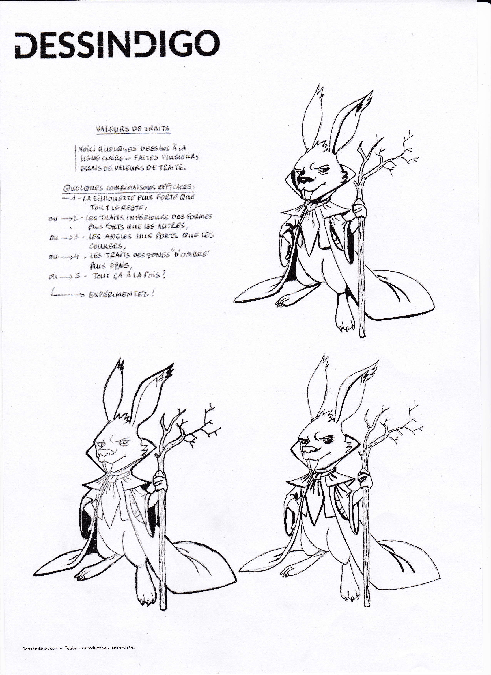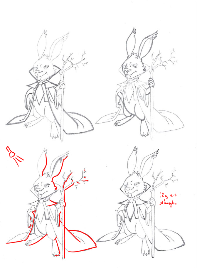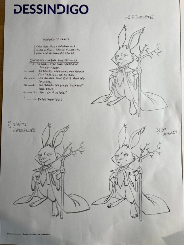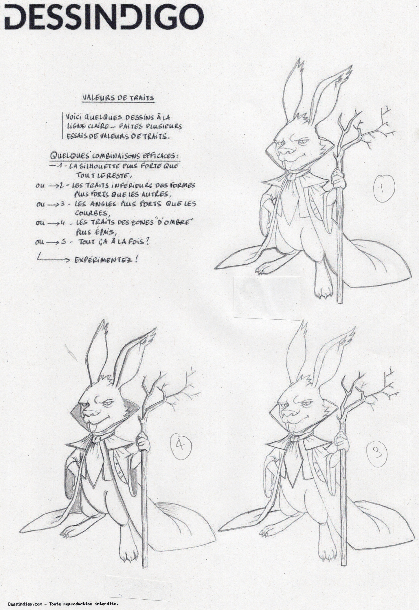Bien aussi pour celui de la silhouette. Le dernier je ne sais pas trop ce qui a été voulu donc j'ai remplacé par un mettant en valeur des ombres, vu que tu dis avoir des difficultés. J'ai établi une direction de lumière et en rouge mis ce qui doit être mis en valeur en prenant en compte cette direction. La lumière étant en haut à droite, les traits en bas et à gauche de la direction de lumière sur les différents éléments du lapin sont épaissis, n'étant pas touchés par la lumière.