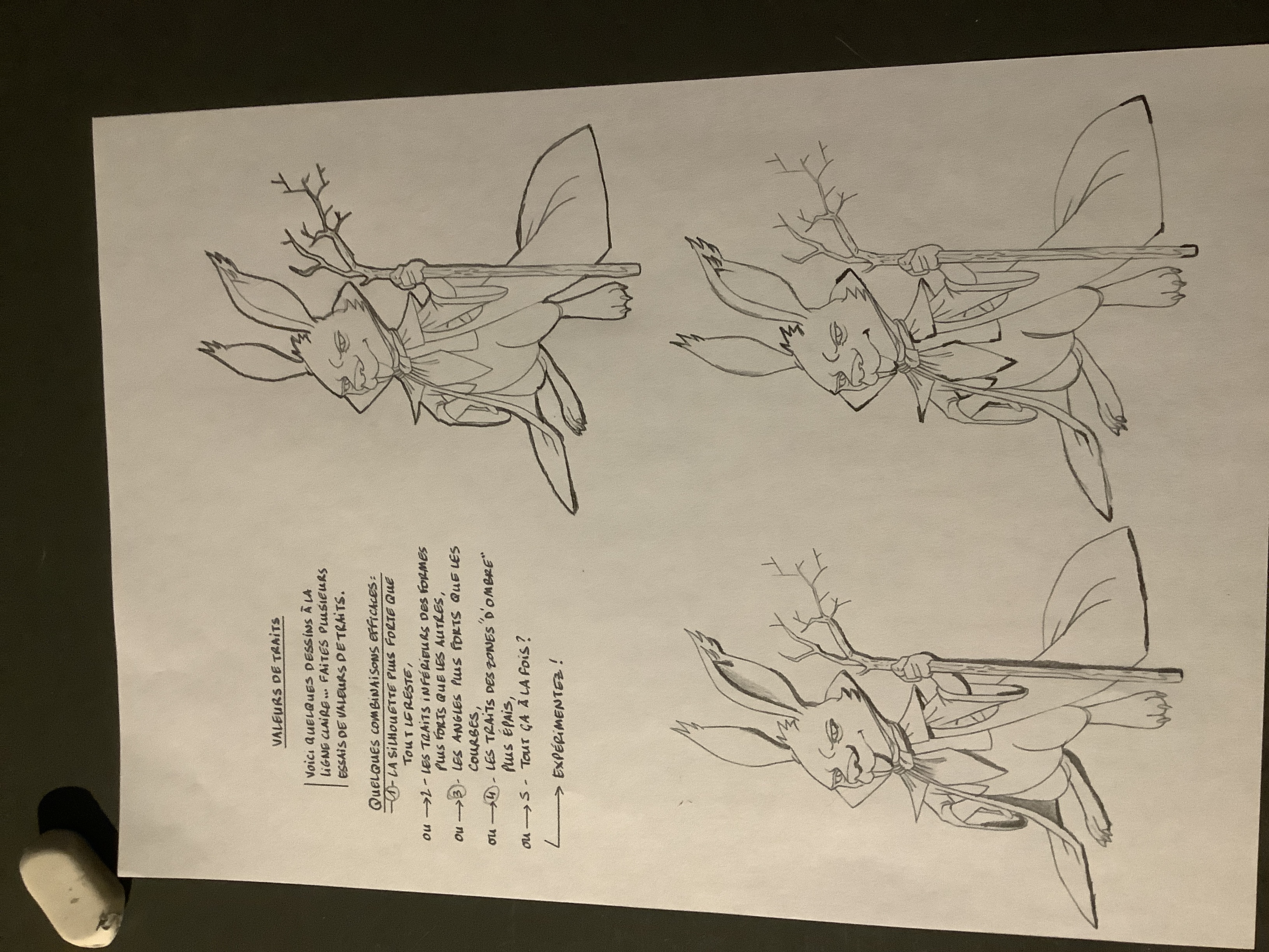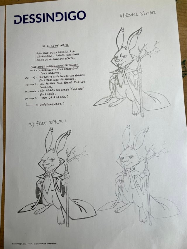 Très joli rendu pour les mises en valeur d'angles et de traits inférieurs ^^ Pour ce qui est des ombres, vu qu'on travaille sur les traits, ce ne sont pas des valeurs de gris qui sont demandées. Plutôt un épaississement des traits du côté des éléments qui seraient à l'ombre. En prenant l'exemple de celui des traits inférieurs qui pourrait être une mise en valeur d'ombre avec une lumière sur le dessus. Il faut s'imaginer ce que ça donnerait avec un autre angle de lumière 😉 Il manque aussi un lapin axé sur la mise en valeur de la silhouette extérieure. Joli travail en tous cas !
