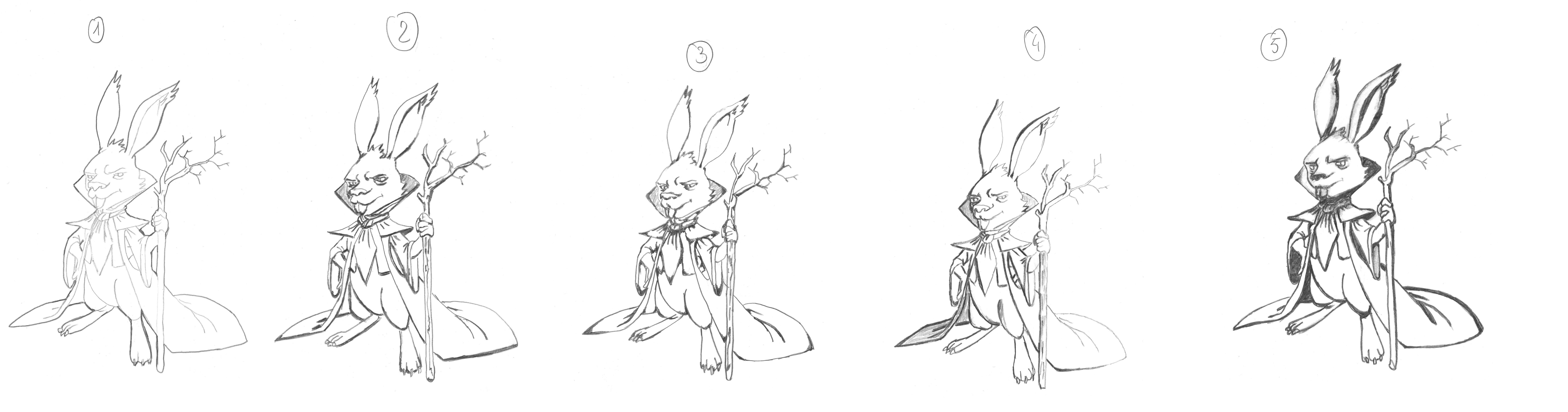 Sehr schönes Rendering für die Verbesserung von Winkeln und niedrigeren Linien ^^ Wie für Schatten, da wir an den Linien arbeiten, sind dies keine Grauwerte, die angefordert werden. Vielmehr eine Verdickung der Linien an der Seite der Elemente, die sich im Schatten befinden würden. Indem Sie das Beispiel der unteren Linien nehmen, die eine Schattenverstärkung mit einem Licht oben sein könnten. Sie müssen sich vorstellen, was es mit einem weiteren Lichtwinkel geben würde. Es fehlt auch ein Kaninchen, der sich auf die Entwicklung der äußeren Silhouette konzentriert. Gute Arbeit sowieso!