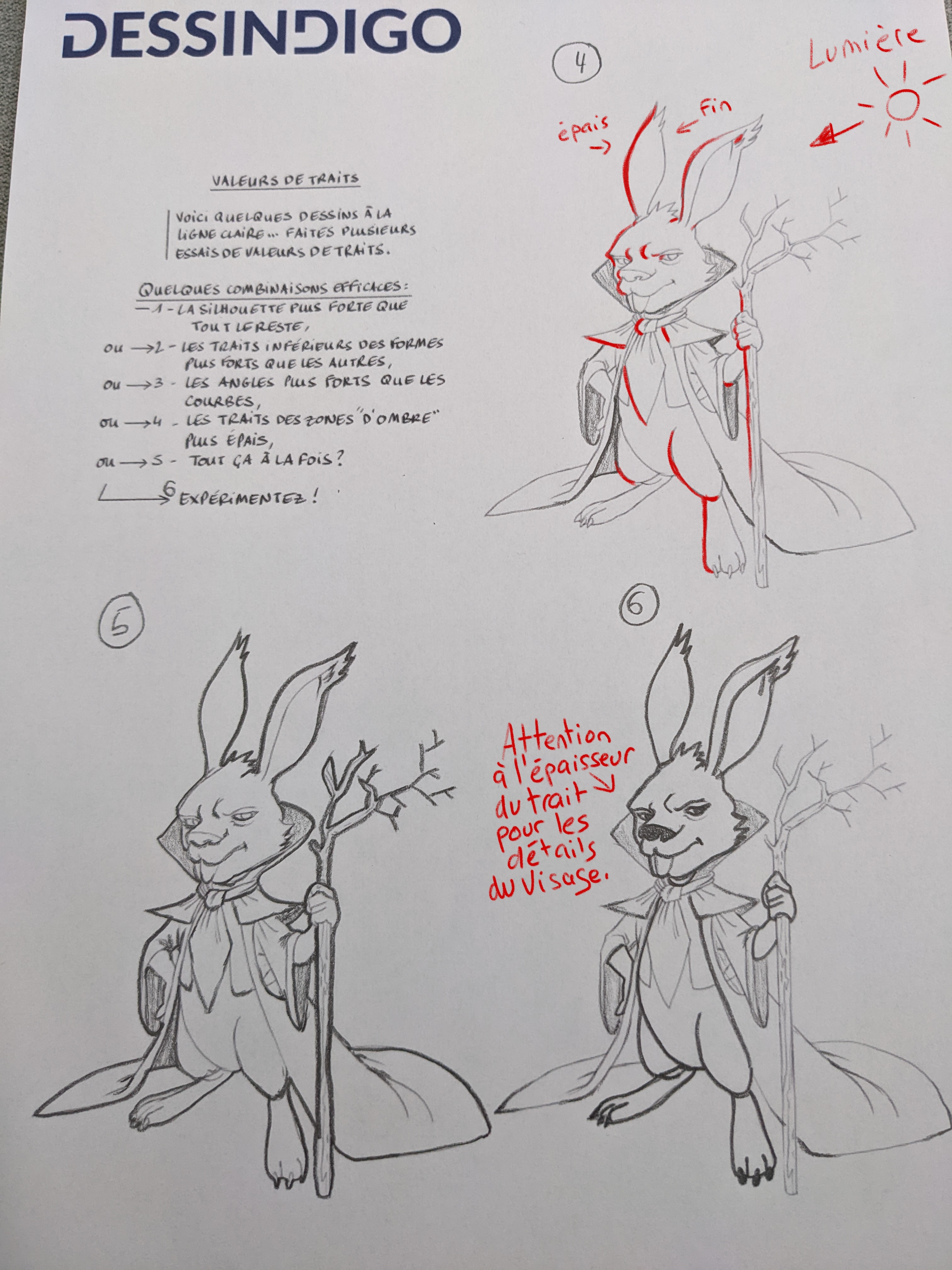 Für Übung 4 ist es eine Frage, die den Ursprung der Lichtquelle zu berücksichtigen: Der am stärksten freigelegte Teil Ihrer Linie ist feiner und der Teil im Schattenbereich ist dicker (wie in meiner Korrektur angegeben)