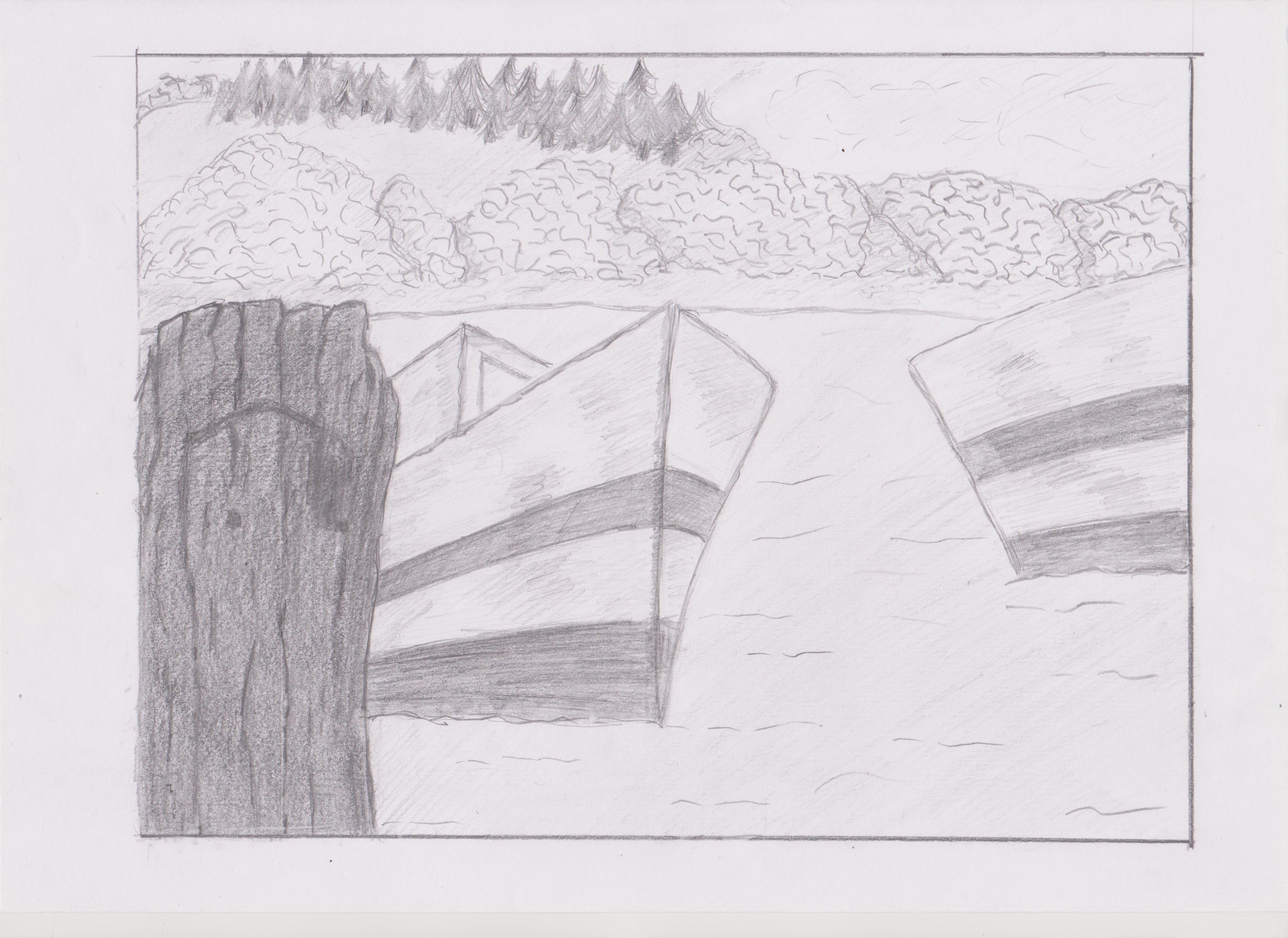 Achten Sie auch auf Ihr Schlüpfen, dort versuchen Sie, schnell auszufüllen, und plötzlich verlieren Sie die Lesbarkeit und es gibt falsche Informationen. Als ich das erste Mal, als ich mir Ihre Zeichnung ansah, verstand ich nicht, dass sich Ihr Haus auf einem Ponton befand, dachte ich, es war in einer Art von einem Zaun umgeben, weil Sie die Bretter des Pontons mit unregelmäßigen Merkmalen und dem Schatten des Pontons auf dem Wasser mit Kreuzbrichen wie einem Zaun behandelt haben. Seien Sie vorsichtig mit solchen Details, es kann buchstäblich eine ganze Zeichnung ruinieren. Zögern Sie nicht, Zeit für den Kurs für die Werte von Grau und Lichtern zu verbringen.