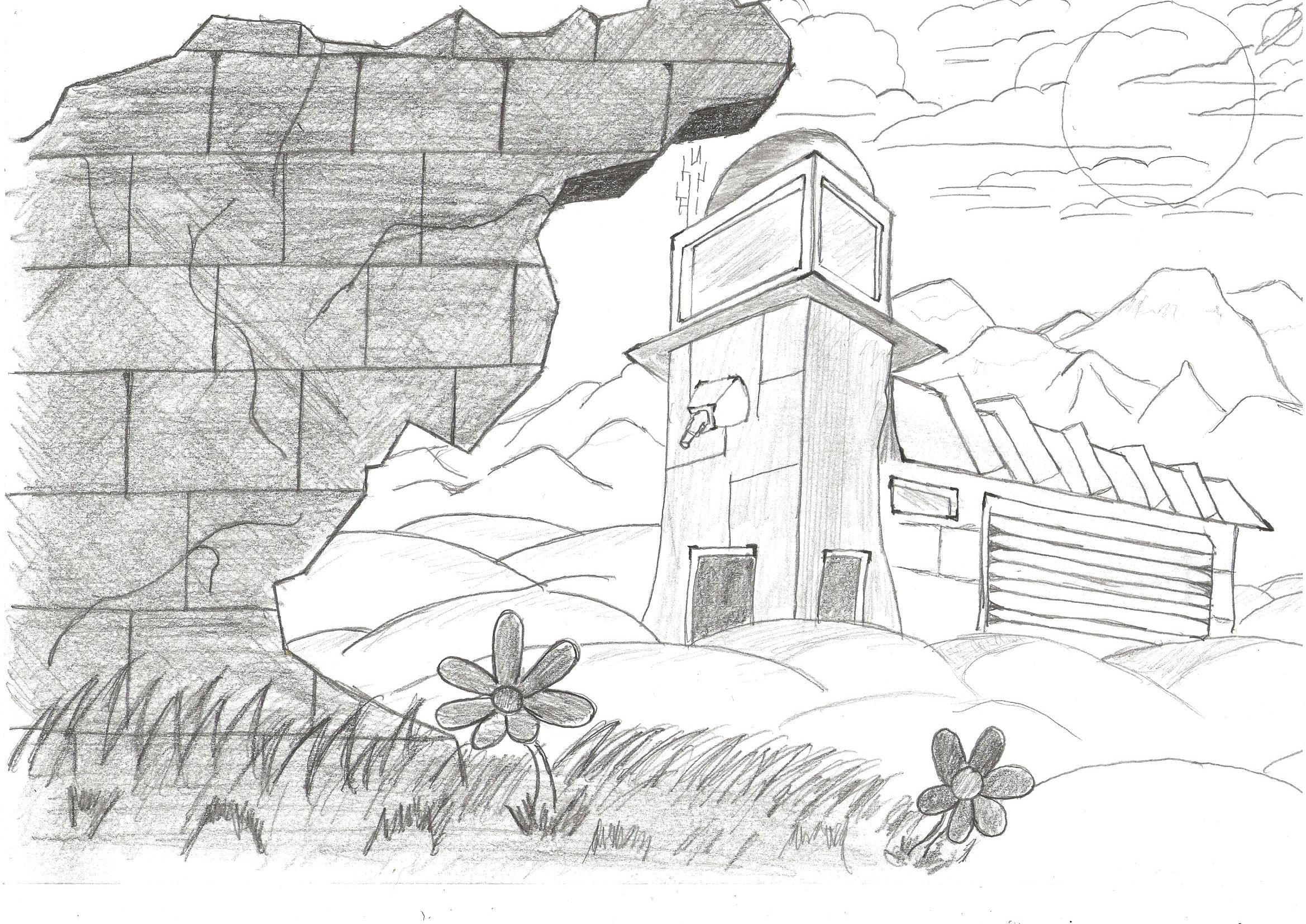 Je ne sais pas trop où on se situe, il y a pleins de petites collines plutôt régulières (on évite la régularité pour les trucs organiques, quand c'est régulier >> c'est artificiel), dépourvues d'herbes et de plantes, donc j'ai pensé à des dunes de sable. Mais au premier plan, on voit bien de l'herbe et des fleurs, du coup je ne sais pas si la zone autour du bâtiment est supposée être désertique ou si c'est un oubli de ta part et que les collines sont effectivement censées être herbeuses. Je vois bien les montagnes en arrière plan aussi, là encore régulières (à éviter aussi donc). N'hésite pas à moins appuyer sur ton crayon pour donner un effet de lointain aux montagnes ^^