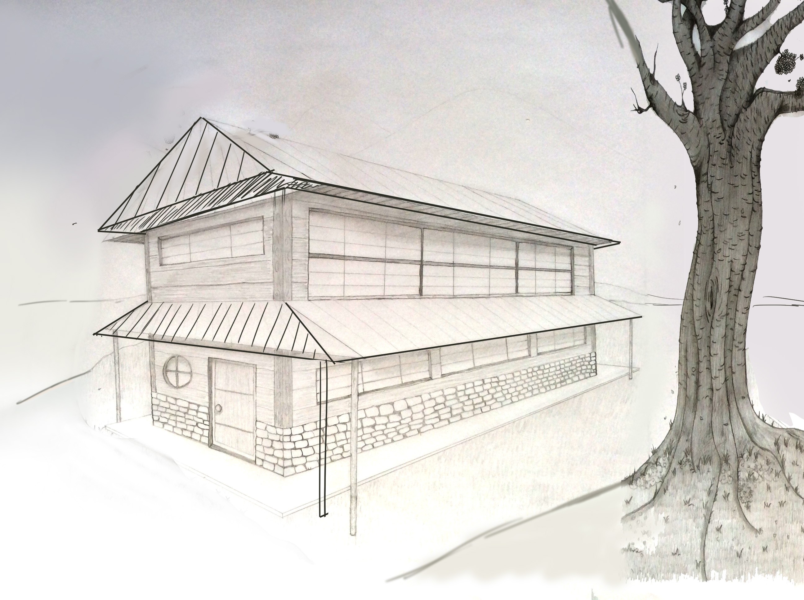 Voici mon dessin, inspiration japonaise, avec son cerisier et sa maison (un peu) traditionnelle.