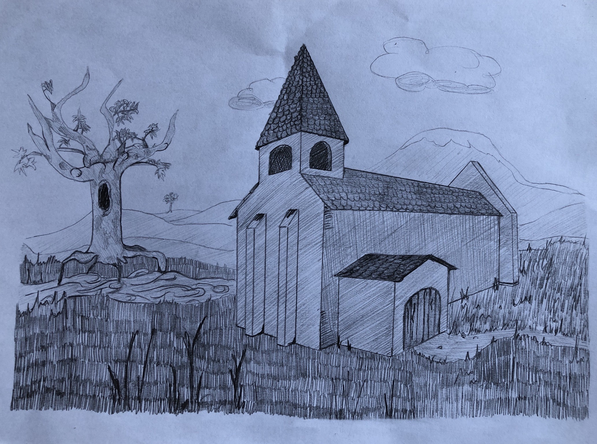 Ich bin mir nicht sicher, wo wir sind, es gibt viele kleine, eher regelmäßige Hügel (wir vermeiden Regelmäßigkeit für organische Sachen, wenn es regelmäßig ist >> es ist künstlich), ohne Kräuter und Pflanzen, also dachte ich an Sanddünen. Aber im Vordergrund können wir Gras und Blumen sehen, plötzlich weiß ich nicht, ob das Gebiet um das Gebäude Wüste sein soll oder ob es sich um eine Vergesslichkeit von Ihrer Seite handelt und dass die Hügel tatsächlich grashaft sein sollen. Ich kann die Berge auch im Hintergrund sehen, wieder regelmäßig (auch um zu vermeiden). Zögern Sie nicht, Ihren Bleistift weniger zu drücken, um den Bergen eine entfernte Wirkung zu erzielen ^^
