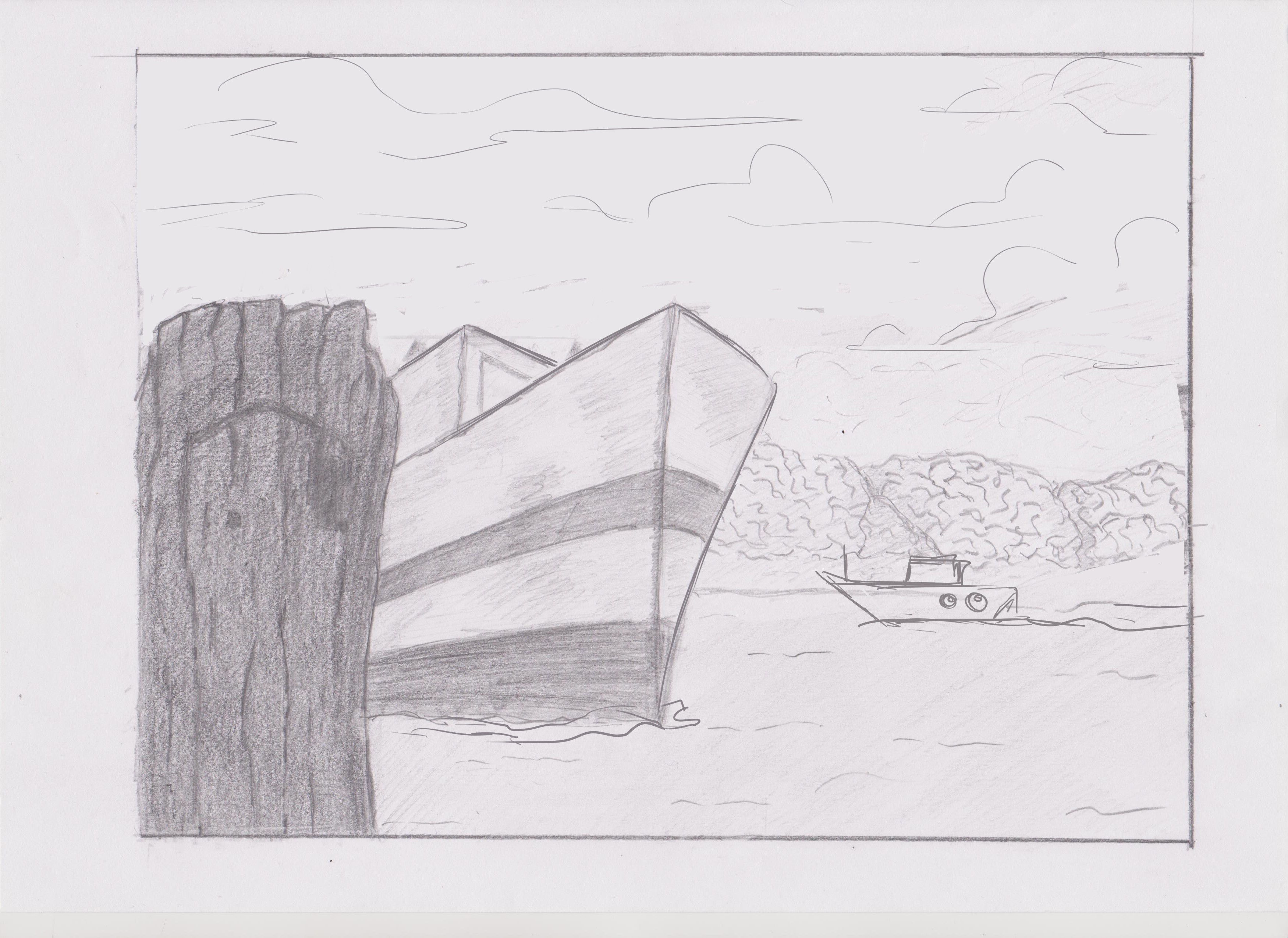 Par contre, ton arrière plan est hyper haut en comparaison de points de fuite de ton bateau, tu devrais tout baisser pour être raccord. Et le bâteau à droite, pour donner de la profondeur, je le mettrais dans le lointain en bien plus petit ^^ Je te joins un exemple rapide de modif :3