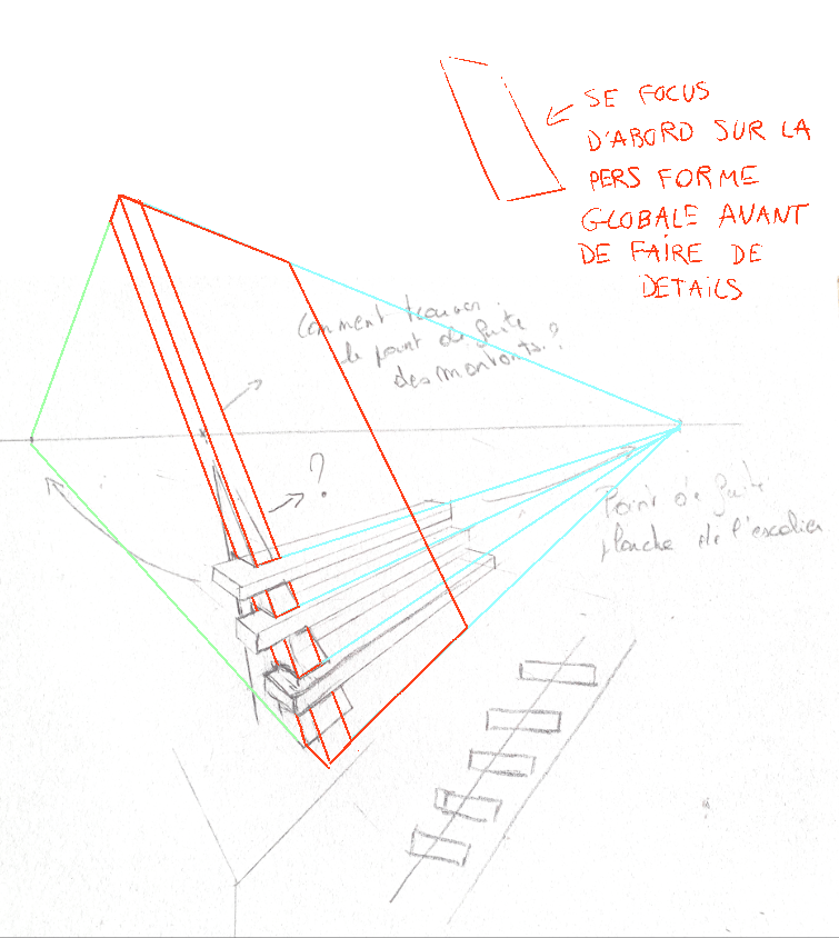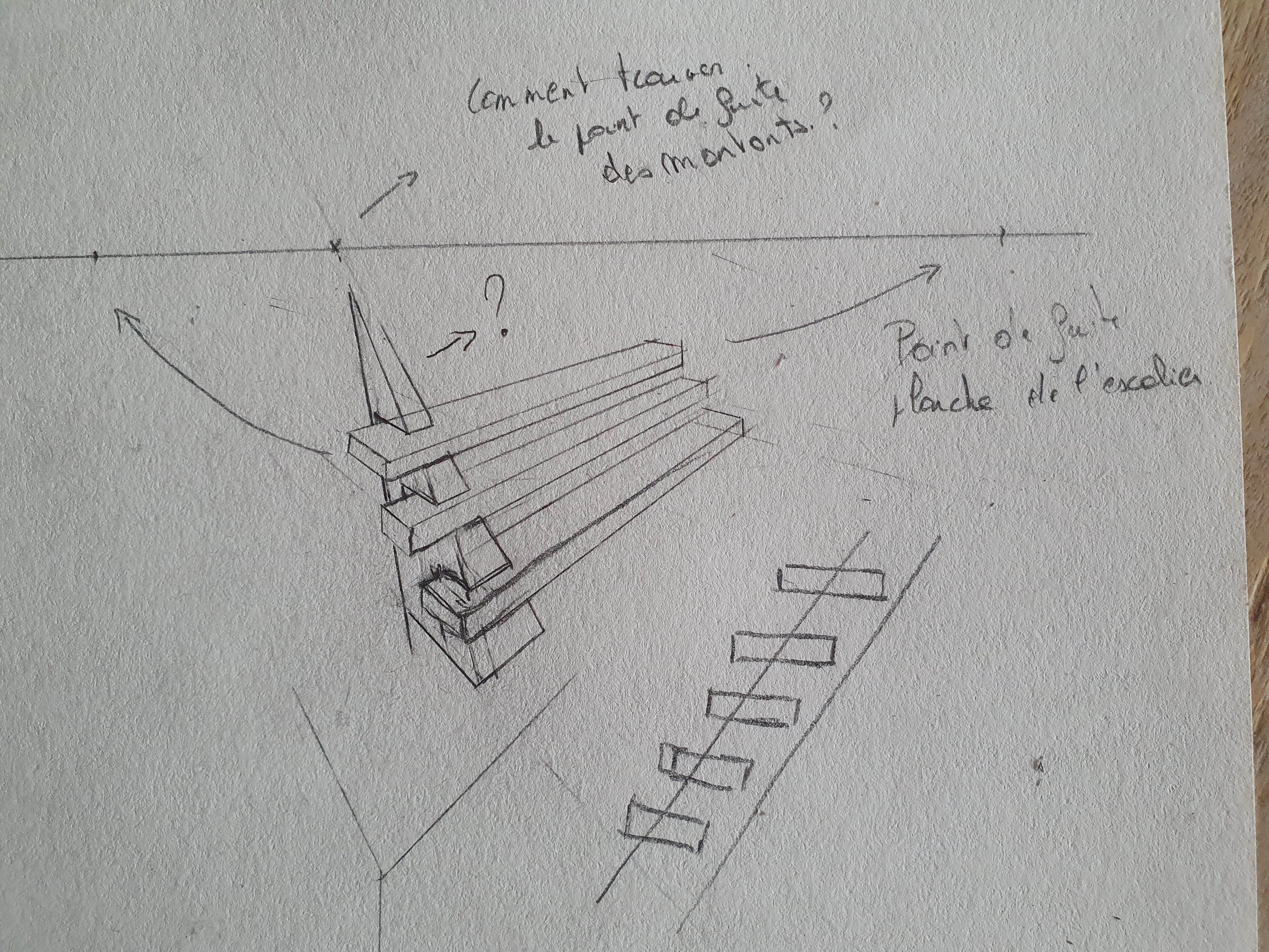 Je suis en étude pour mon dessin de comment fonctionne un escalier en bois. Mais j'ai encore un peu de mal avec les perspectives. Il s'agit de planche enchâssée dans des montant en bois latéraux. Mon problème sont les montants latéraux que je trouve bizarre. J'ai choisi un troisième point de fuite mais comment le choisir correctement?