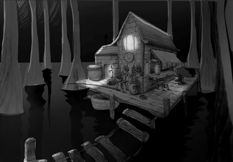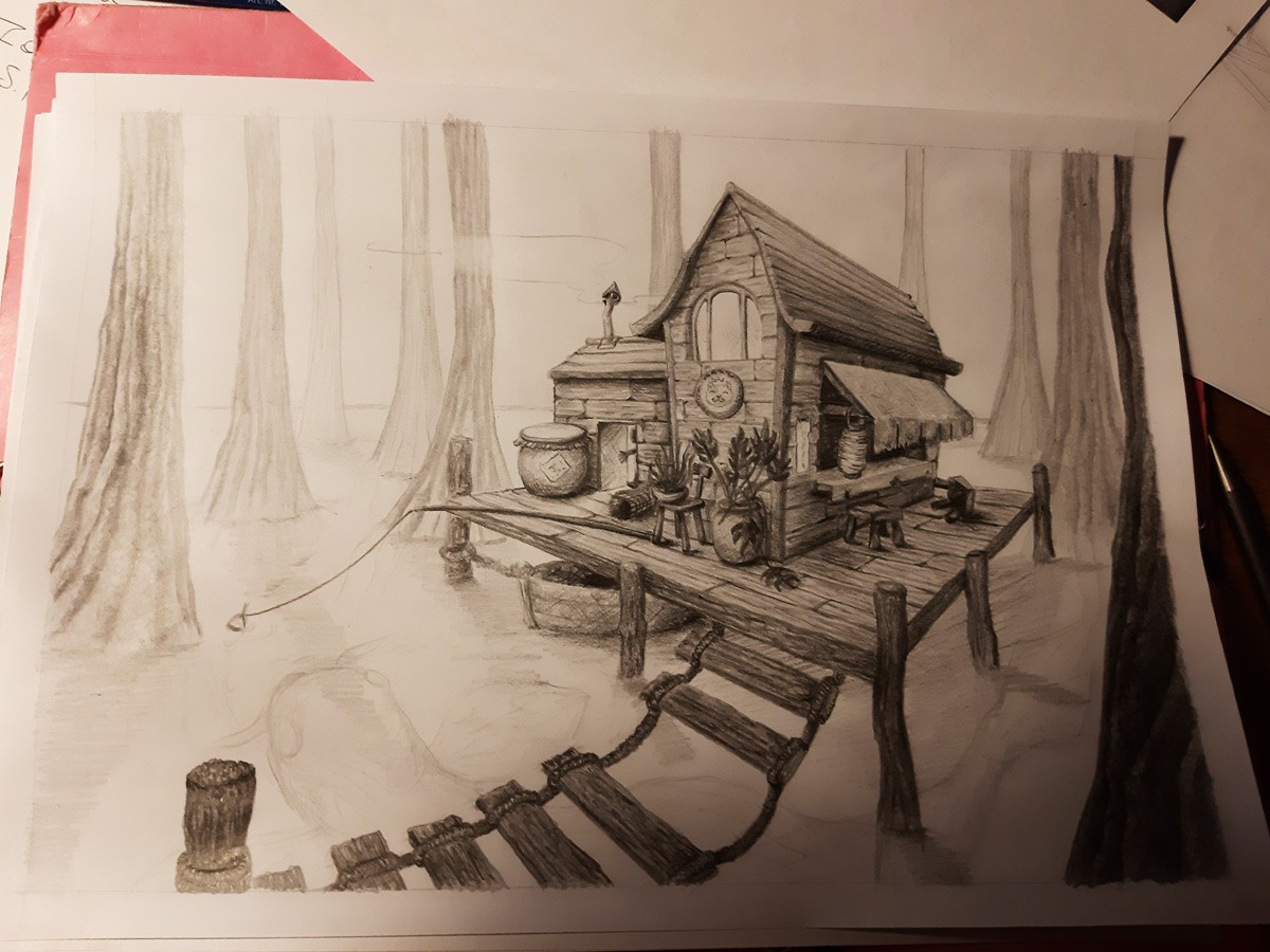 Voici mon dessin. J'ai eu beaucoup de mal à me décider pour le fond (je voulais un paysage de nuit mais je ne savais pas s'il faut dans ce cas noircir le fond) et pour l'eau (je ne savais pas comment donner l'impression que la cabane est sur l'eau au niveau des hachures). Auriez-vous quelques conseils?