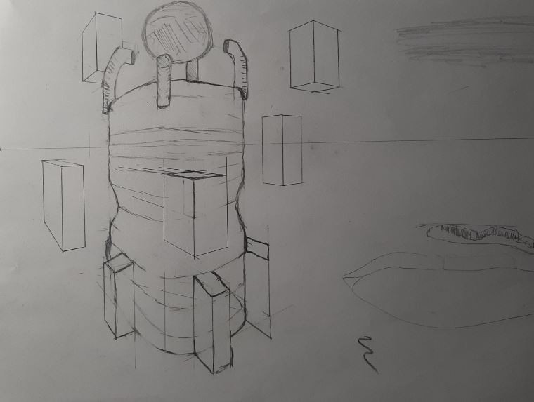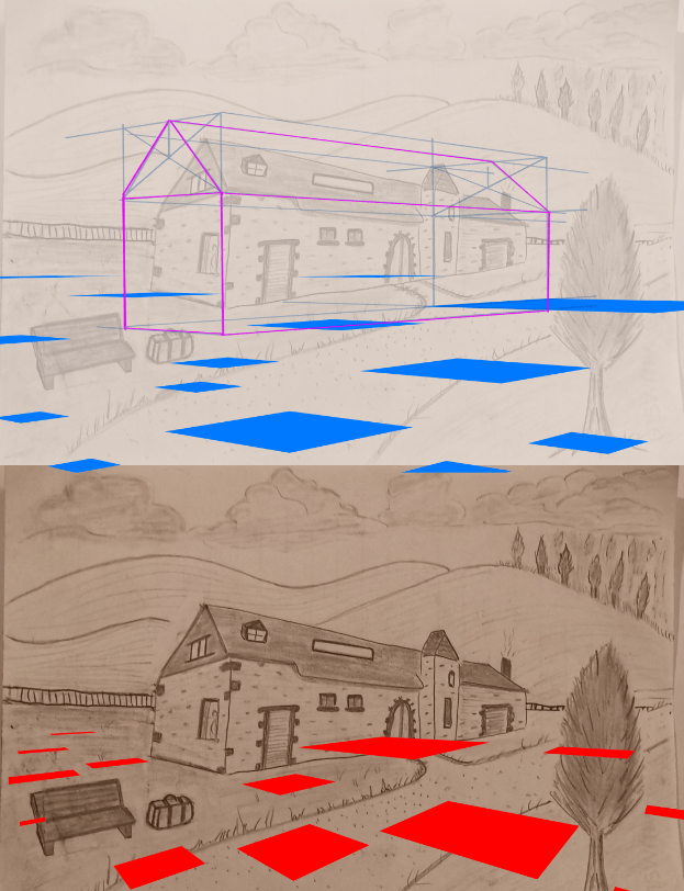 Ensuite, je suis passer sur la feuille et j'ai commencé le travail de perspective avec la ligne d'horizon et deux points de fuite etc etc...