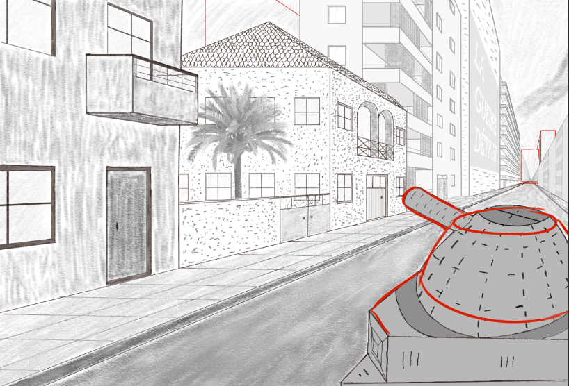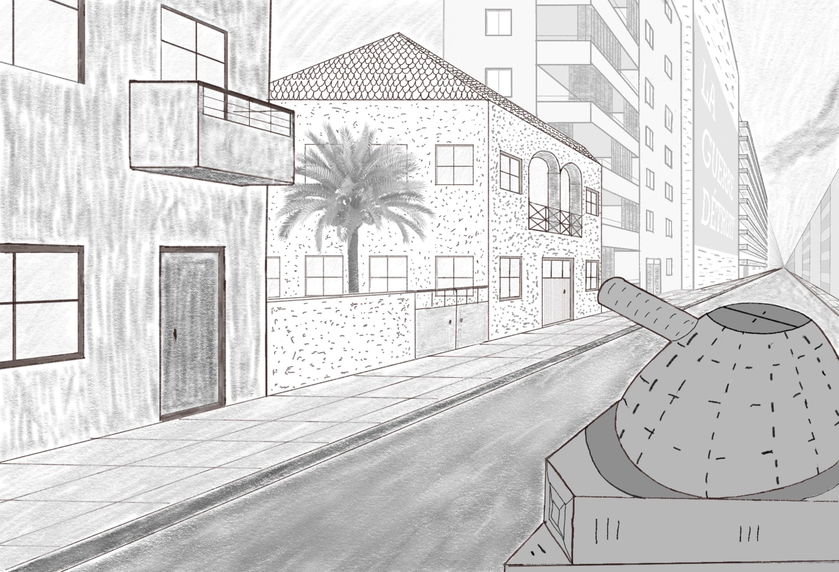 Au niveau de la zone du point de fuite, dis toi qu'il est improbable que la rue s'étende à perte de vue de la sorte, à priori il y aura bien un moment où il y aura un virage avec des immeubles derrière... tu peux donc dessiner un/des immeubles qui cache le point de fuite. C'est beaucoup plus naturel.