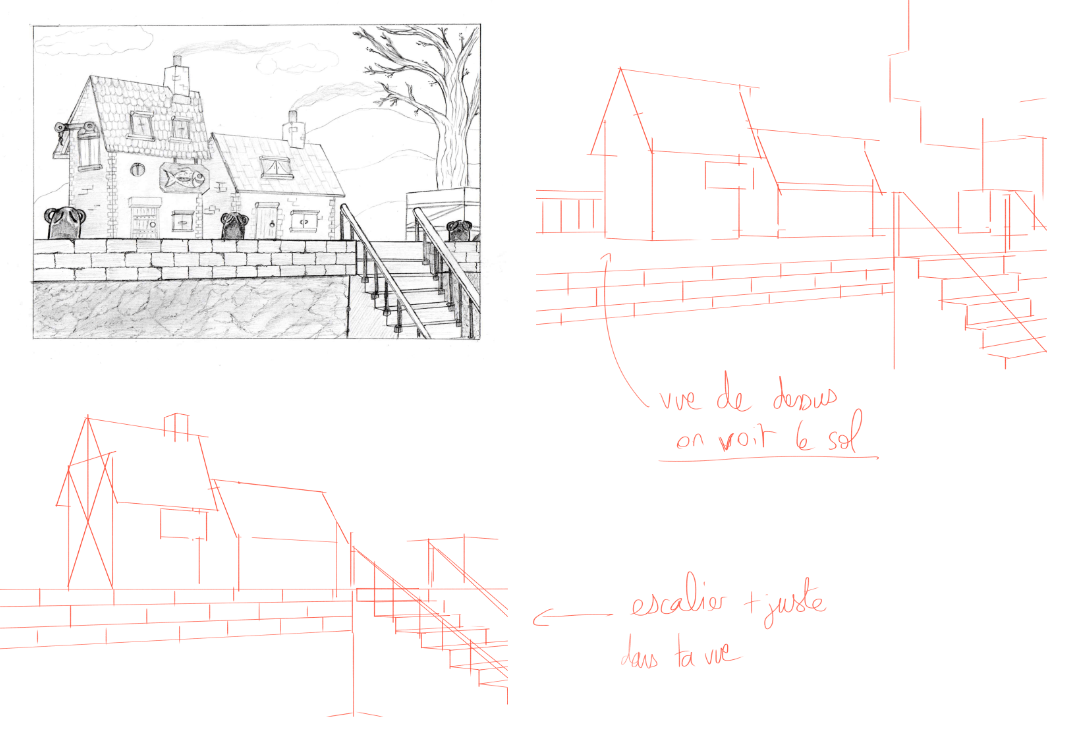 Um zu sehen, dass ich versucht habe, mich auf Ihren Pers zu lindern (unten in meiner beigefügten Datei), um dasselbe zu wiederholen, indem ich die Horizont -Linie hinaufstieg, damit wir den Boden (rechts auf meiner Datei) sehen, ist es lustig, weil die Treppe der Ansicht mehr von oben mehr aussieht wie die, die Sie gemacht haben. Ich finde, dass die Szene in dieser Ansicht klarer und verständlich ist (die Tatsache, dass die niedrige Wand mehr oder weniger der Horizontlinie entspricht, stört ein wenig Lesart der Bildtiefe).
