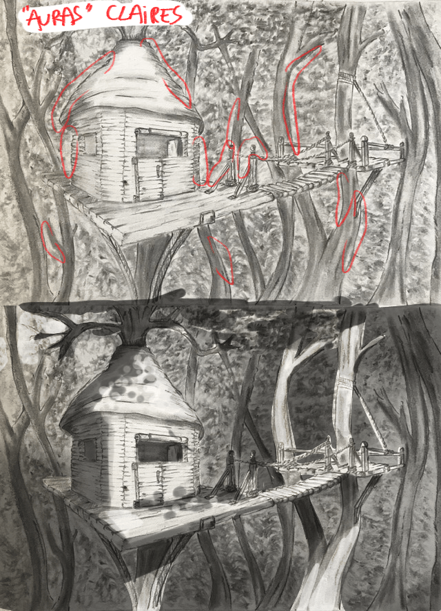 Ein Teil des Anliegens ergibt sich aus der Verwendung der Verschwörung (ich stelle mir vor, dass Sie eine Sicht auf das Rendering verwenden), was ein schönes Werkzeug ist, das aber leicht verwendet werden kann. In diesem Fall haben Sie eine klare Aura in vielen Ihrer Elemente, da Sie Ihre Werte nicht bis zum Ende jedes Bereichs drücken und die Lesbarkeit des Bildes vollständig verwischt (insbesondere auf der Miniatur). Der andere Grund ist, dass Sie keine offene Beleuchtung haben. Ihre Werte basieren hauptsächlich auf den "in sich selbst" -Werten der Elemente (z. B. Ihre Stämme sind dunkel) und das "modellierte" Elemente, das das Volumen jedes Teils zeigt ... ohne an eine globale Beleuchtung zu denken. Ich habe Sie ein wenig bearbeiten, in der Hoffnung, dass Sie verstehen, wie ein Studium der Werte und Schatten für die Komposition und Lesbarkeit einer Zeichnung wichtig ist ^^